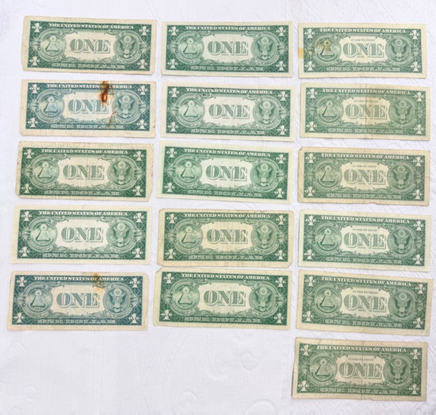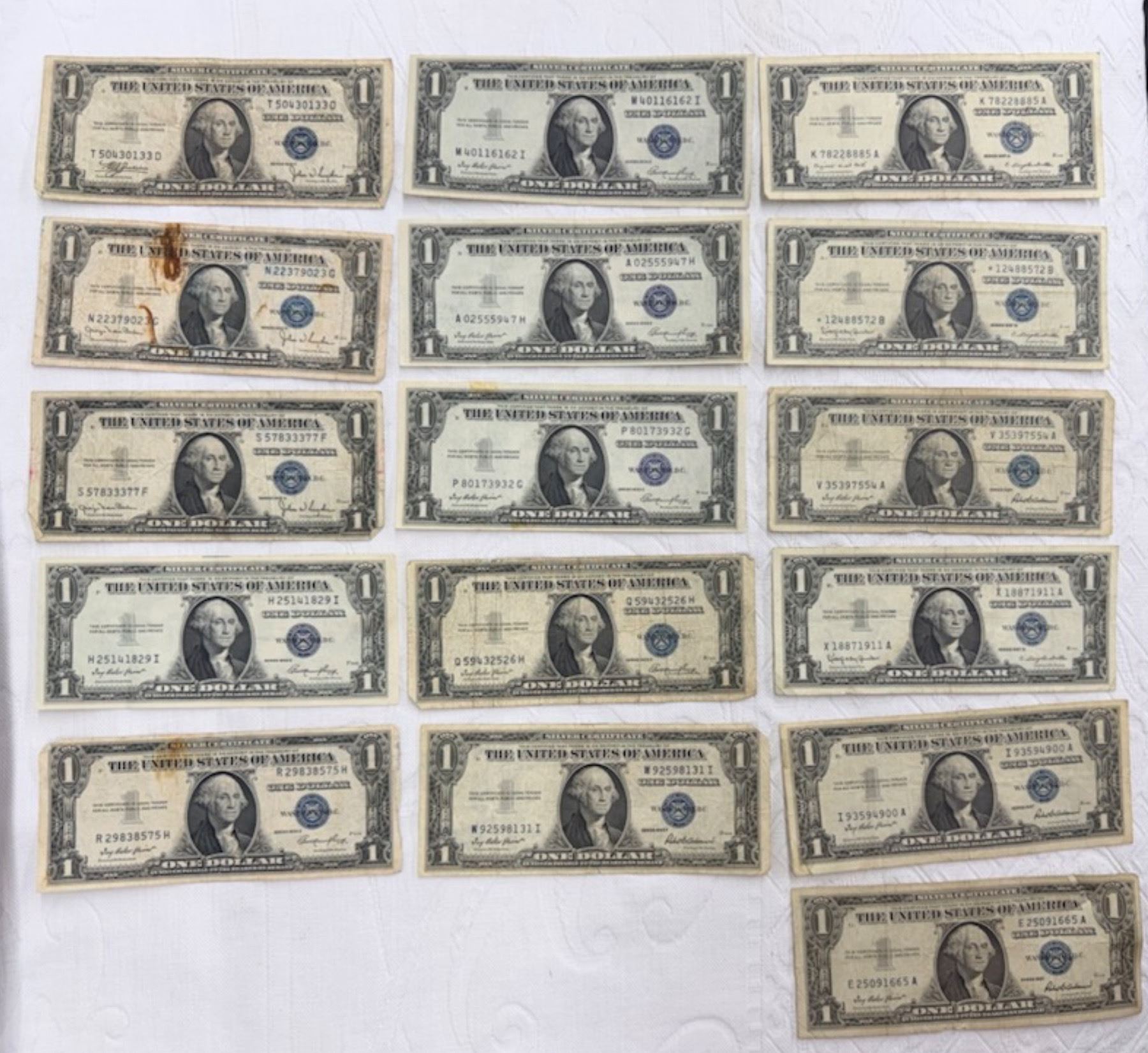 $1 SILVER CERTIFICATES - MULTIPLE SERIES - LOT OF 16; IF YOU WANT TO GET THE WHOLE ALPHABET OF SILVER CERTIFICATE SERIAL NUMBERS, THIS IS THE LOT FOR YOU! I STAR, A, E, H, I, K, M, N, P, Q, R, S, T, V, W, X,