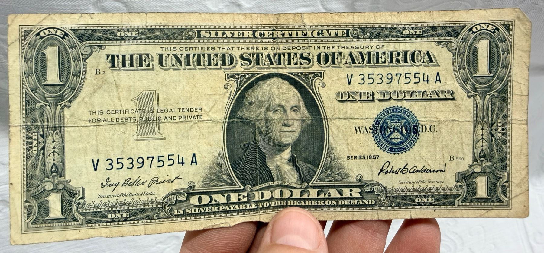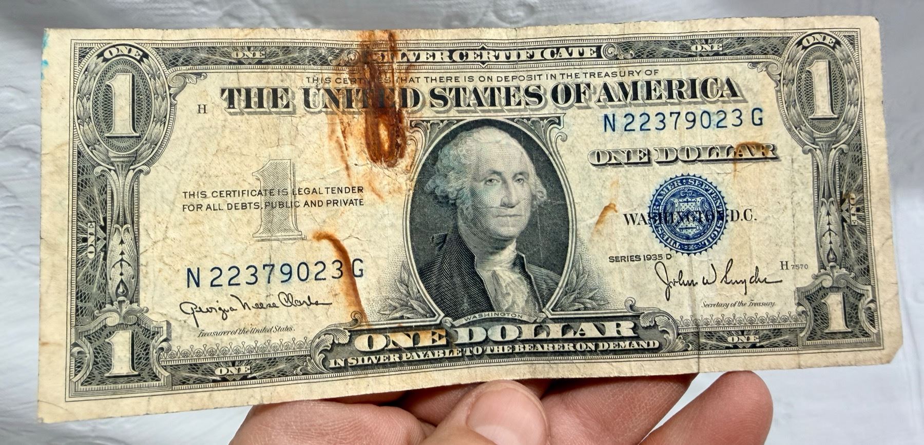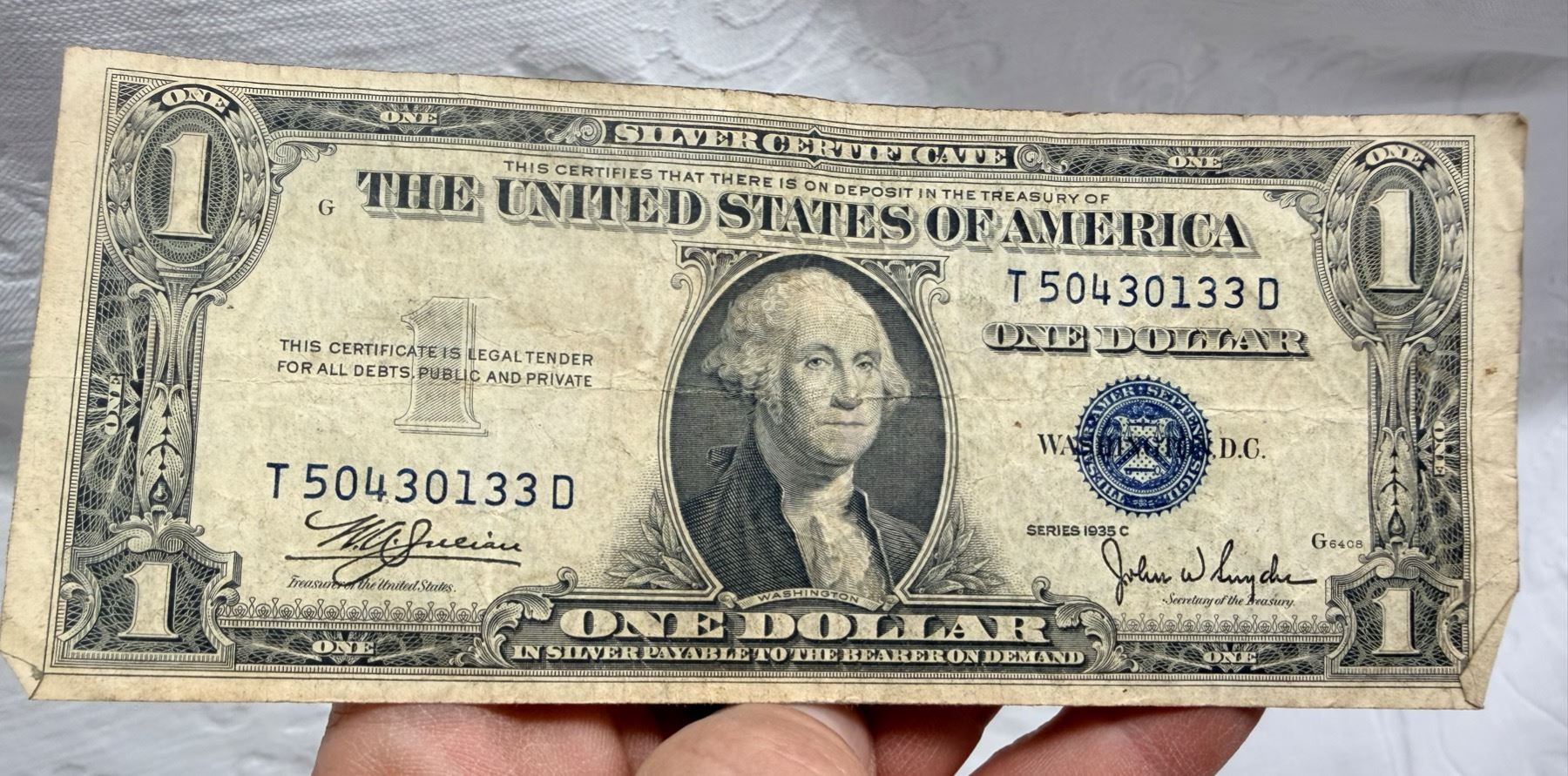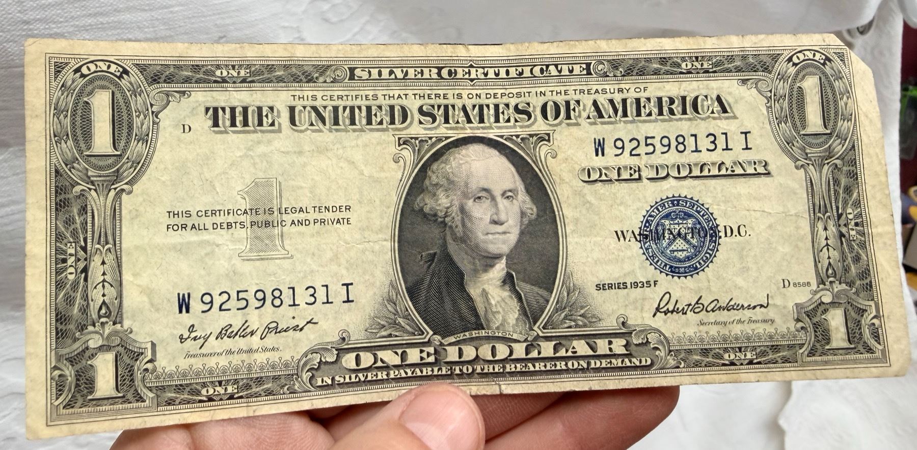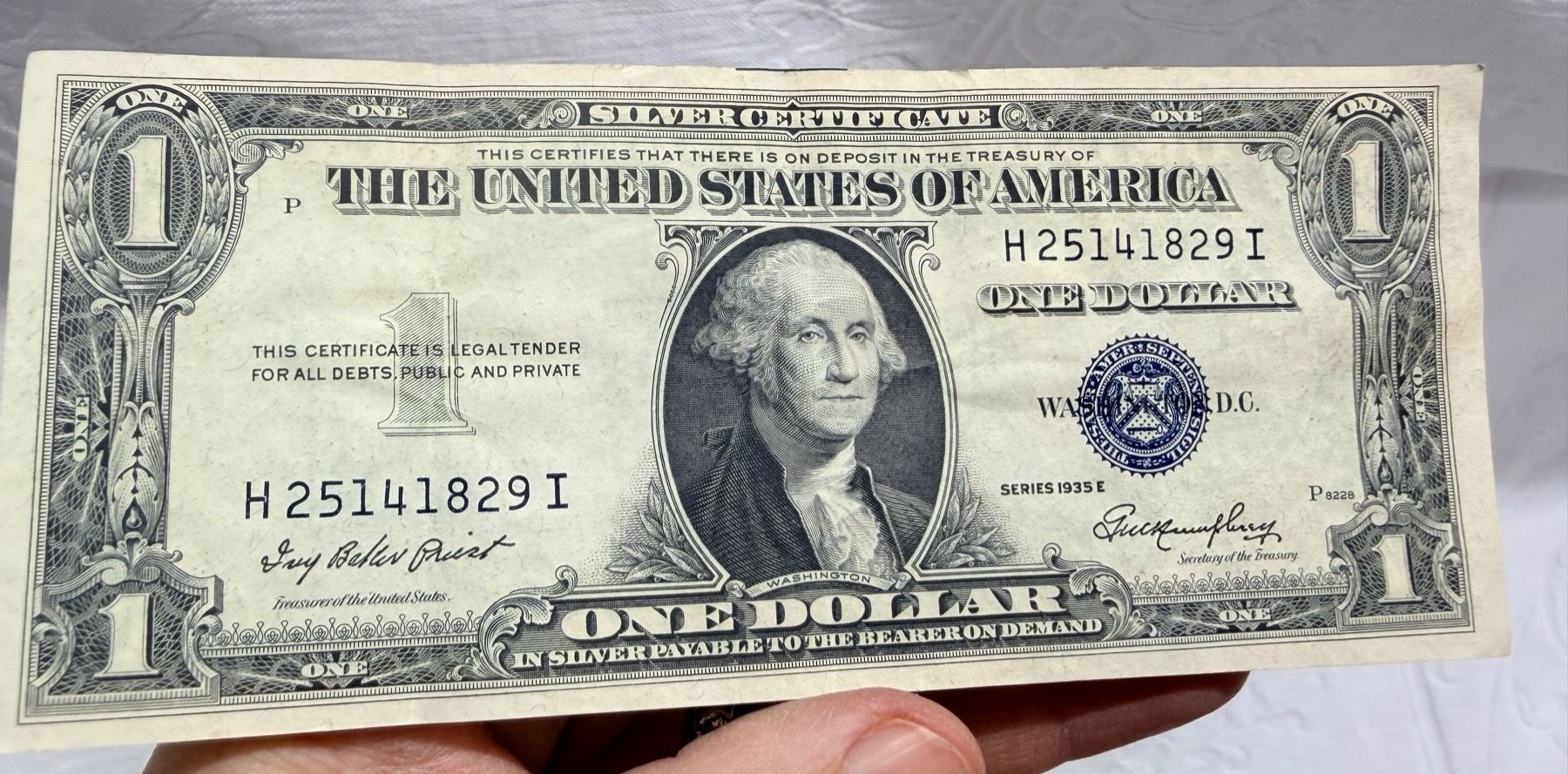 EACH SILVER CERTIFICATE WAS BACKED BY ITS FACE VALUE IN SILVER DOLLARS OR SILVER BULLION IN THE UNITED STATES TREASURY, AND HOLDERS OF THE NOTES COULD ACTUALLY EXCHANGE THEM FOR THE SILVER UNTIL 1968. SILVER CERTIFICATES HAVE DISTINCTIVE BLUE TREASURY SEALS AND BLUE SERIAL NUMBERS.