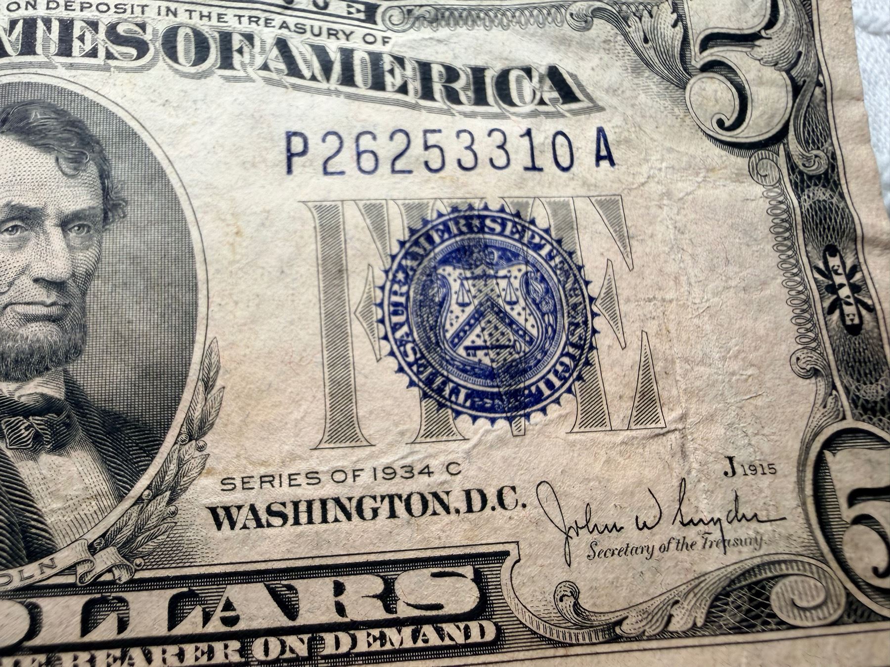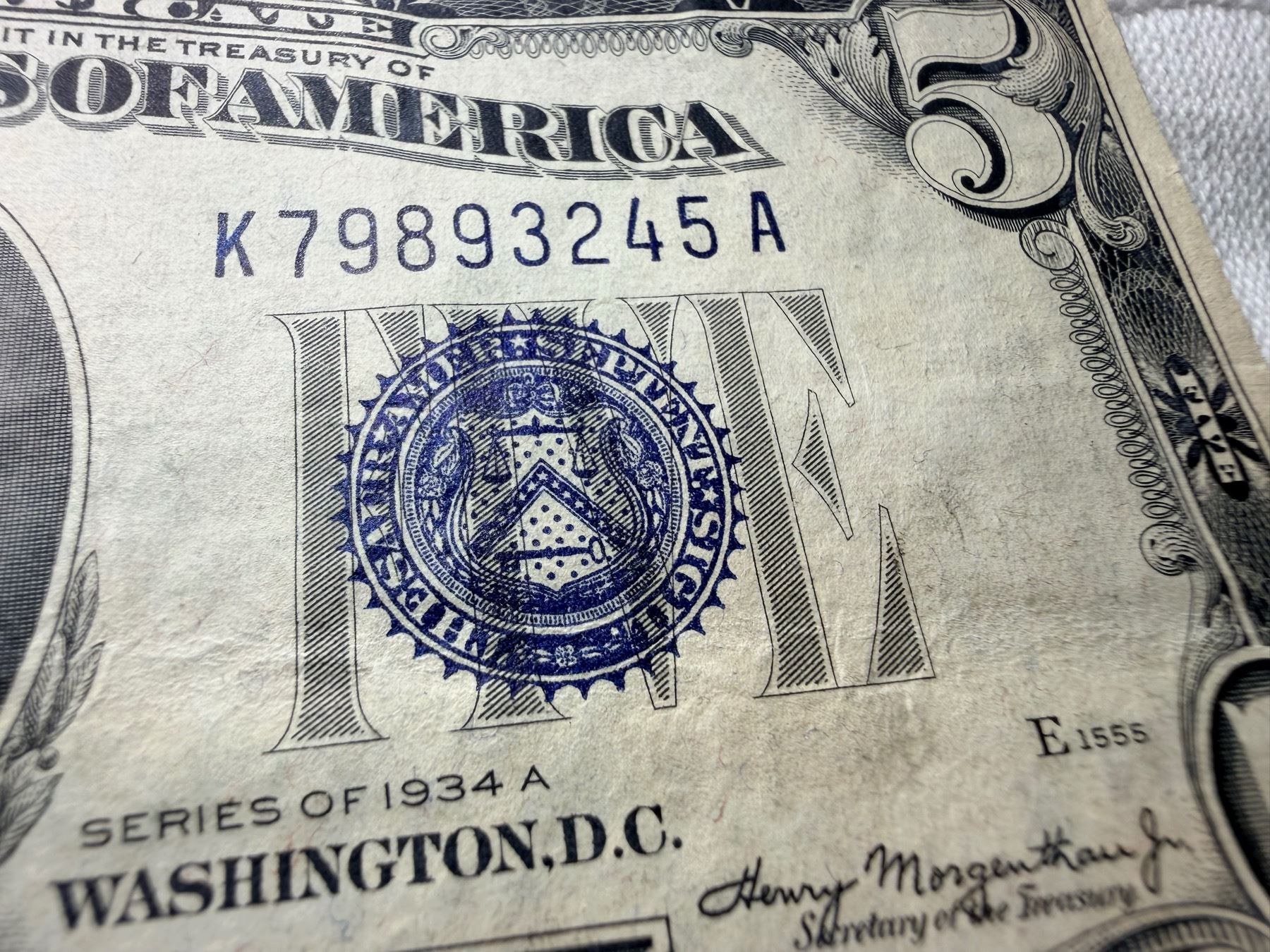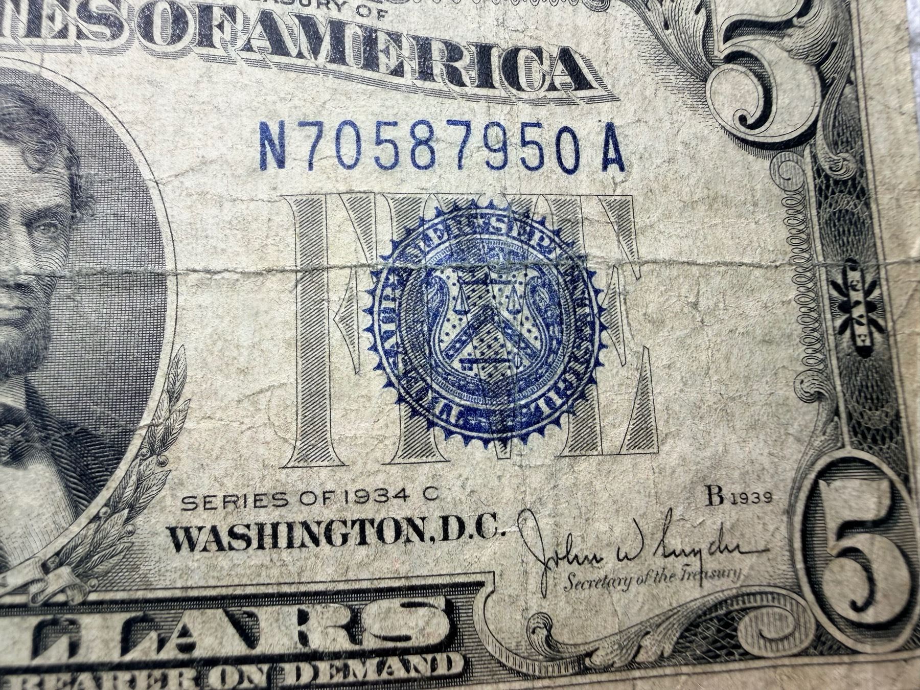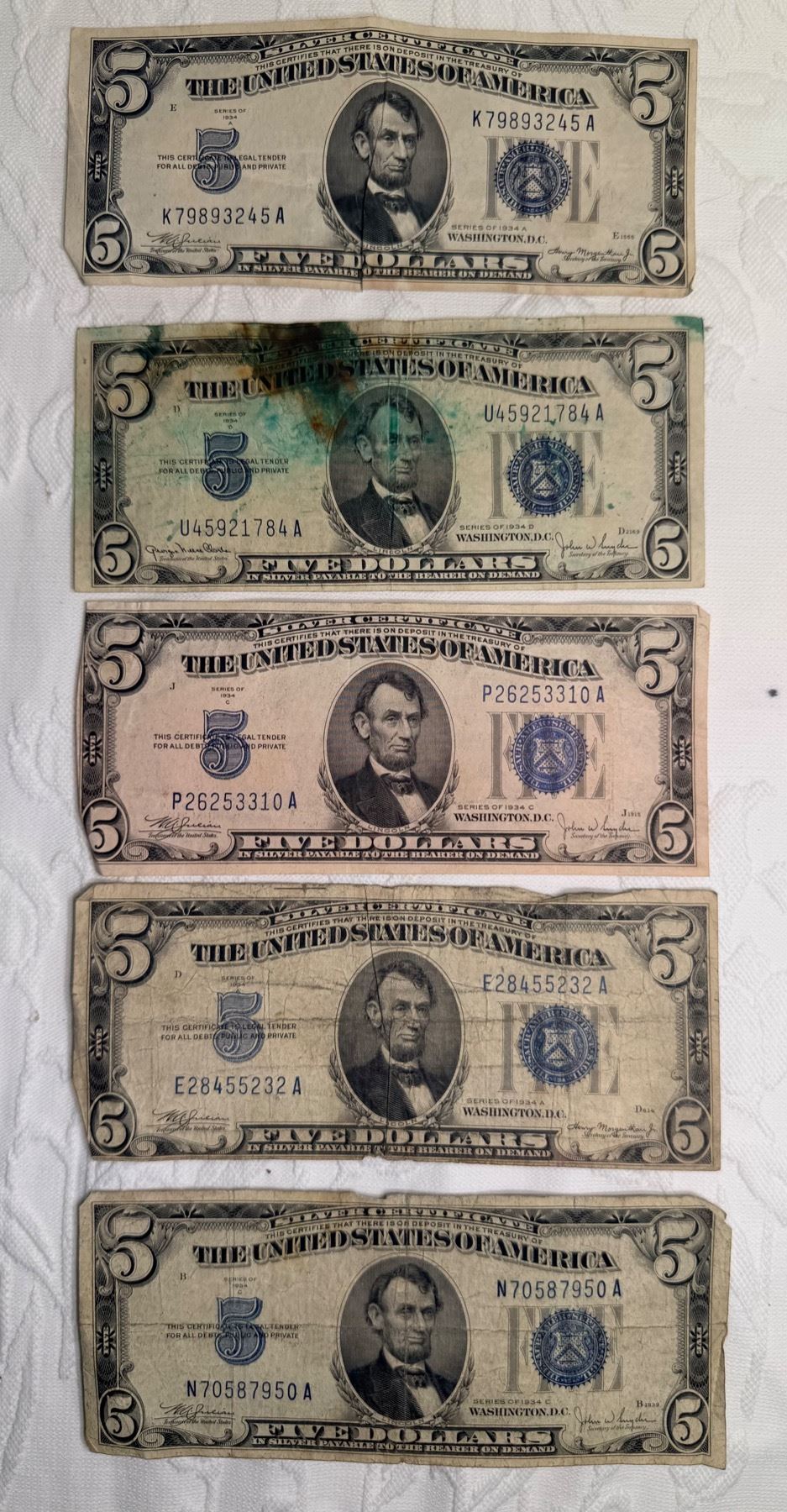 $5 SILVER CERTIFICATES - SERIES 1934A, 1934C, 1934D; BLUE TREASURY SEAL AND SERIAL NUMBERS AND BLUE 5 - LOT OF 5