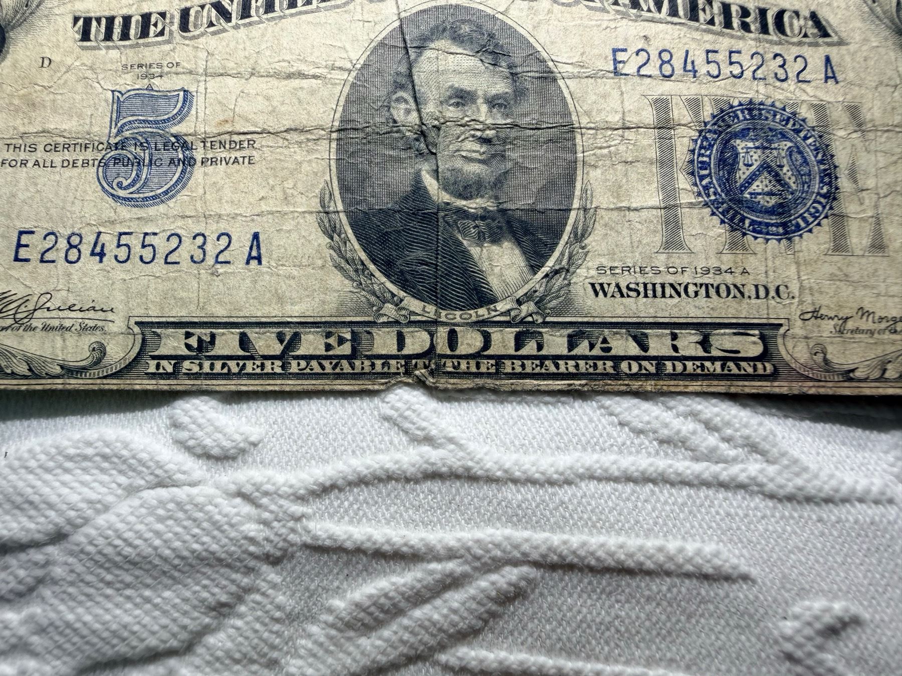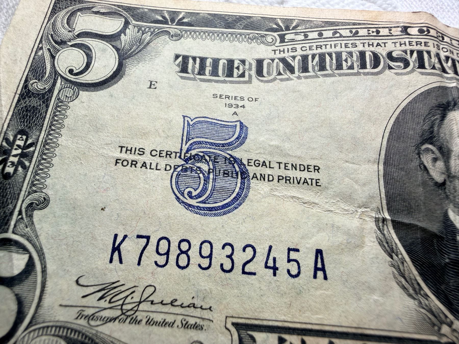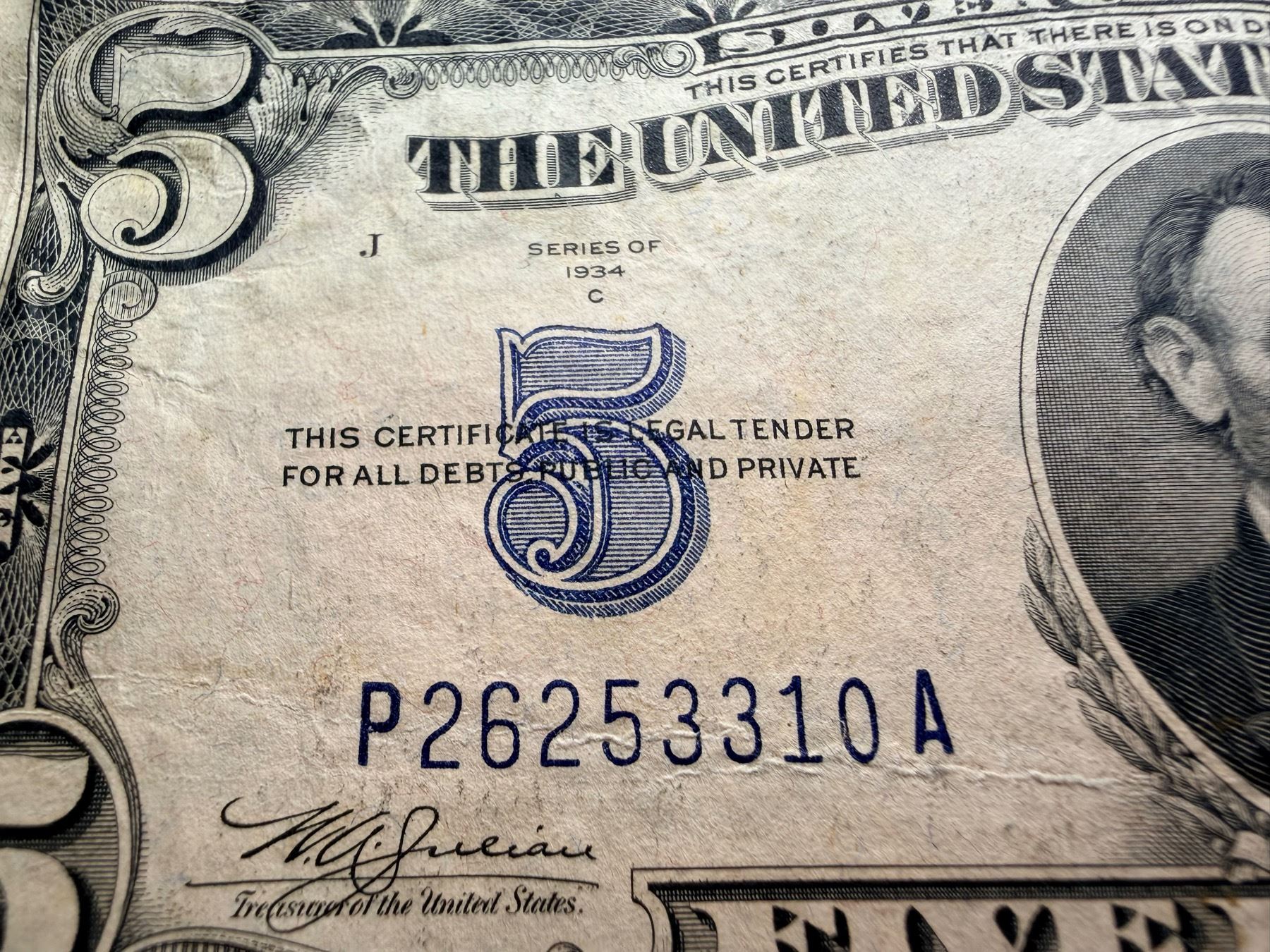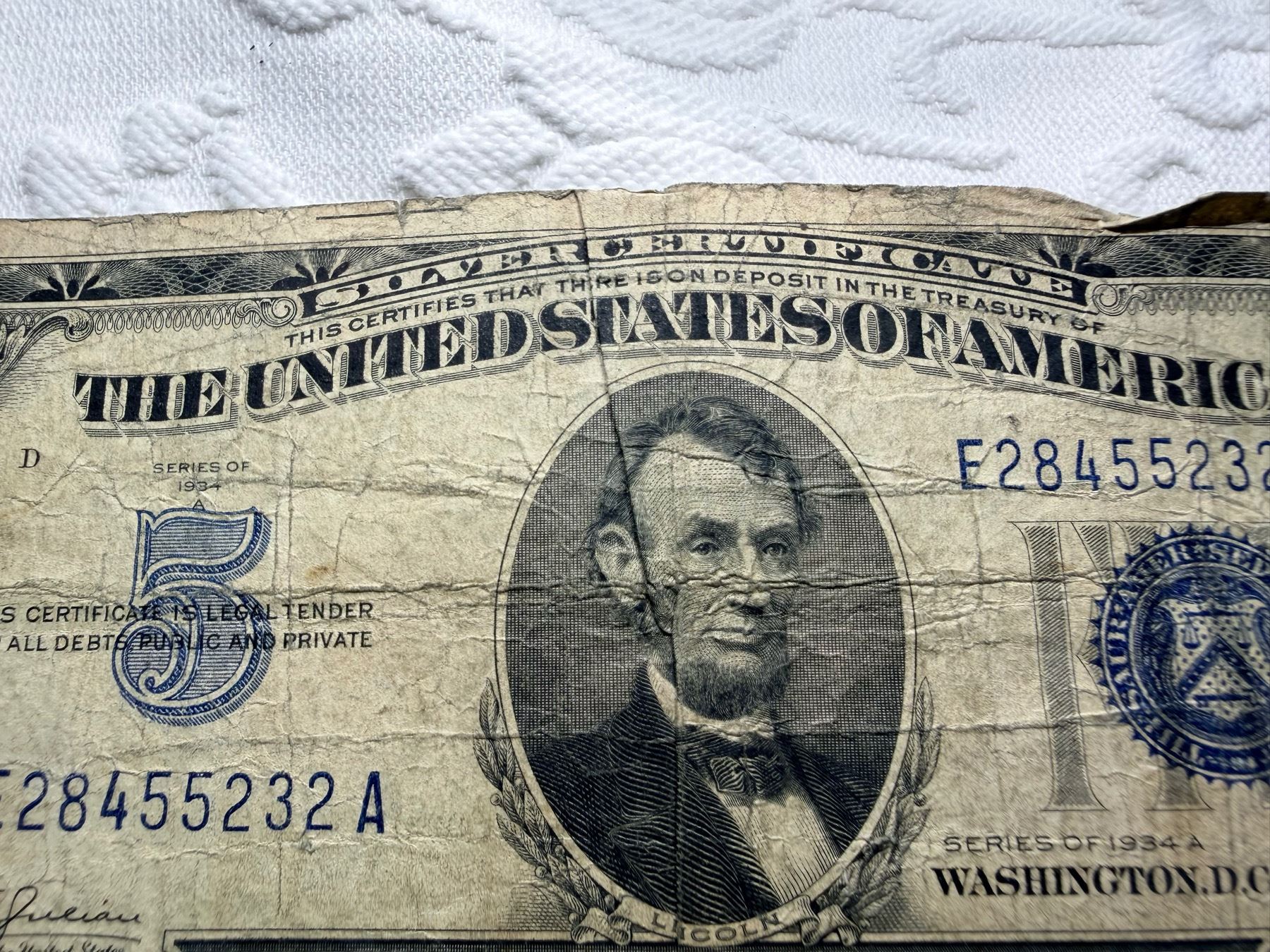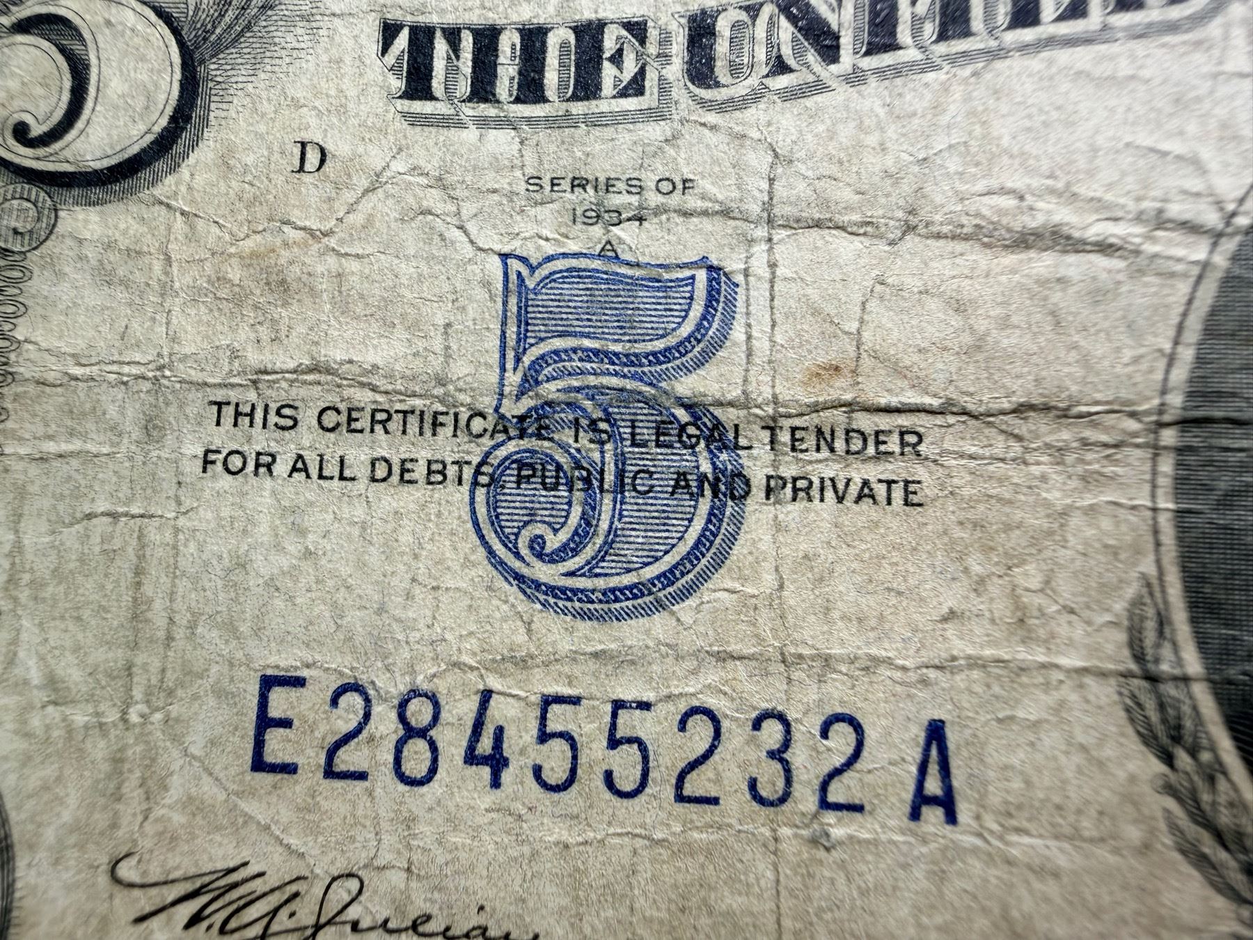 $5 SILVER CERTIFICATES - SERIES 1934A, 1934C, 1934D; BLUE TREASURY SEAL AND SERIAL NUMBERS AND BLUE 5 - LOT OF 5