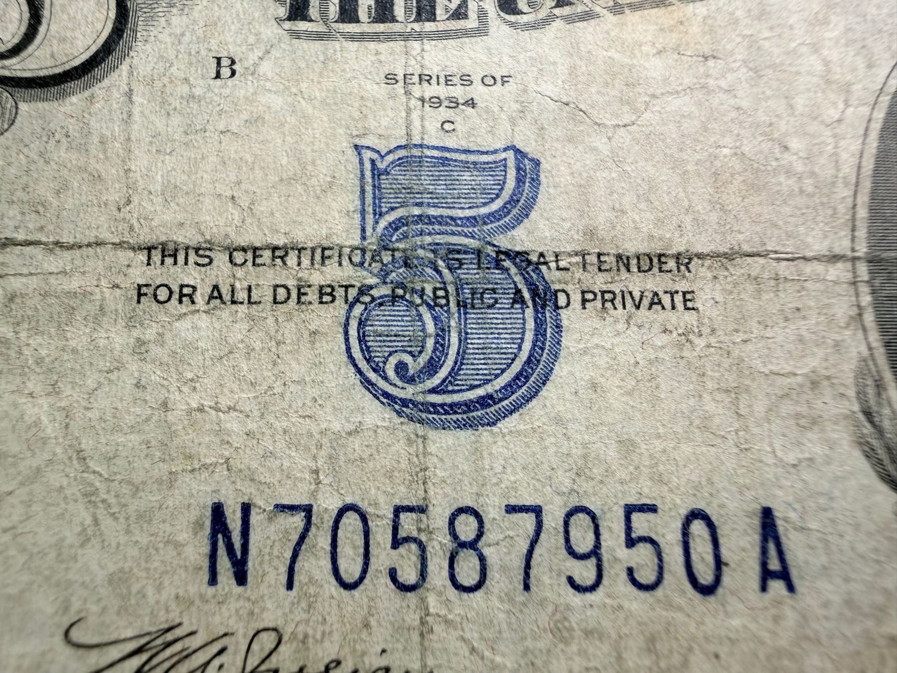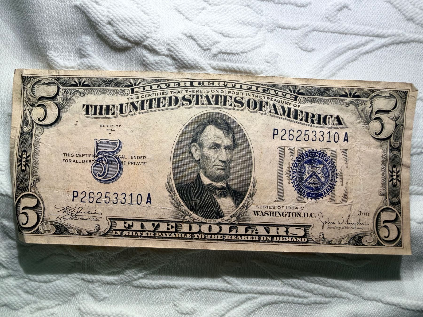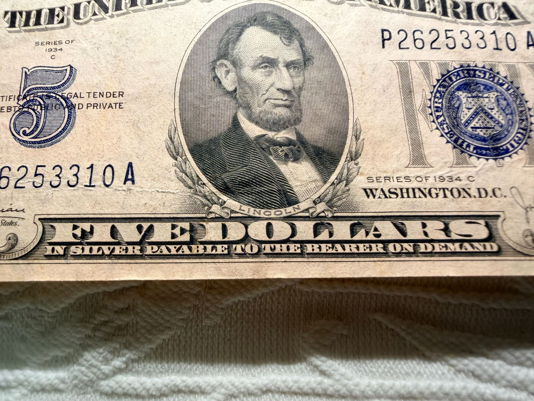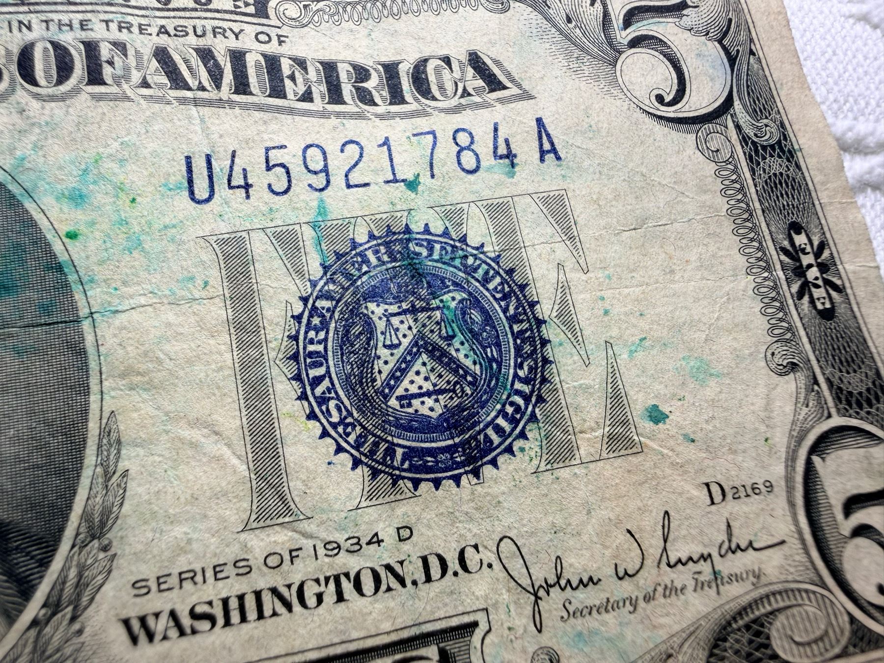 $5 SILVER CERTIFICATES - SERIES 1934A, 1934C, 1934D; BLUE TREASURY SEAL AND SERIAL NUMBERS AND BLUE 5 - LOT OF 5