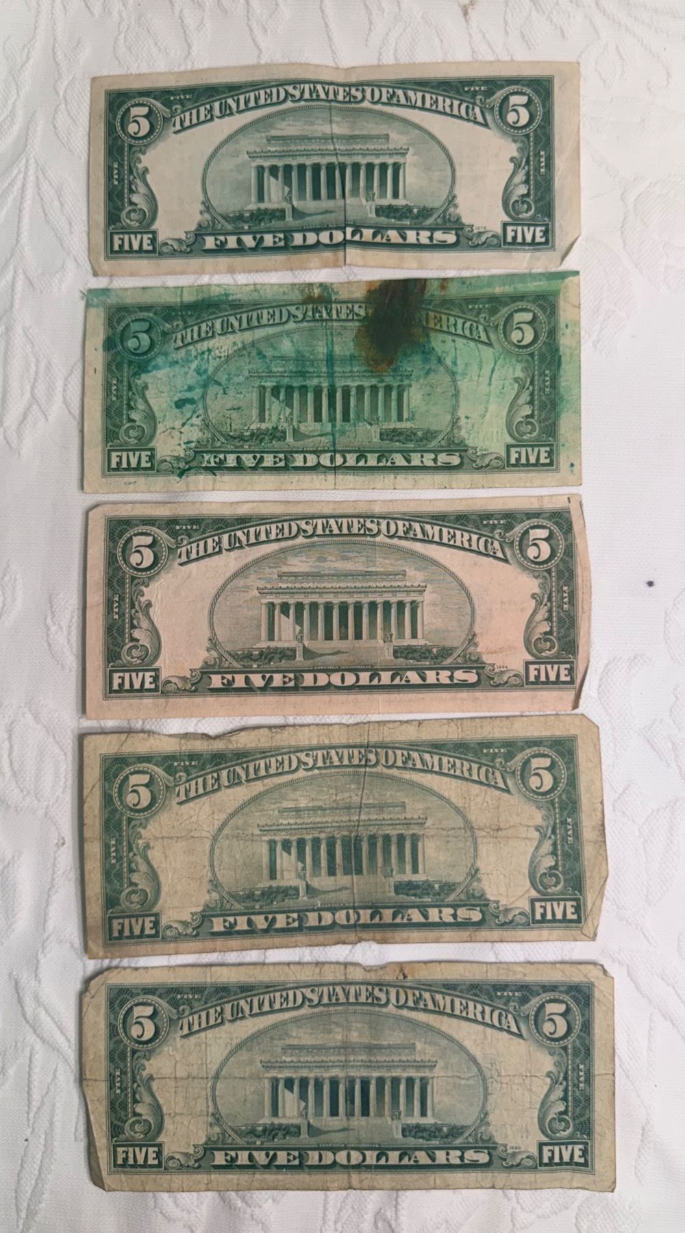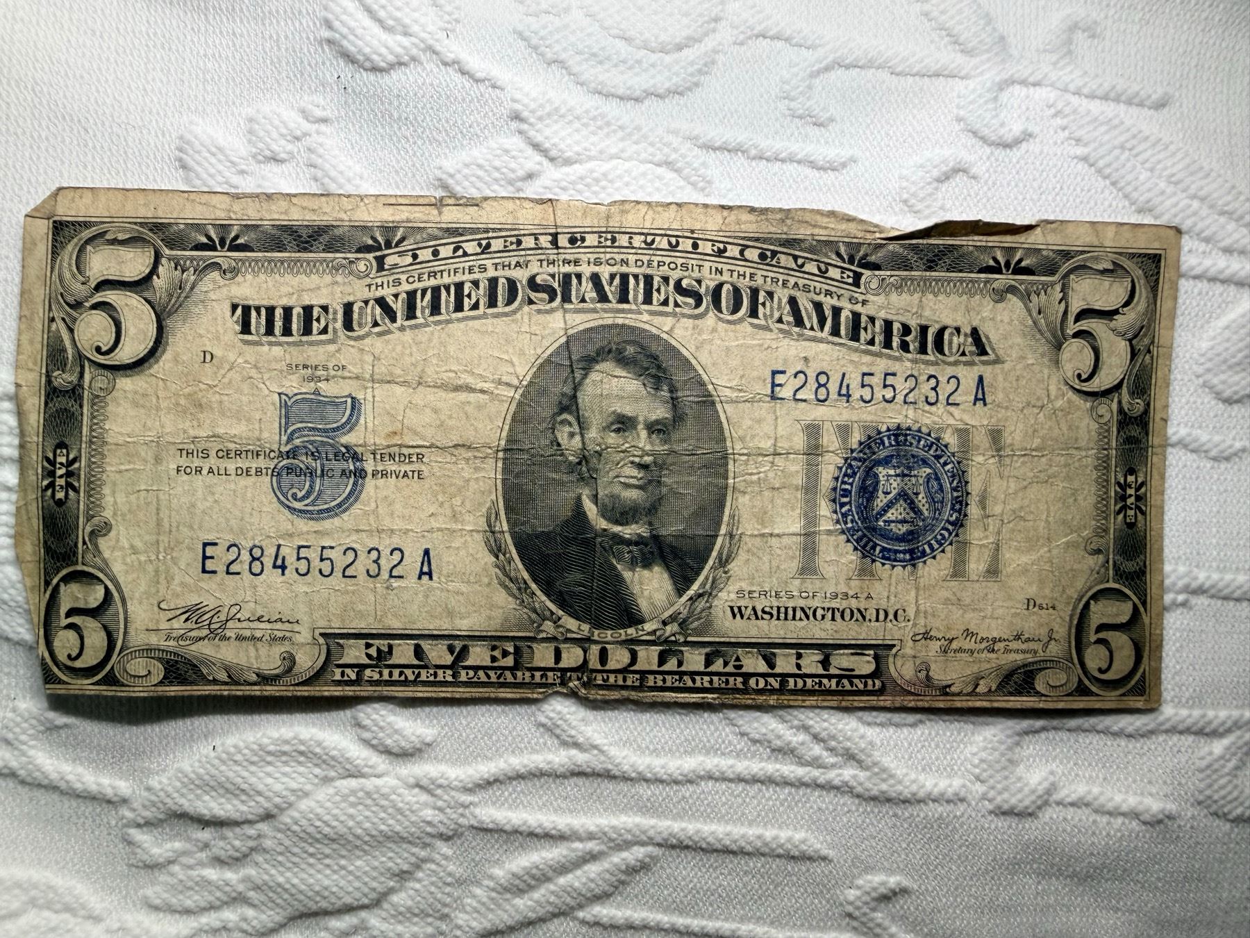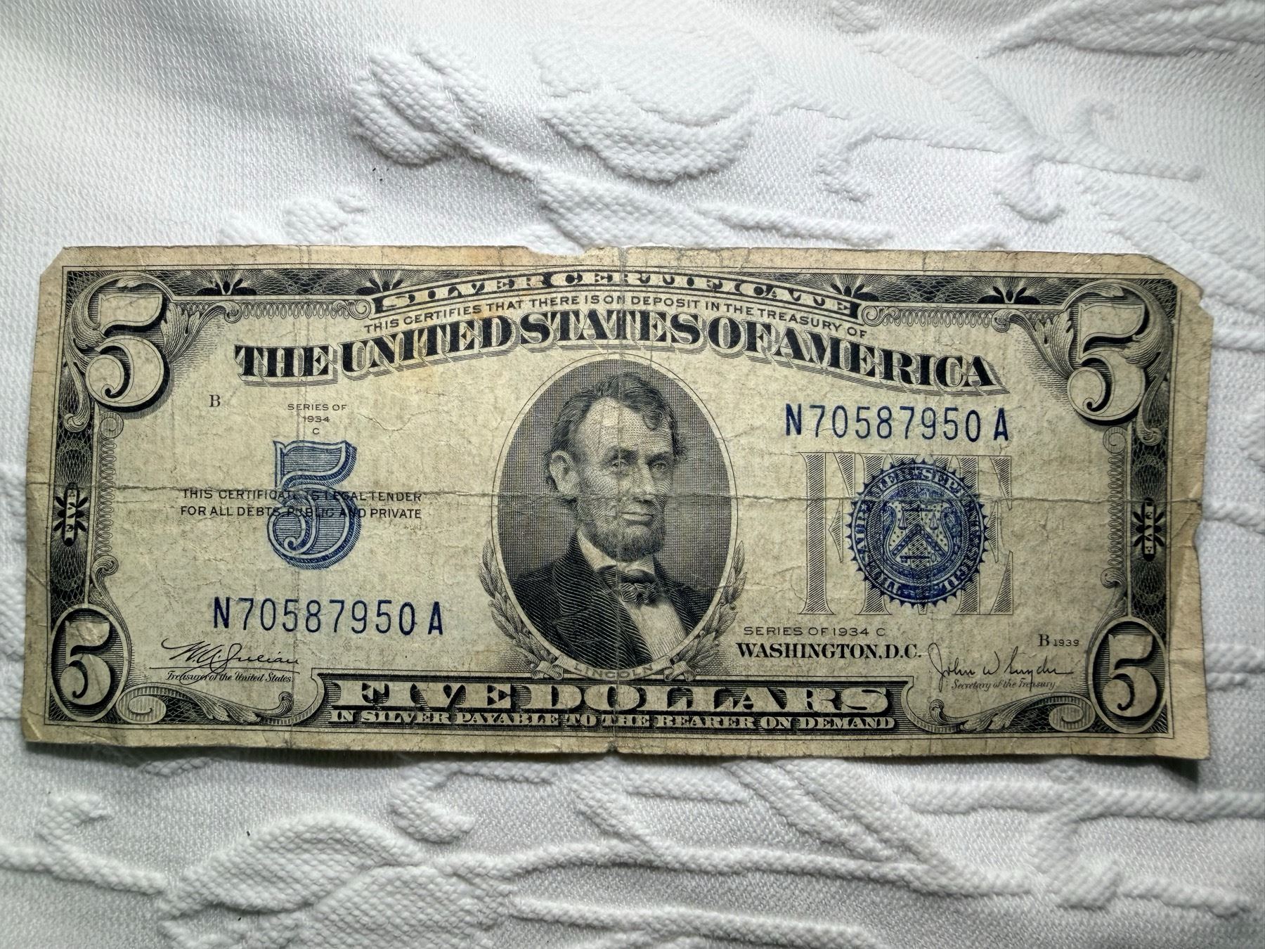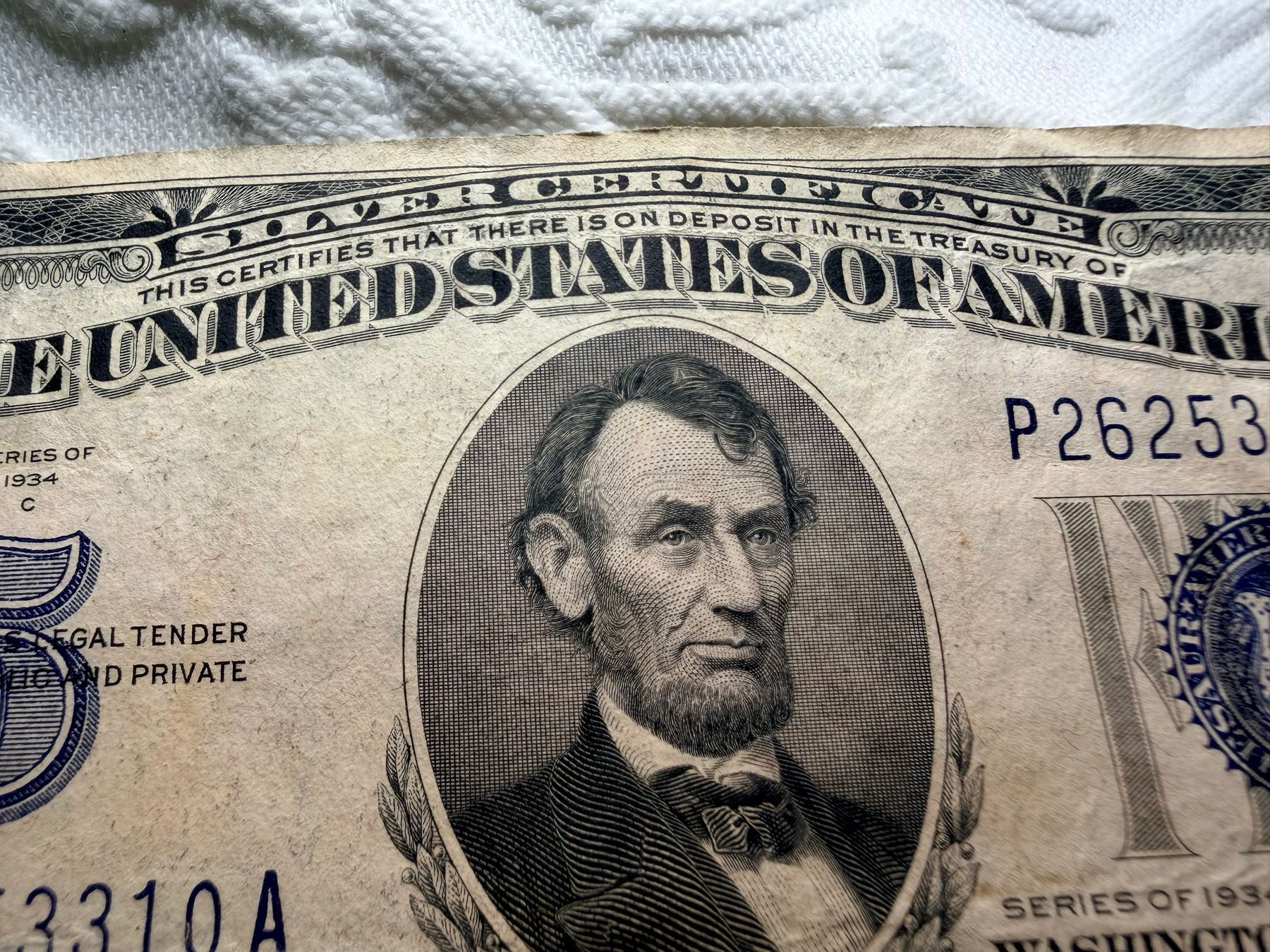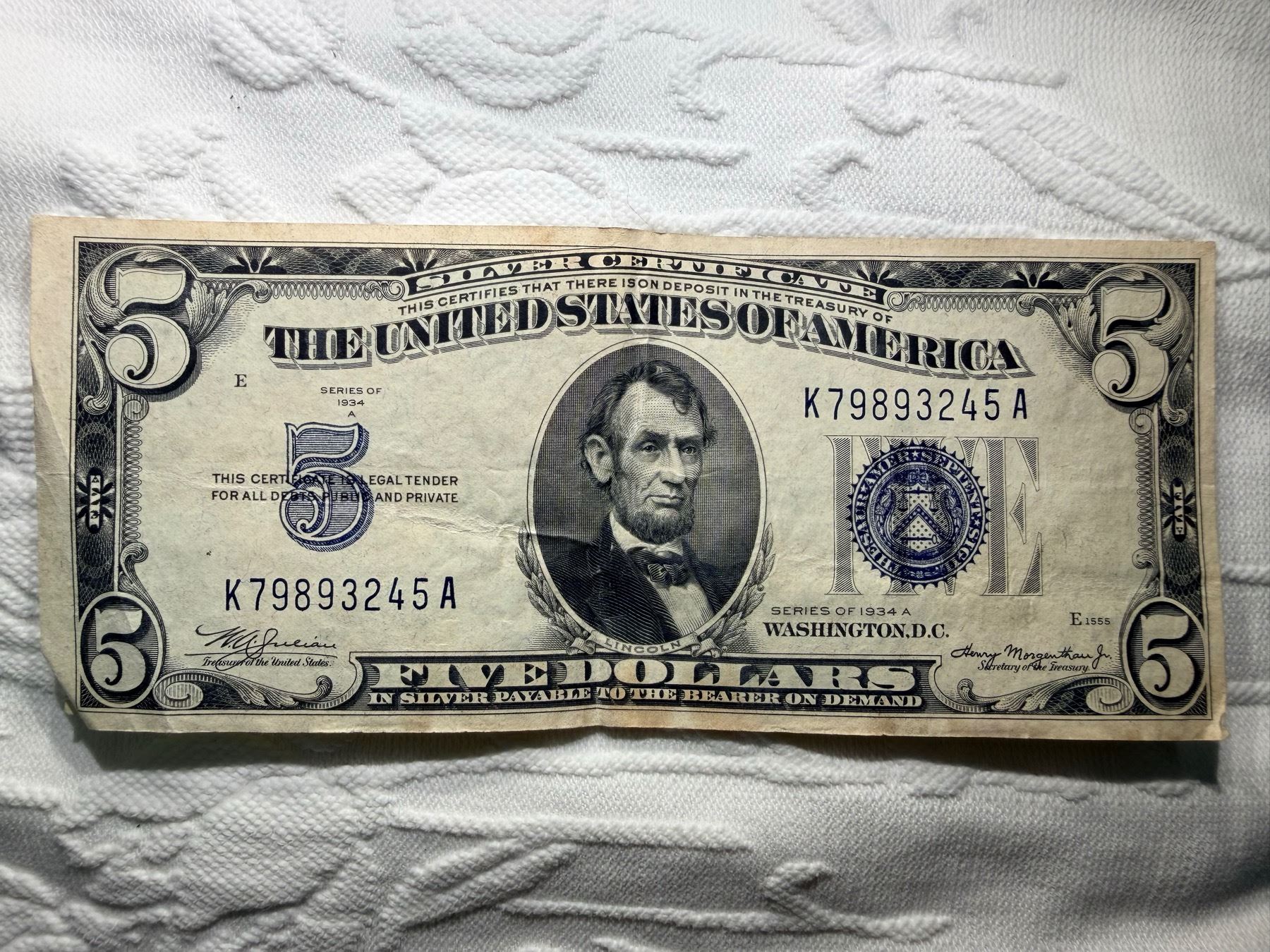 $5 SILVER CERTIFICATES - SERIES 1934A, 1934C, 1934D; BLUE TREASURY SEAL AND SERIAL NUMBERS AND BLUE 5 - LOT OF 5