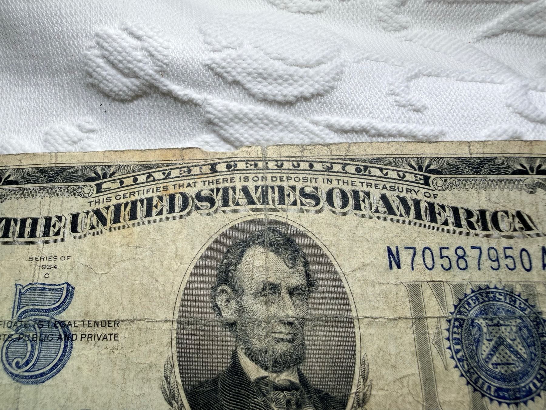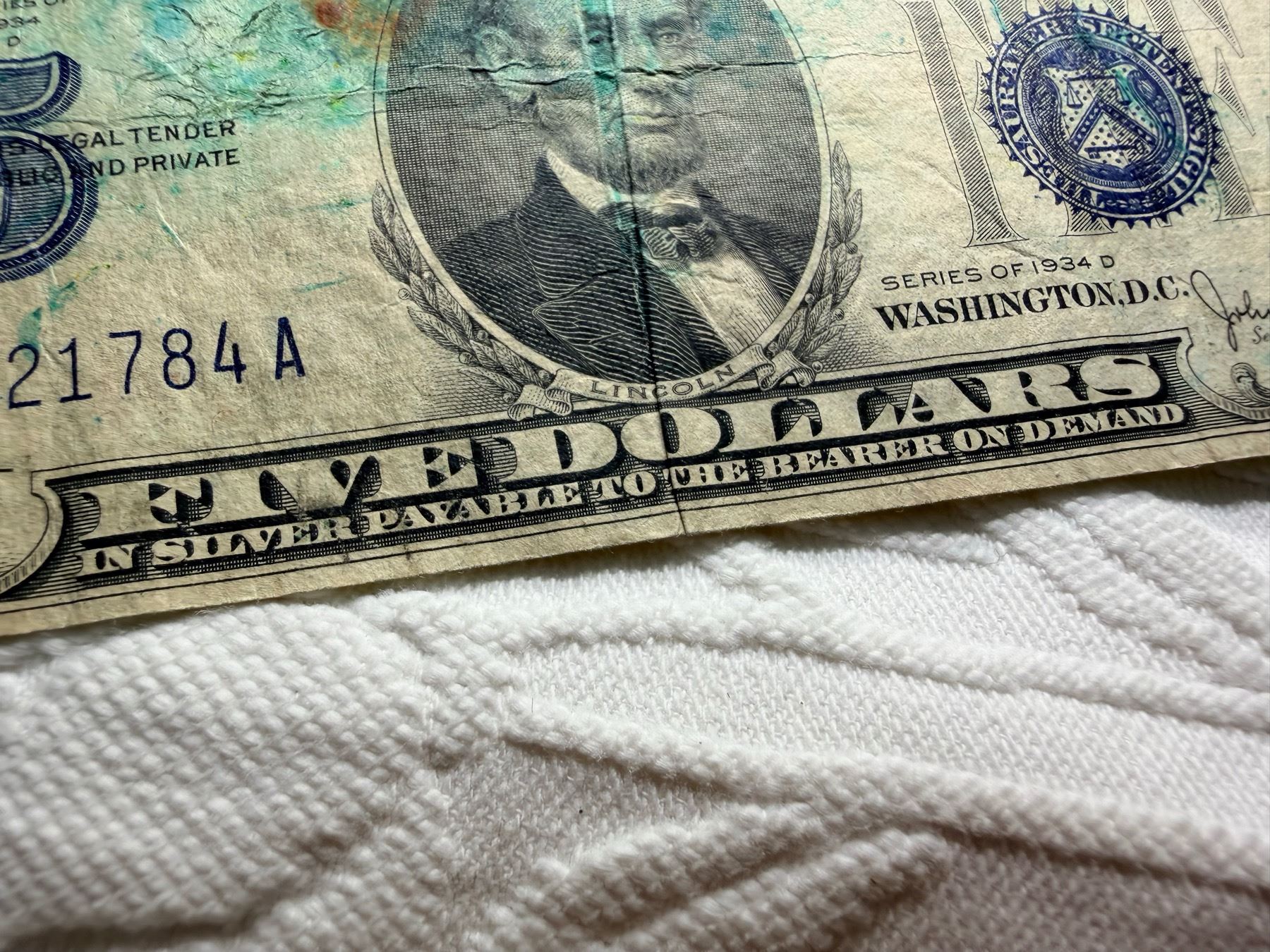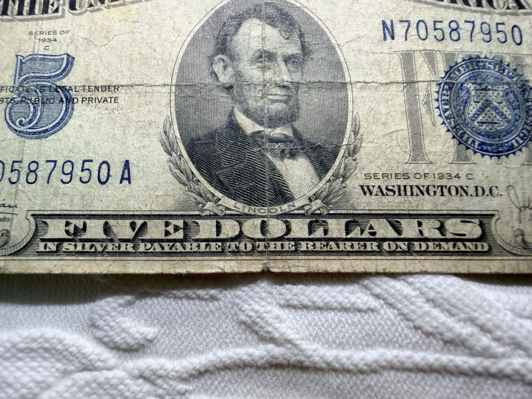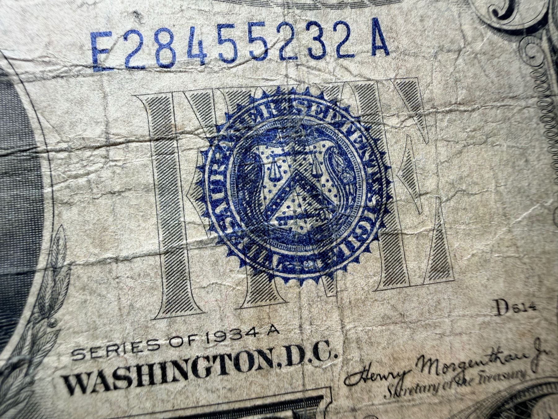 $5 SILVER CERTIFICATES - SERIES 1934A, 1934C, 1934D; BLUE TREASURY SEAL AND SERIAL NUMBERS AND BLUE 5 - LOT OF 5