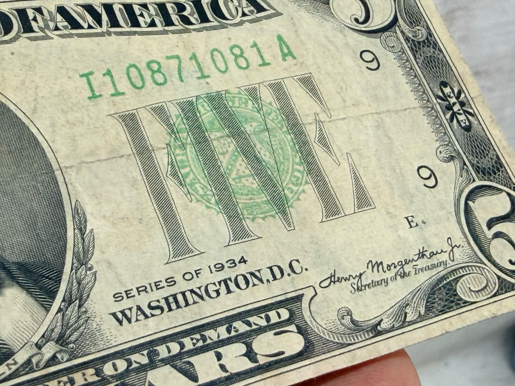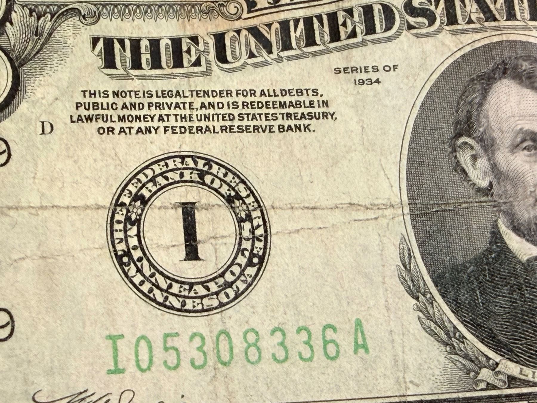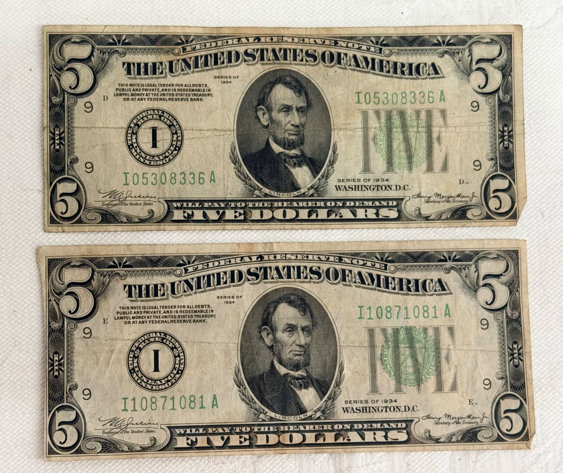 $5 UNITED STATES FEDERAL RESERVE NOTE – SERIES OF 1934, LIGHT GREEN TREASURY SEAL - ISSUED BY THE FEDERAL RESERVE BANK OF MINNEAPOLIS DISTRICT; LOT OF 2