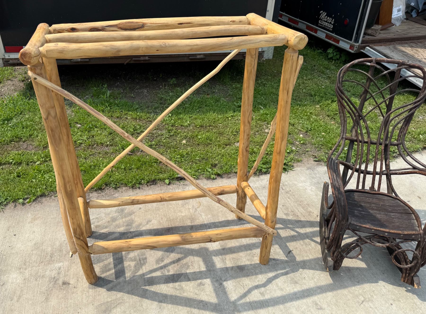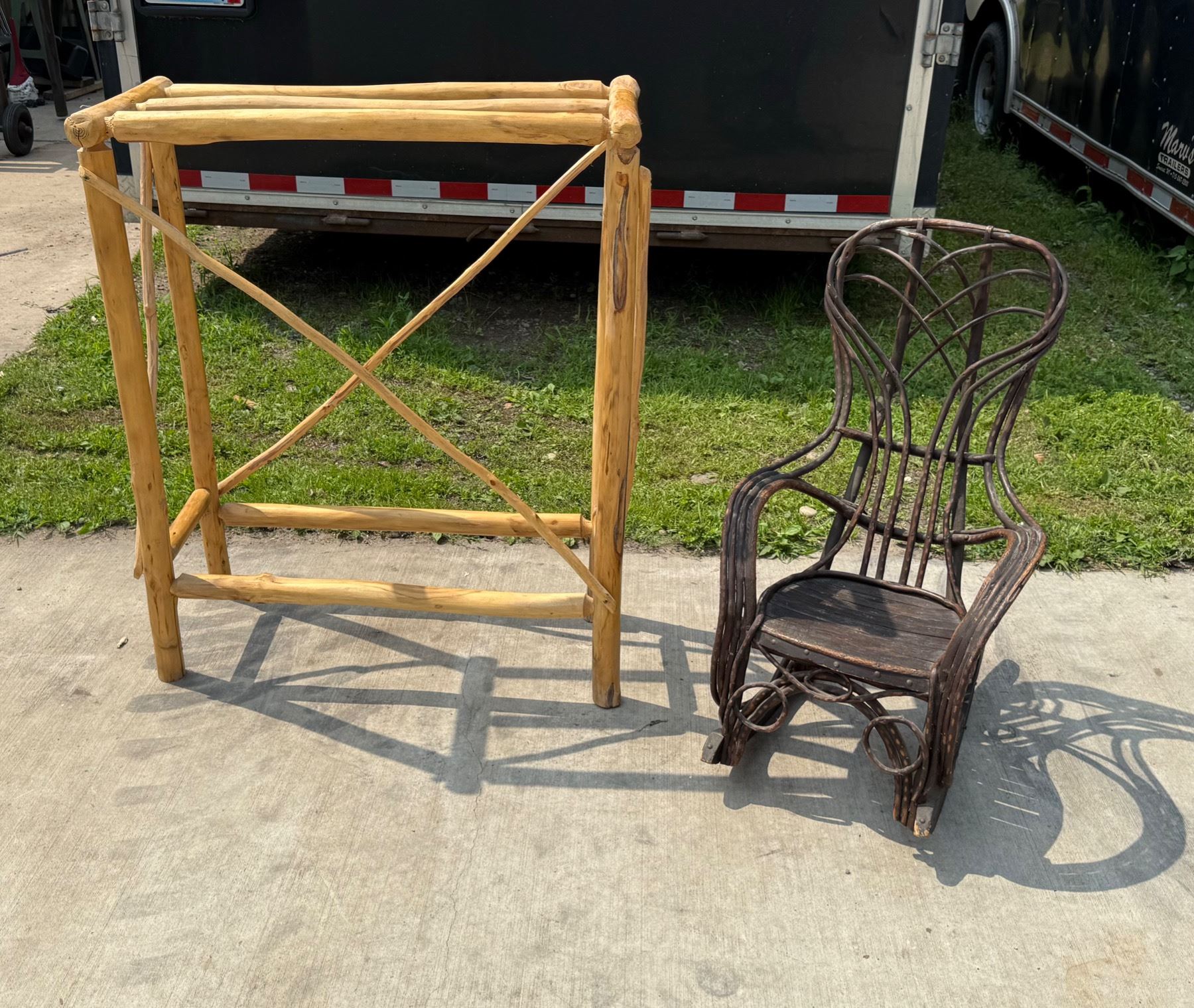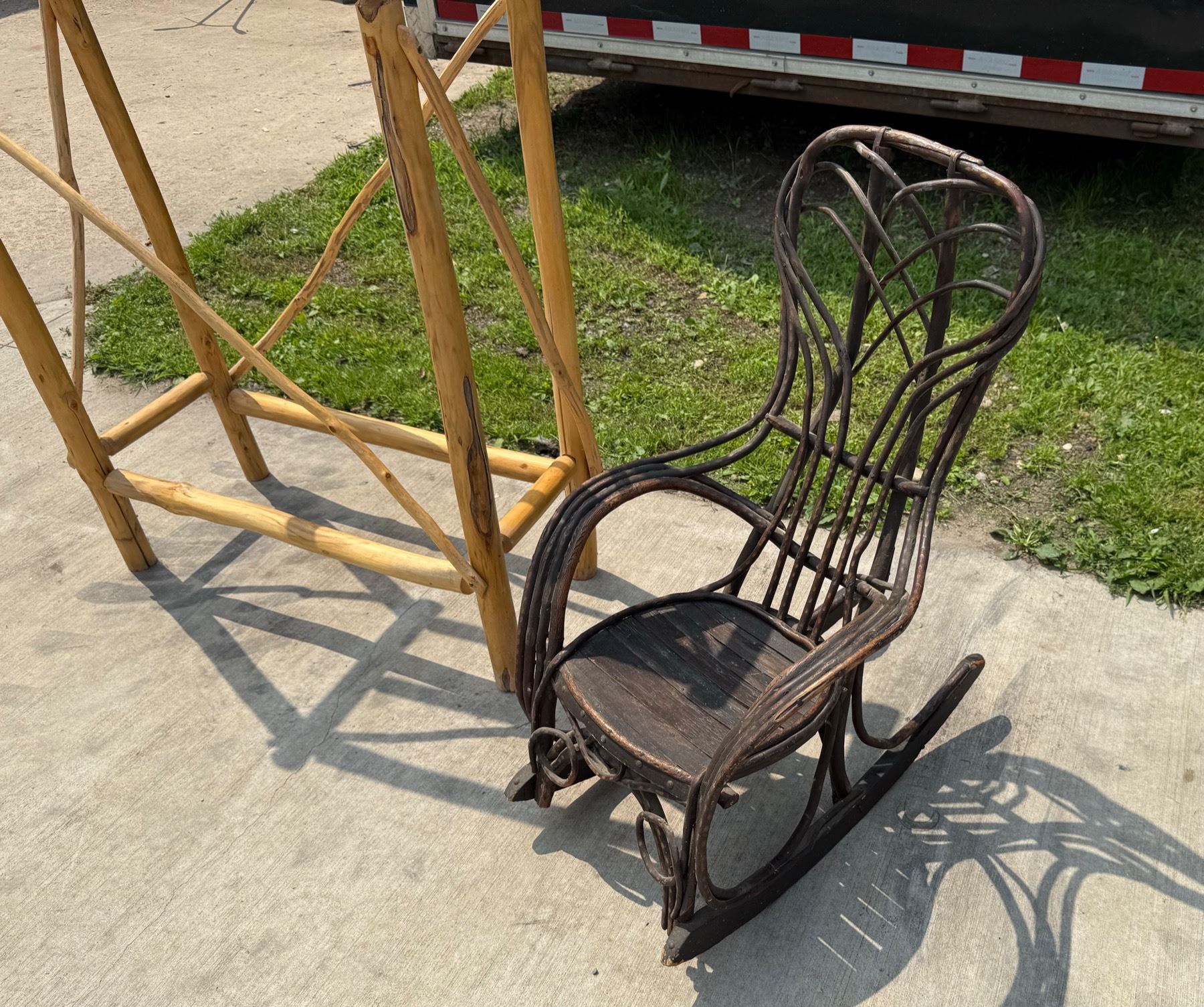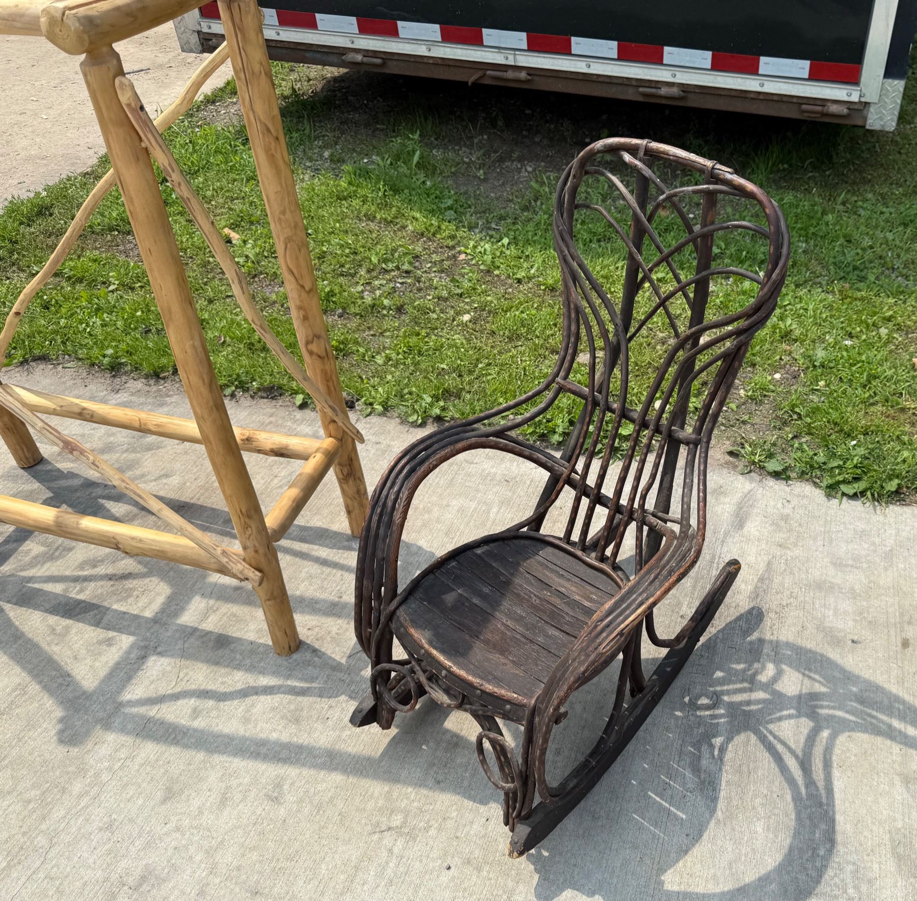 ANTIQUE BENTWOOD HICKORY AND OAK TWIG ROCKER AND LOG WOOD TABLE