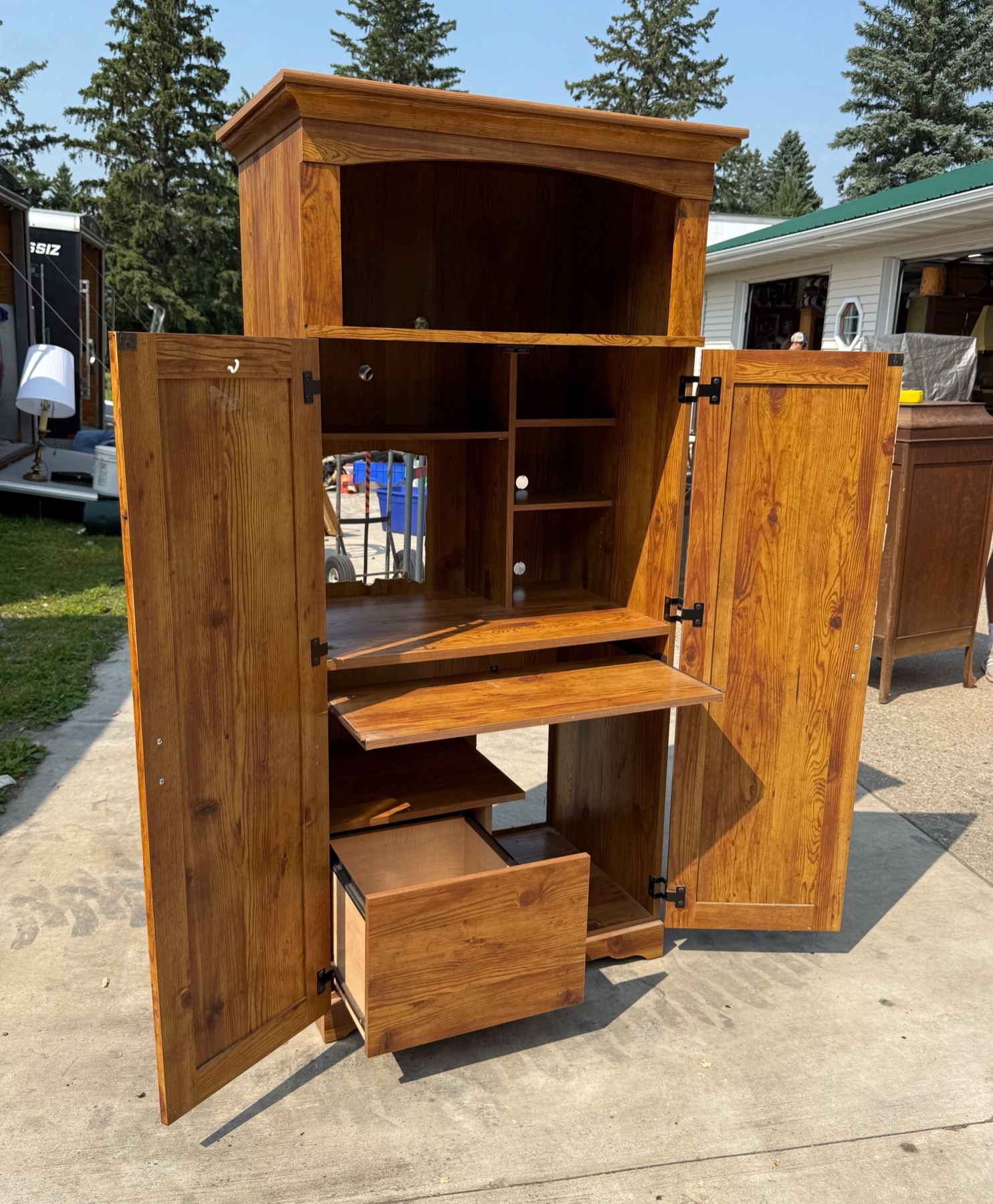 CAN USE FOR THE COMPUTER, TV, OR STEREO AND CLOSE THE DOORS WHEN YOU DON'T WANT TO SEE THEM; THE TOP CAN BE USED TO DISPLAY OR FOR SPEAKERS; THERE IS A SLIDE OUT FOR THE KEYBOARD AND A DRAWER FOR ACCESSORIES