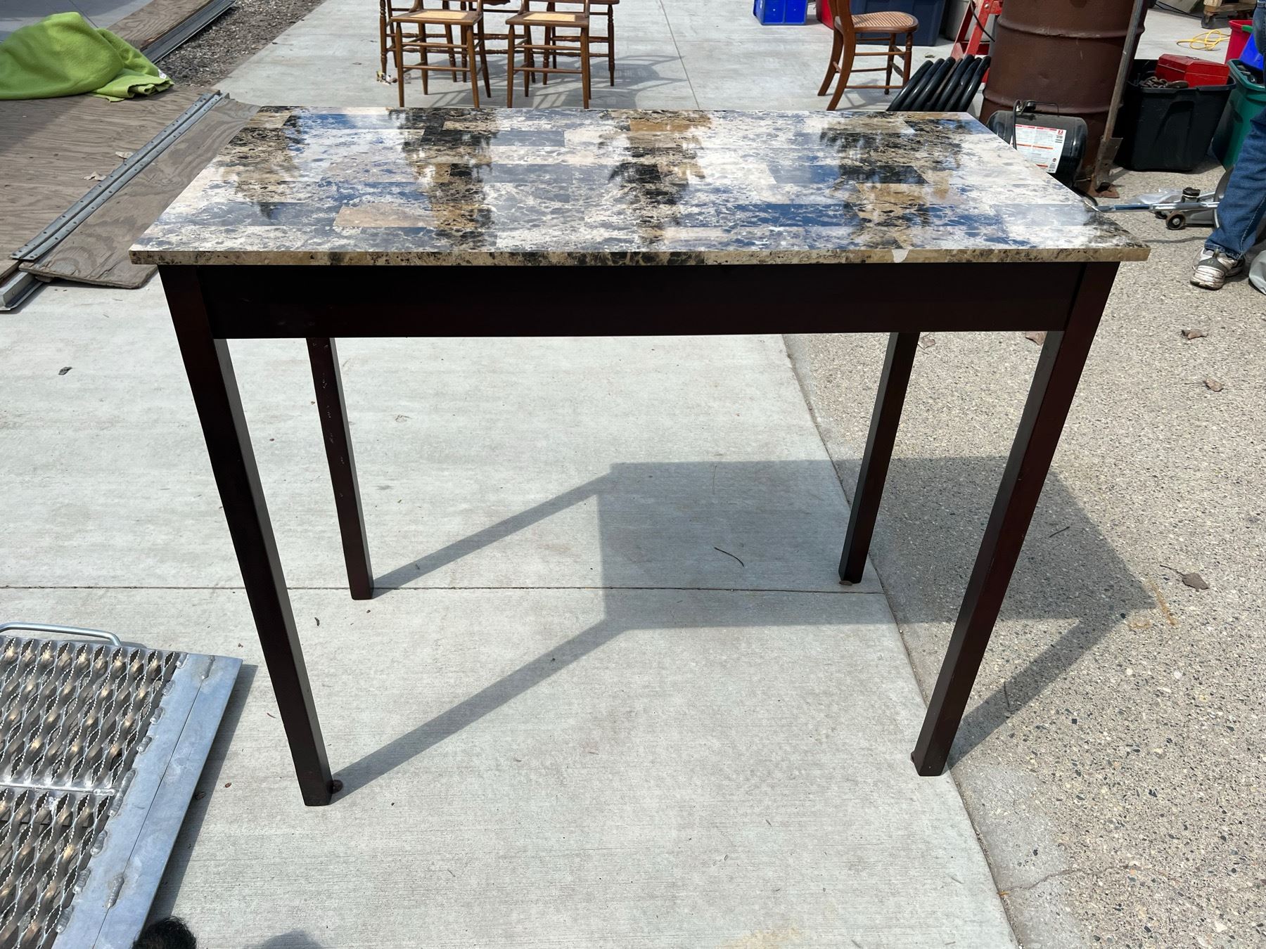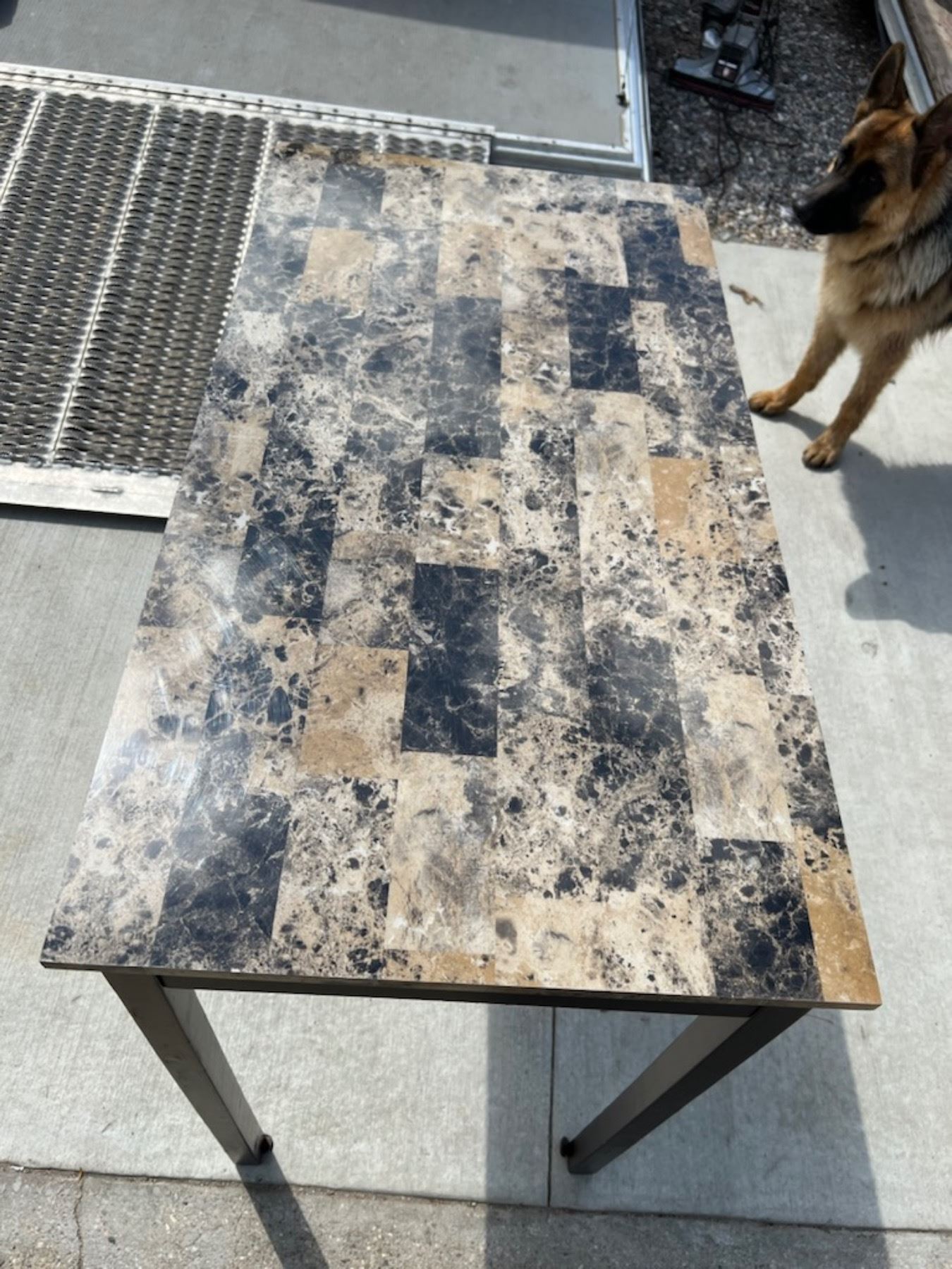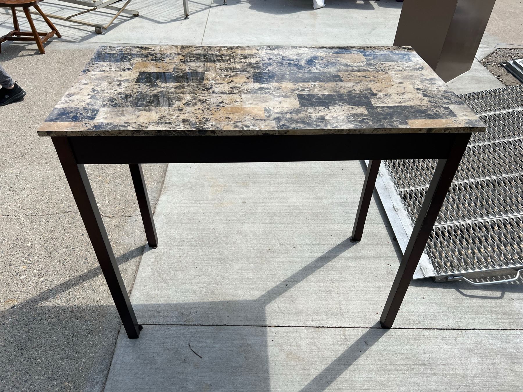 STURDY TABLE; TOP HAS A GRANITE-LOOK TO IT, HOWEVER IT IS SOME FORM OF LAMINATE; GOOD CONDITION EXCEPT ONE SMALL DIME SIZED SCUFF; PLEASE SEE PICTURE
