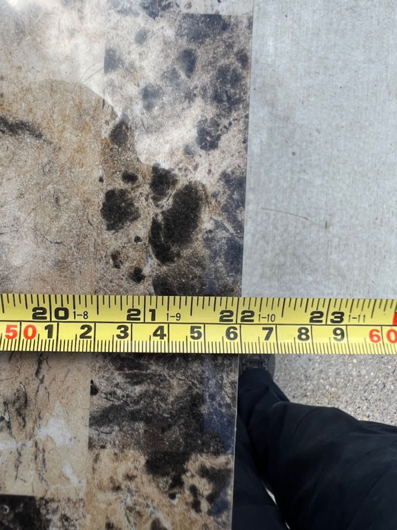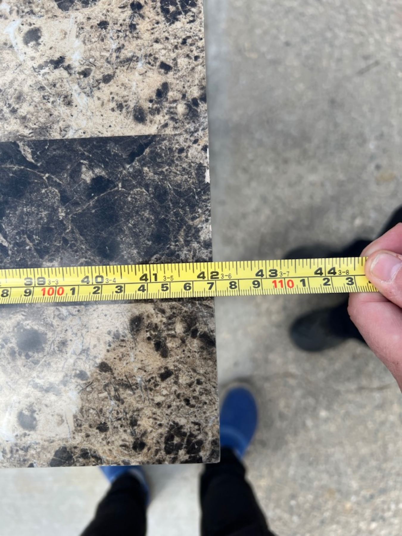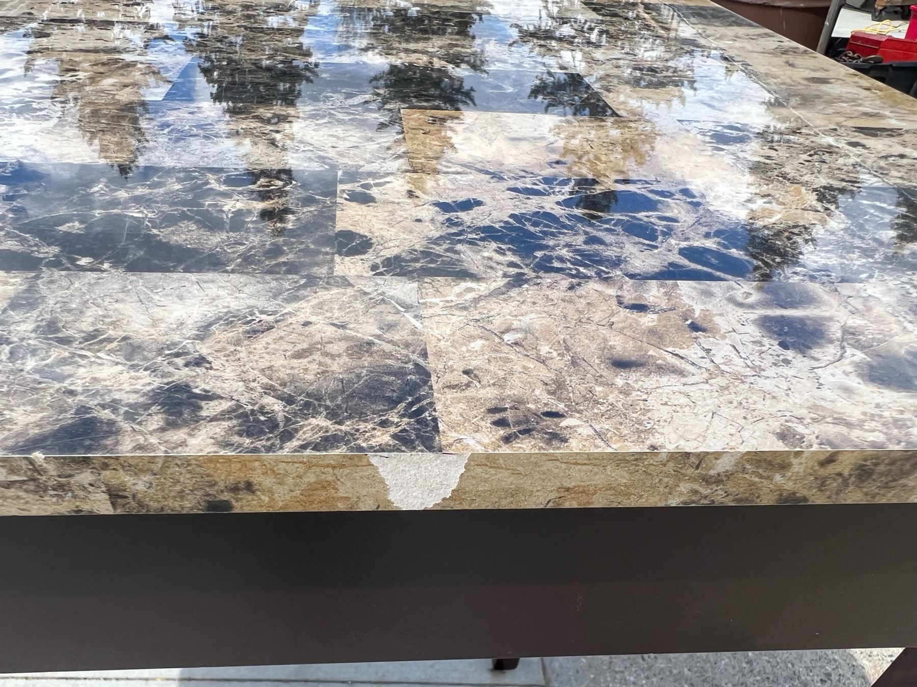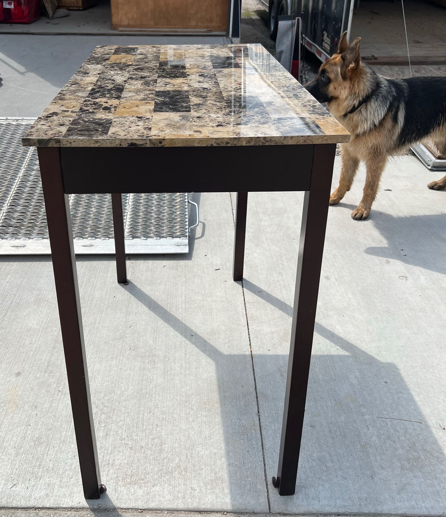 STURDY TABLE; TOP HAS A GRANITE-LOOK TO IT, HOWEVER IT IS SOME FORM OF LAMINATE; GOOD CONDITION EXCEPT ONE SMALL DIME SIZED SCUFF; PLEASE SEE PICTURE