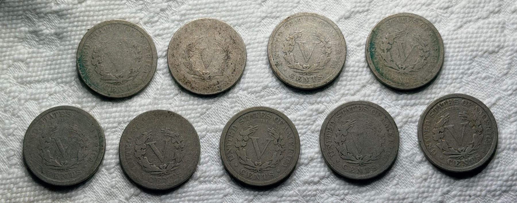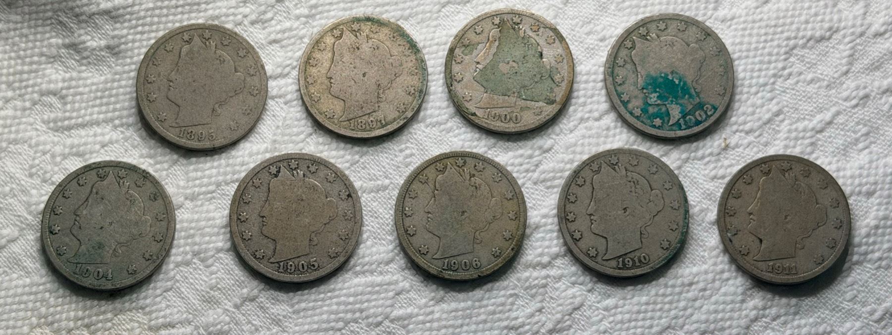 BARBER NICKELS - LOT OF 9; 1895, 1897, 1900, 1902, 1904, 1905, 1906, 1910, AND 1911