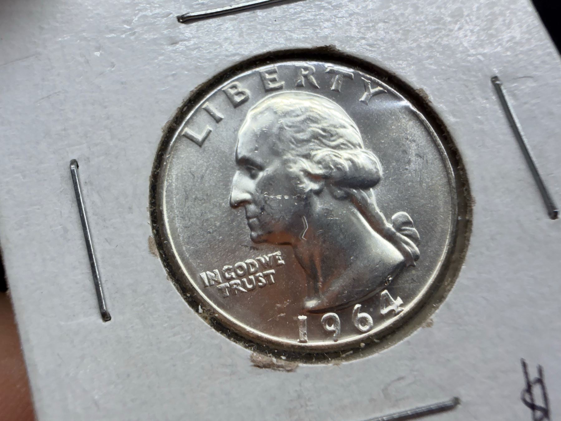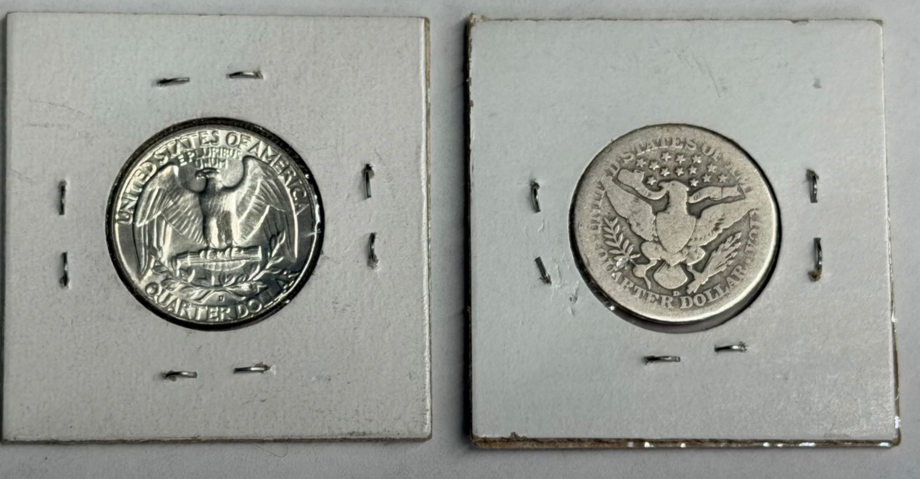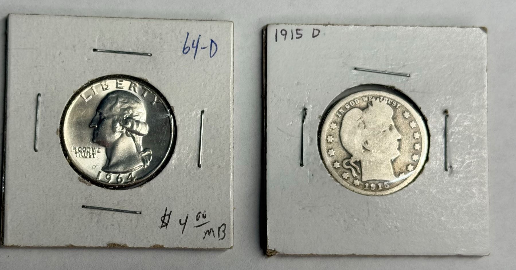 BARBER SILVER QUARTER DOLLAR - 1915D; WASHINGTON SILVER QUARTER DOLLAR - 1964D; DENVER MINT