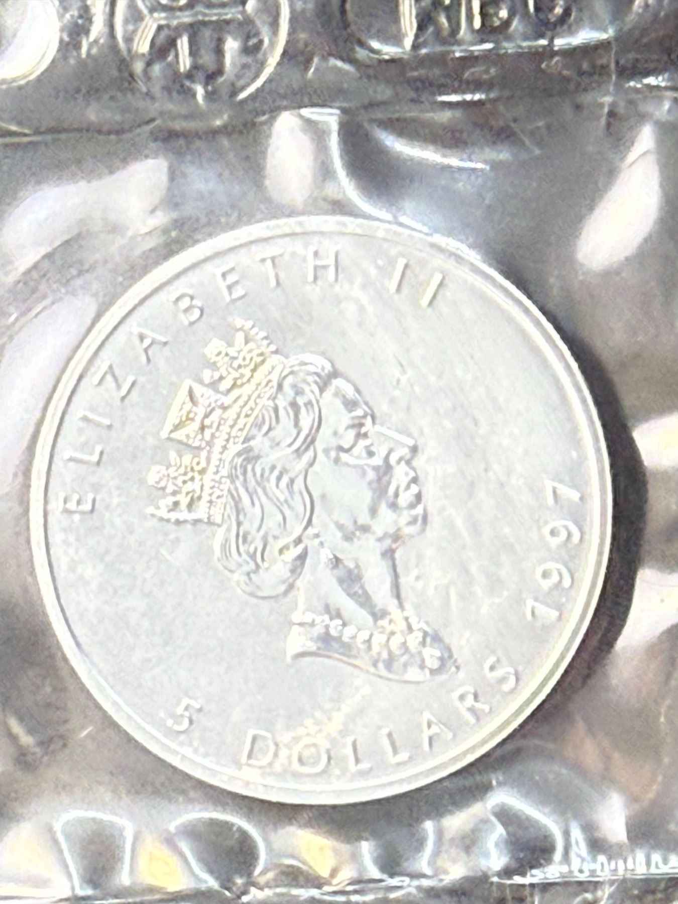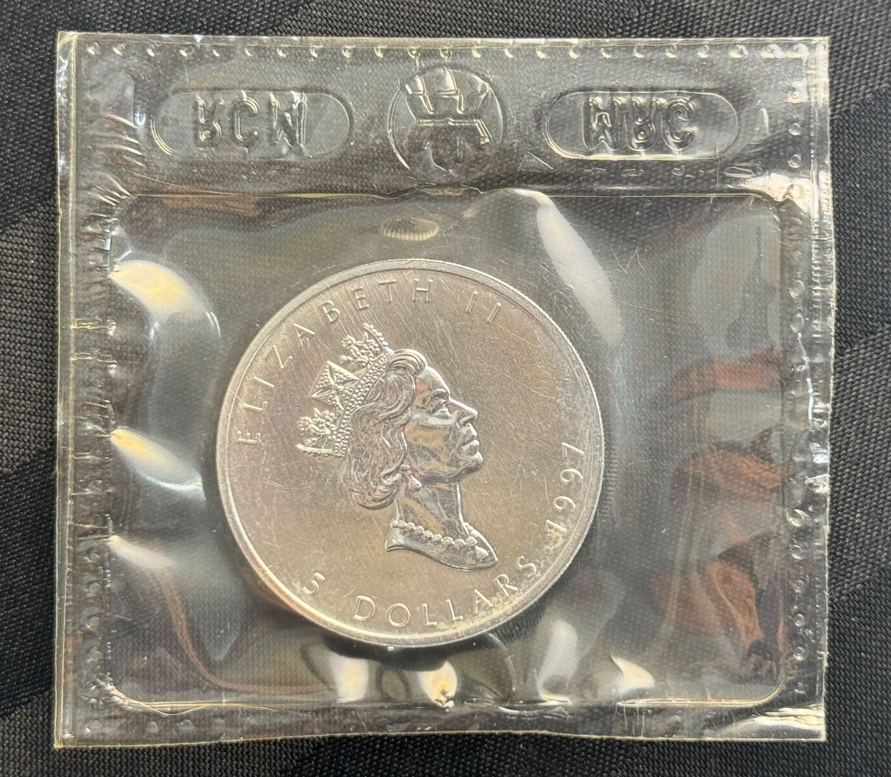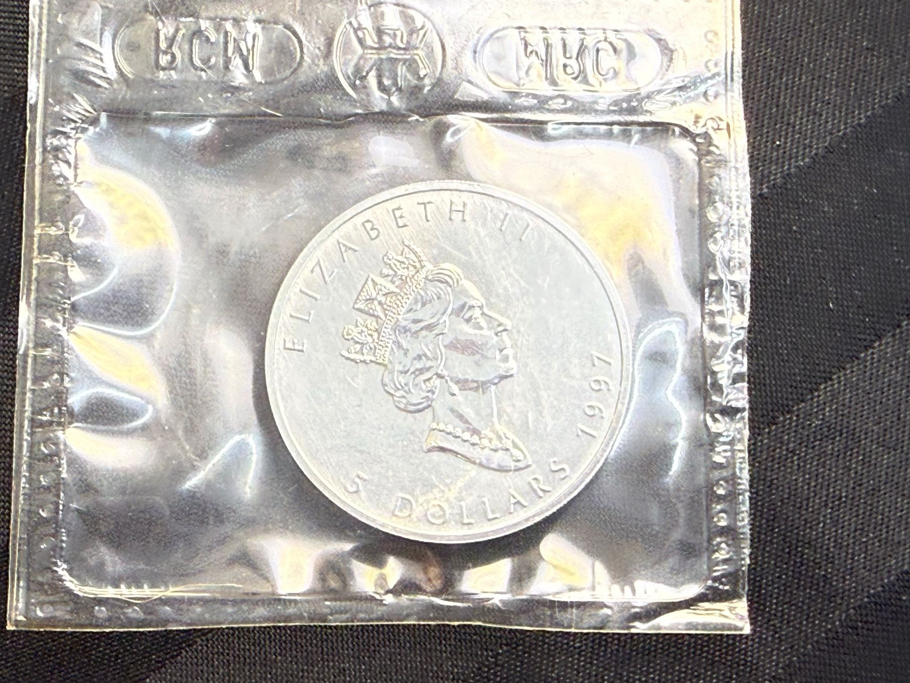 CANADIAN MAPLE LEAF $5 SILVER COIN - 1997; BRILLIANT UNCIRCULATED, IN ORIGINAL ROYAL CANADIAN MINT PACKAGING CUT FROM 10 PACK