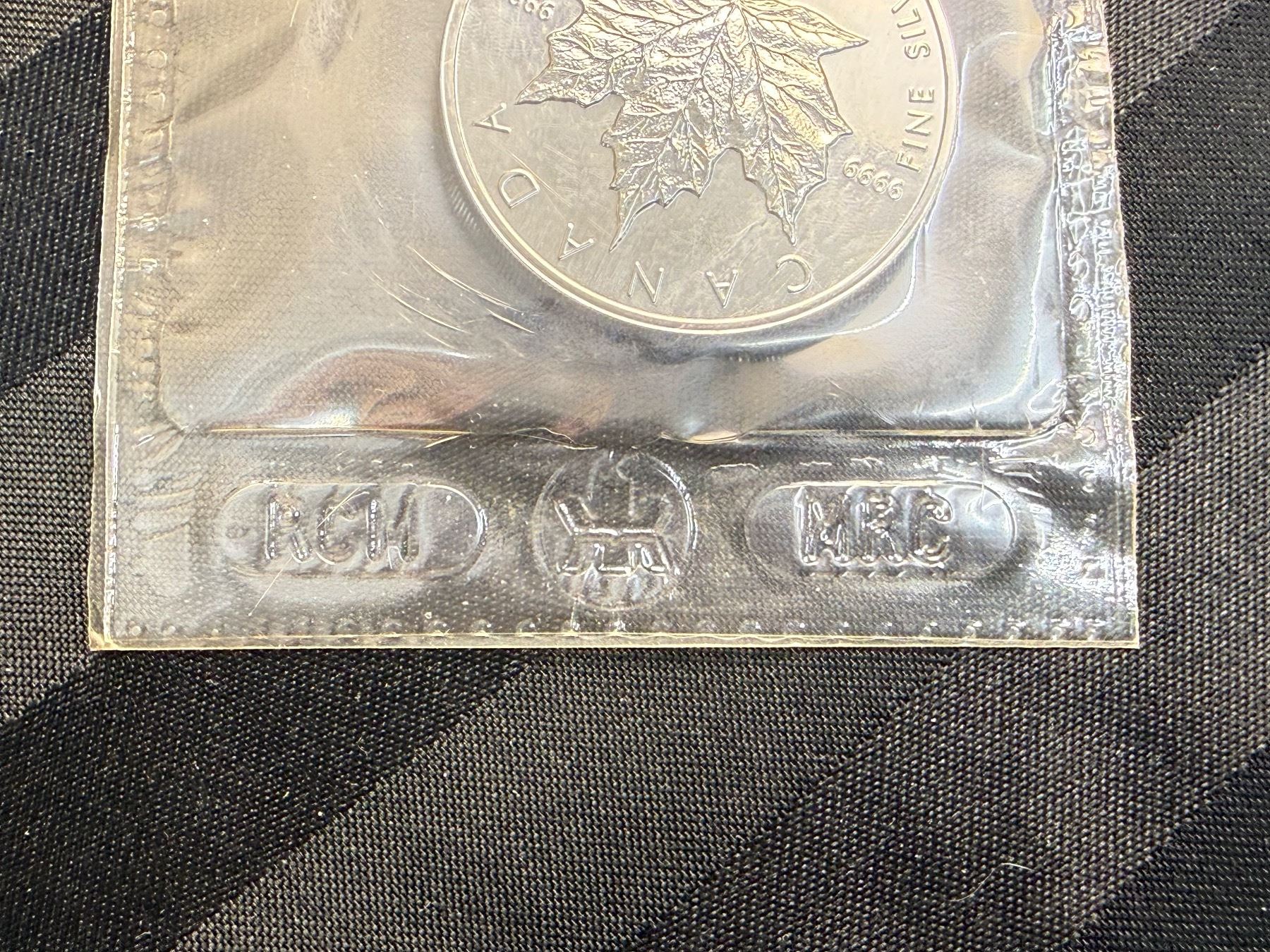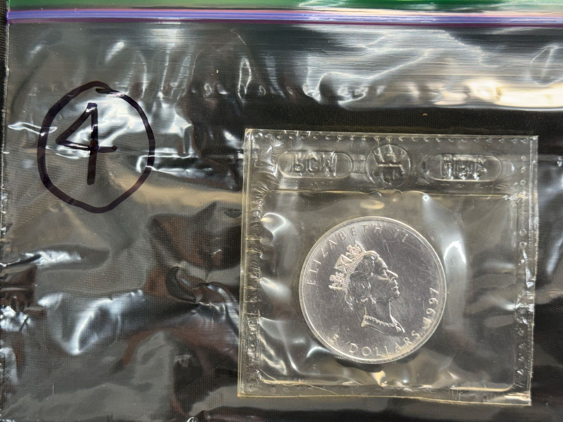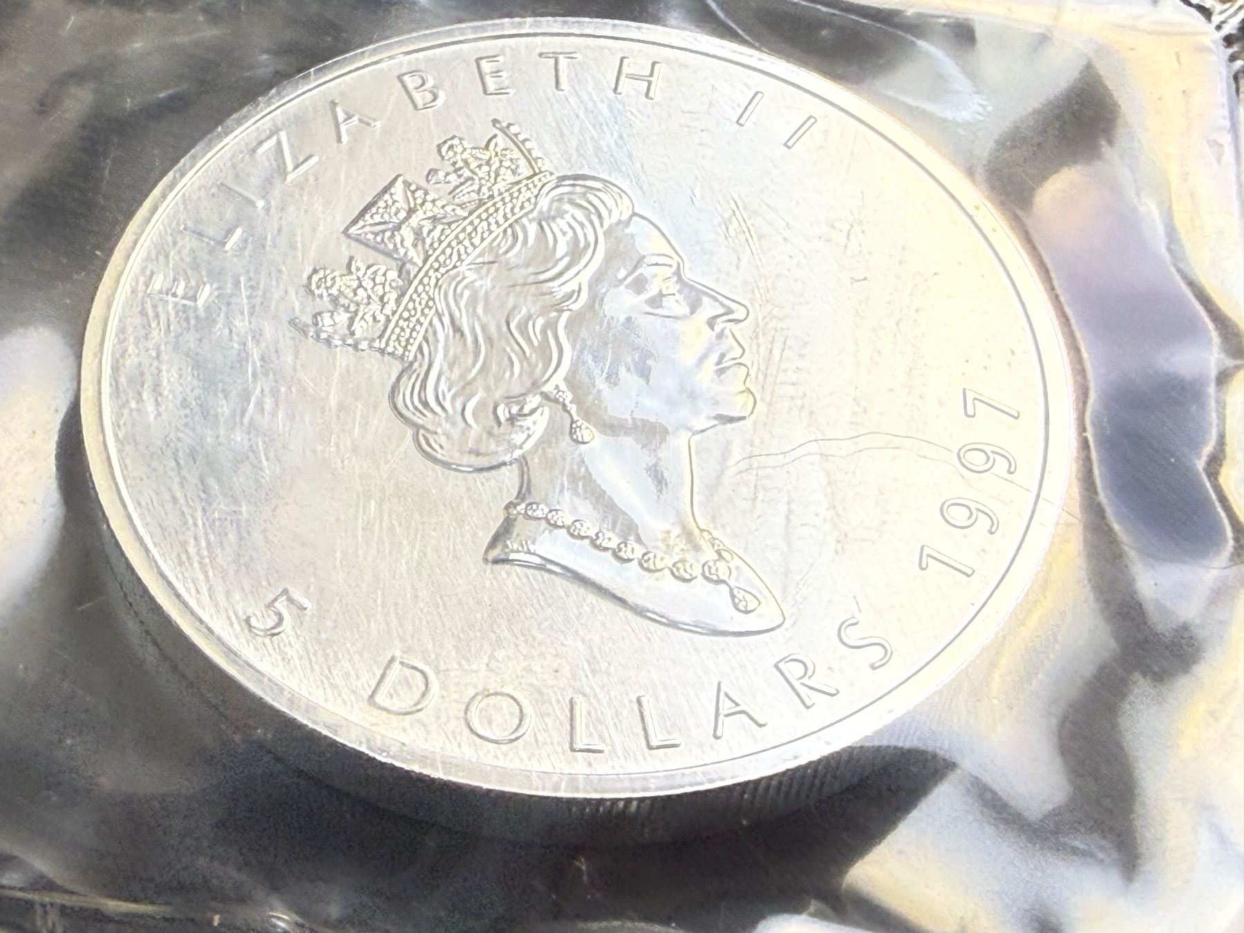 CANADIAN MAPLE LEAF $5 SILVER COIN - 1997; BRILLIANT UNCIRCULATED, IN ORIGINAL ROYAL CANADIAN MINT PACKAGING CUT FROM 10 PACK