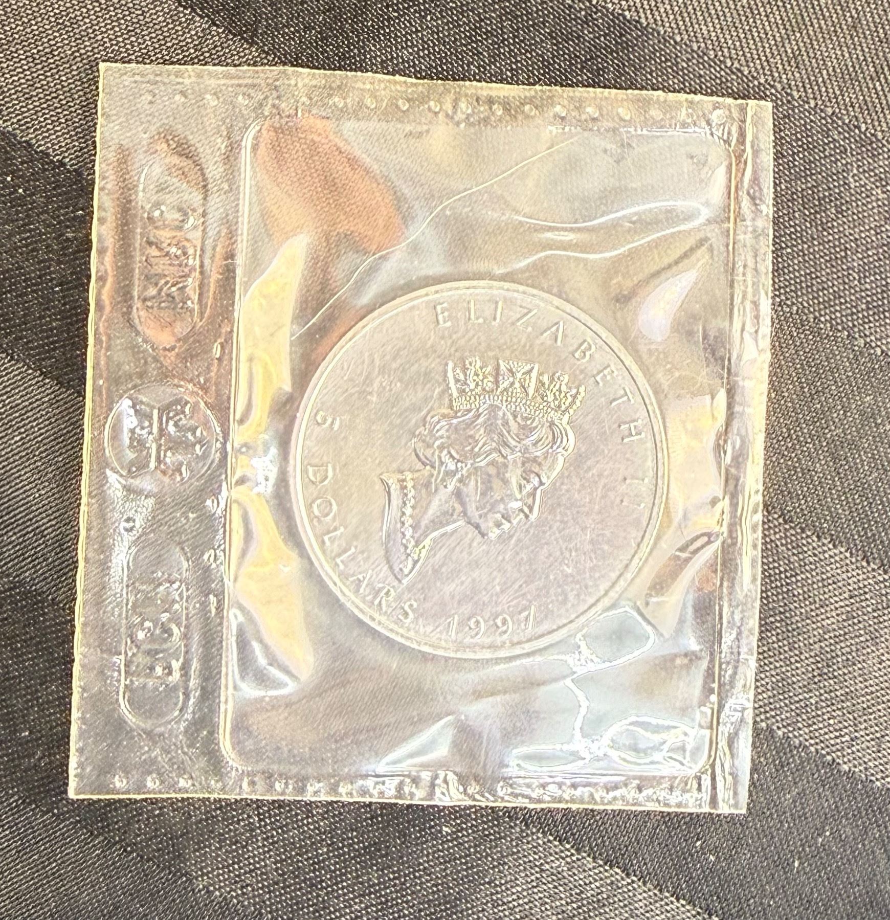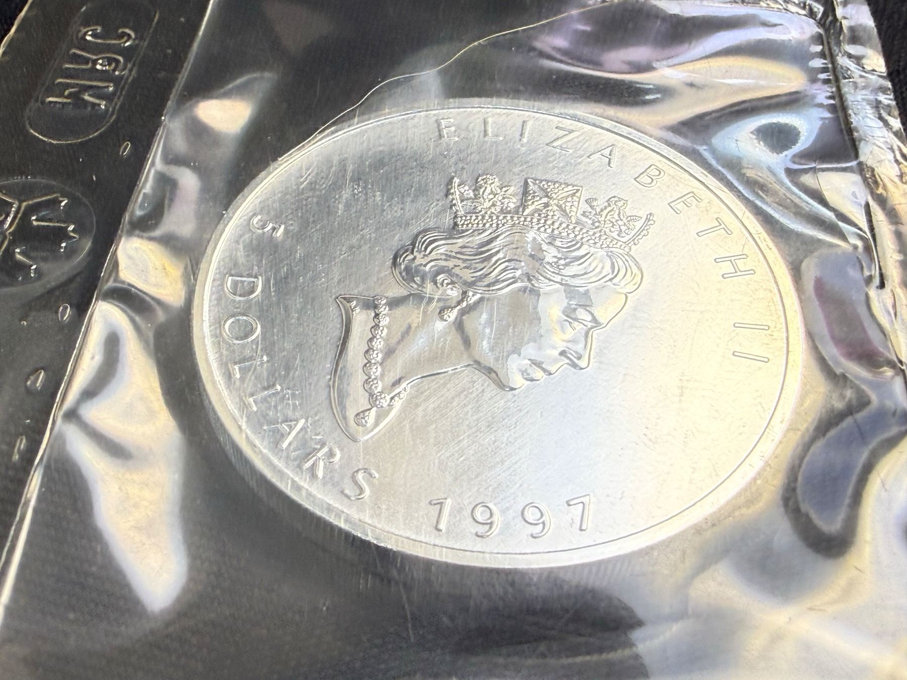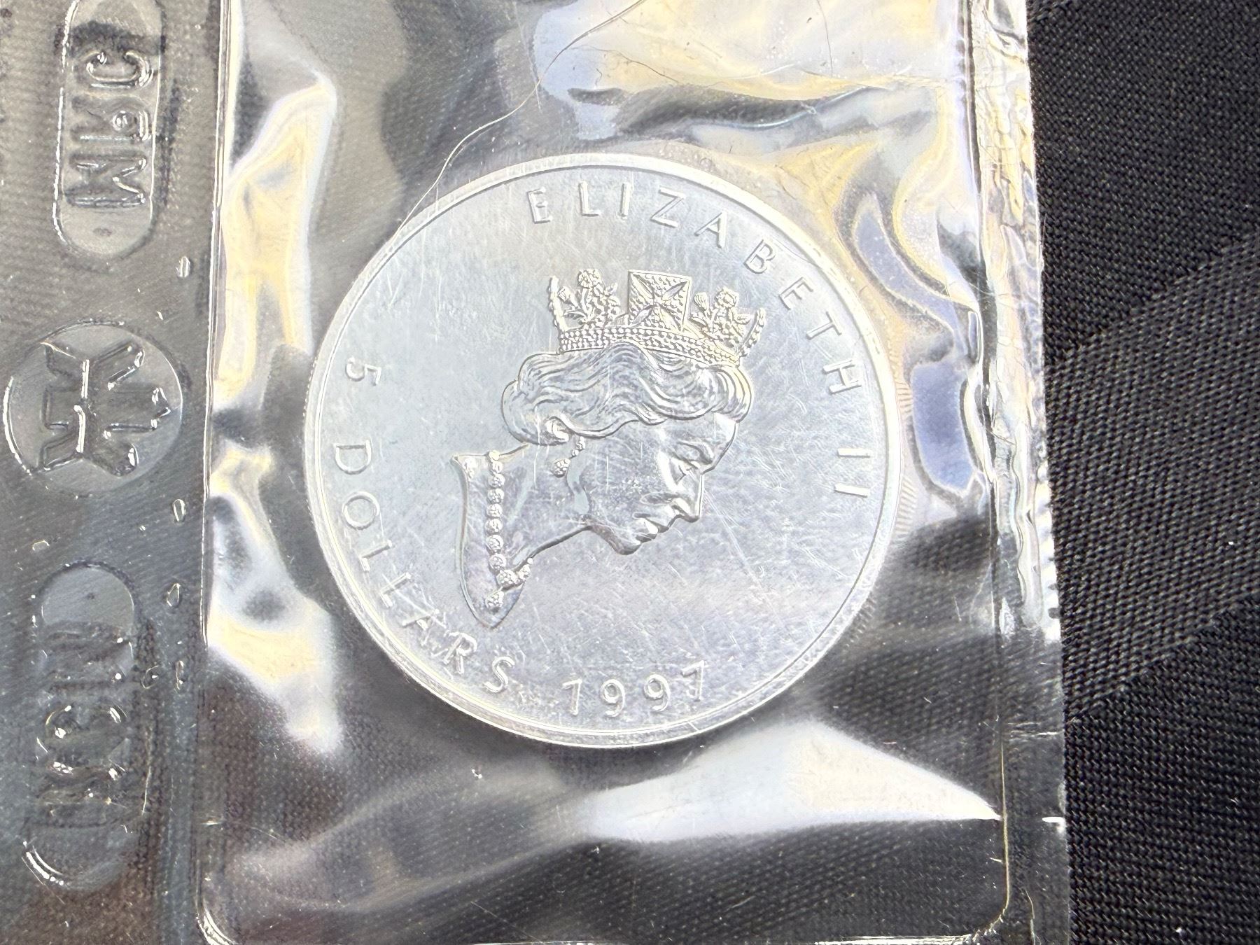 CANADIAN MAPLE LEAF $5 SILVER COIN - 1997; BRILLIANT UNCIRCULATED, IN ORIGINAL ROYAL CANADIAN MINT PACKAGING CUT FROM 10 PACK