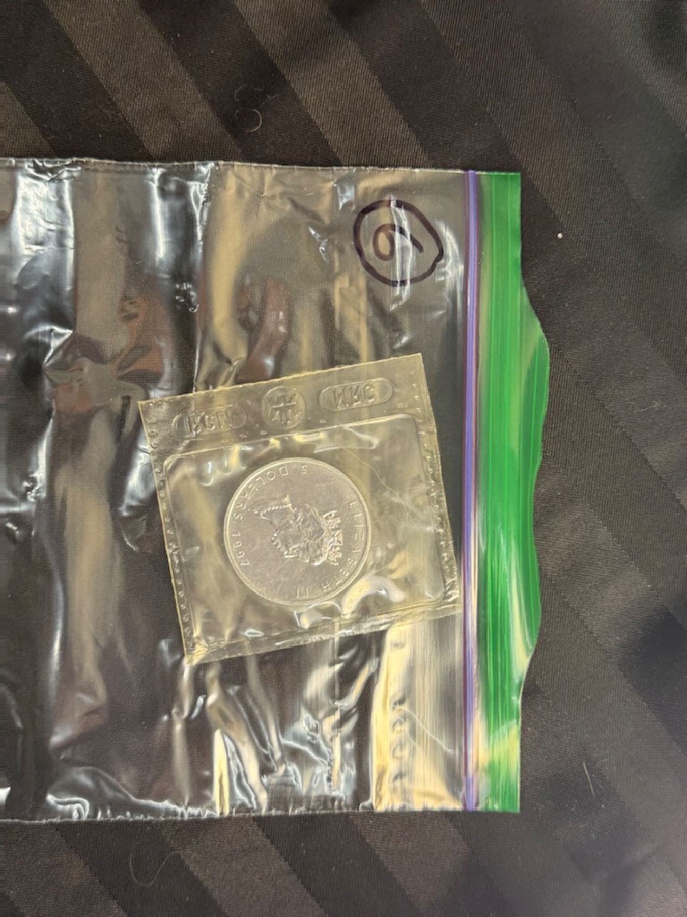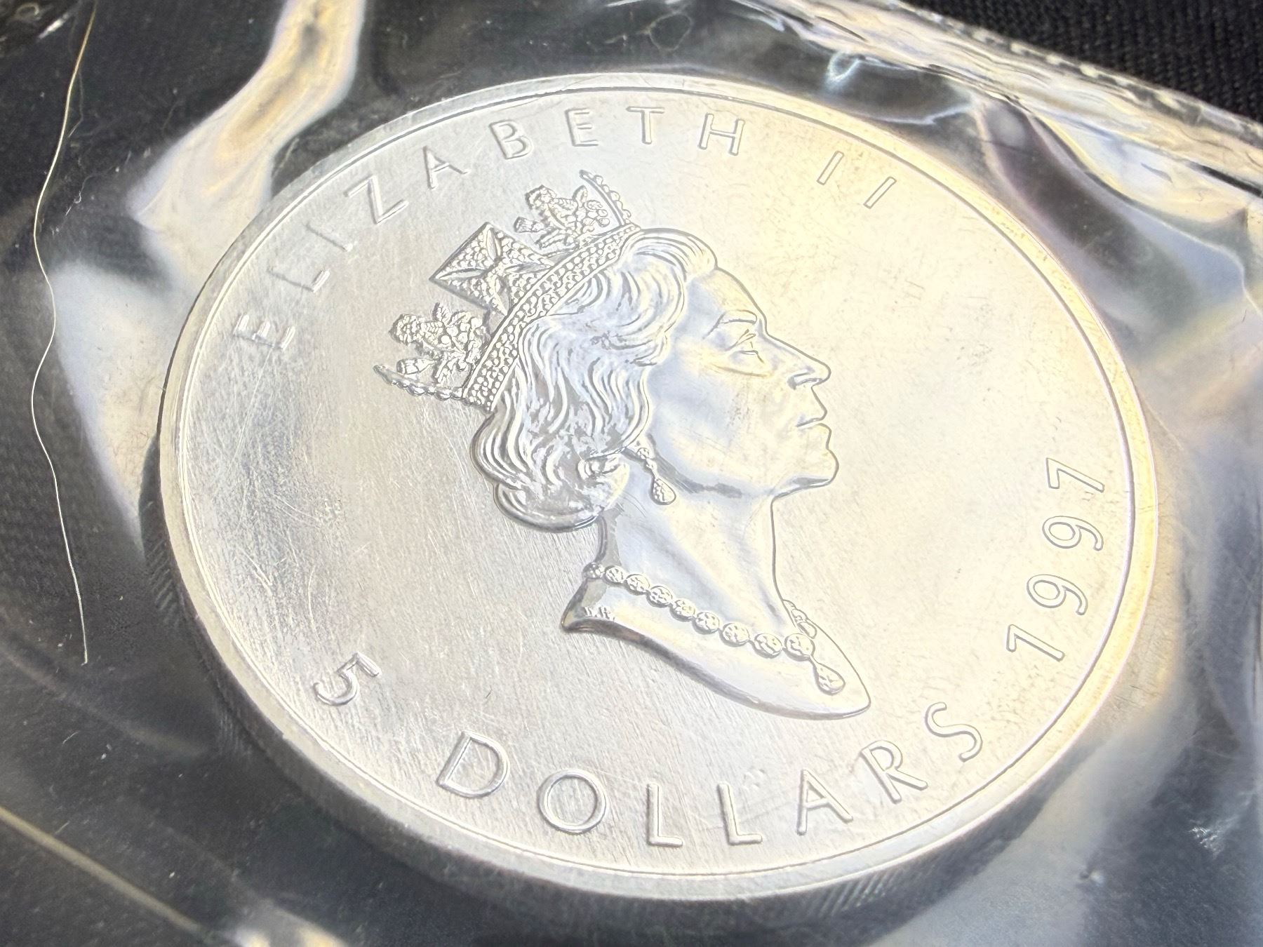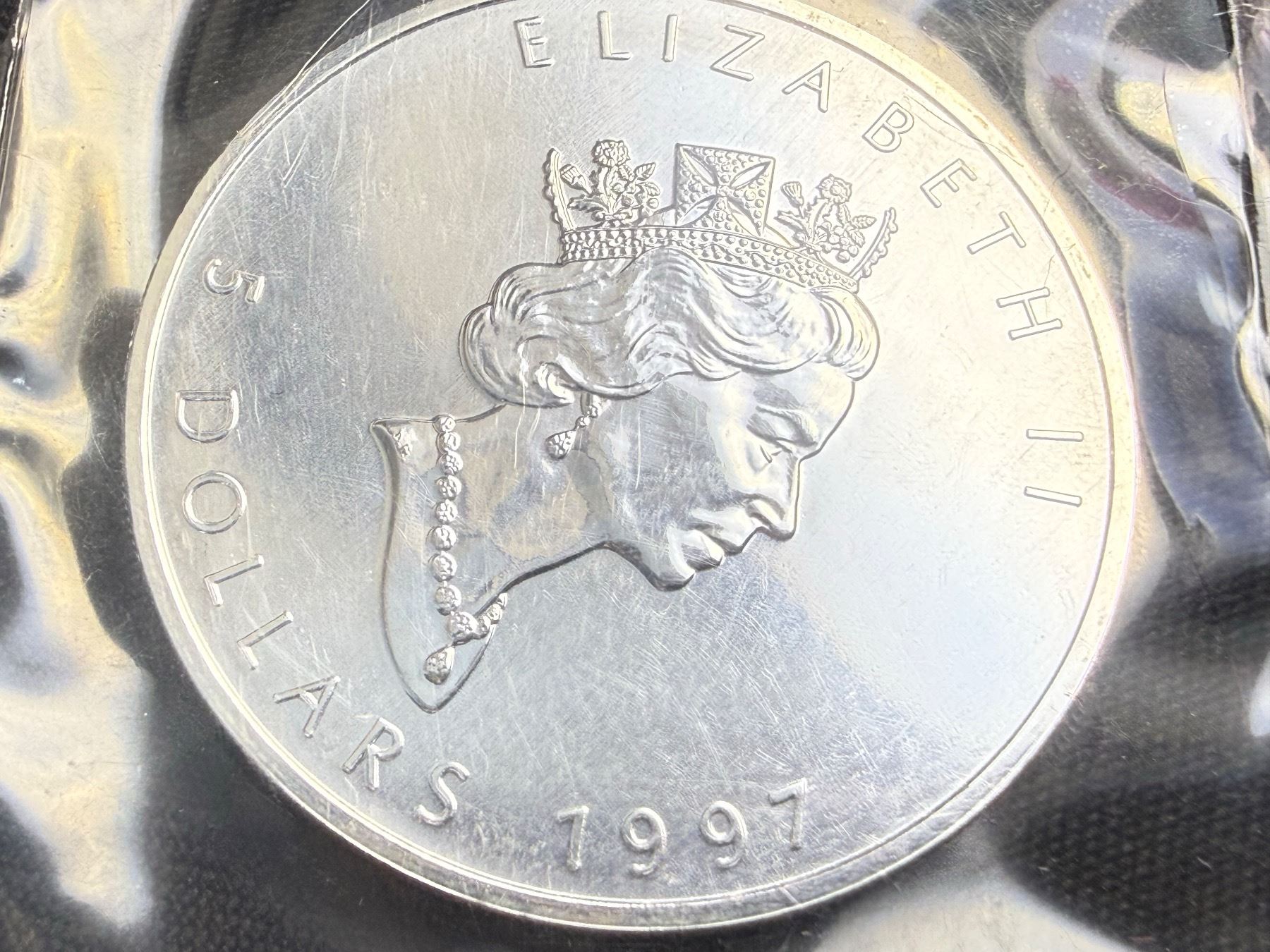 CANADIAN MAPLE LEAF $5 SILVER COIN - 1997; BRILLIANT UNCIRCULATED, IN ORIGINAL ROYAL CANADIAN MINT PACKAGING CUT FROM 10 PACK