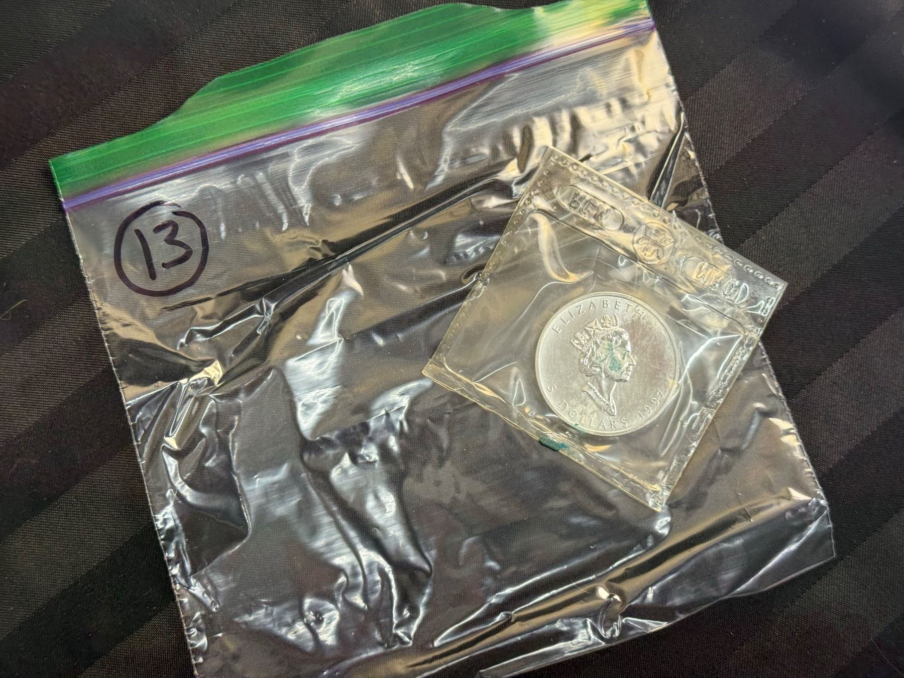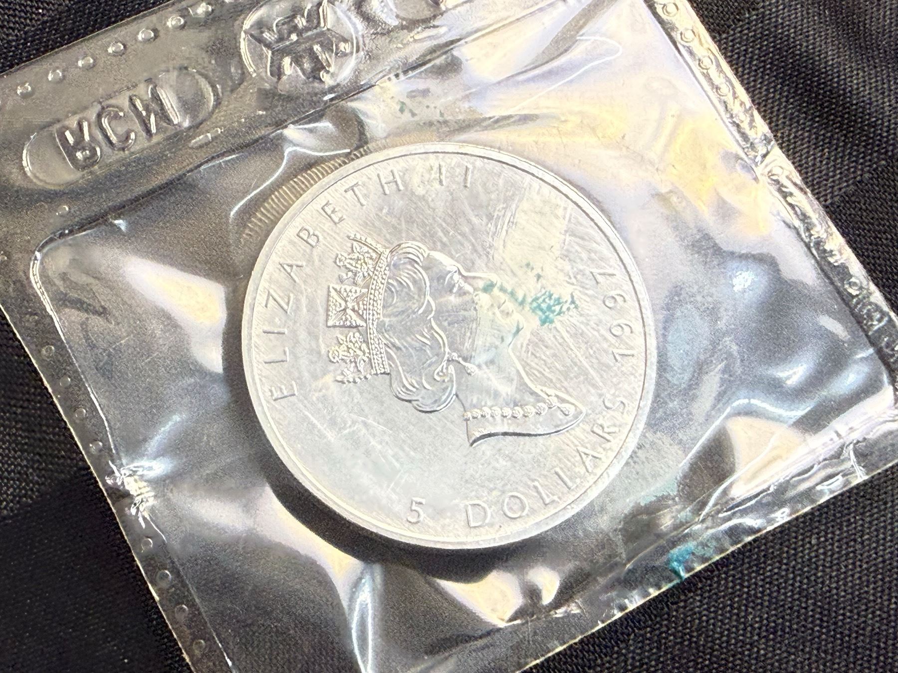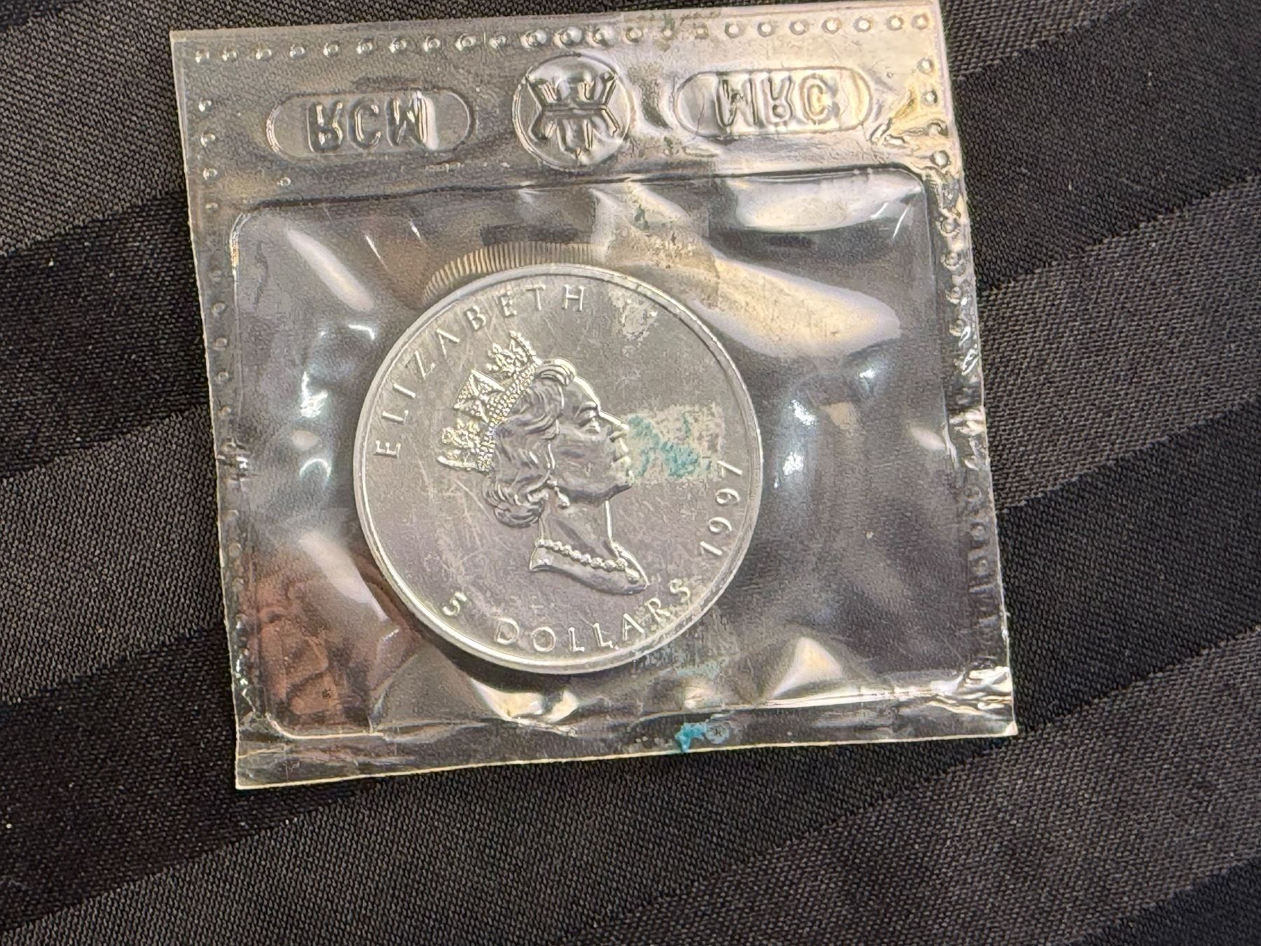 CANADIAN MAPLE LEAF $5 SILVER COIN - 1997; BRILLIANT UNCIRCULATED, IN ORIGINAL ROYAL CANADIAN MINT PACKAGING CUT FROM 10 PACK