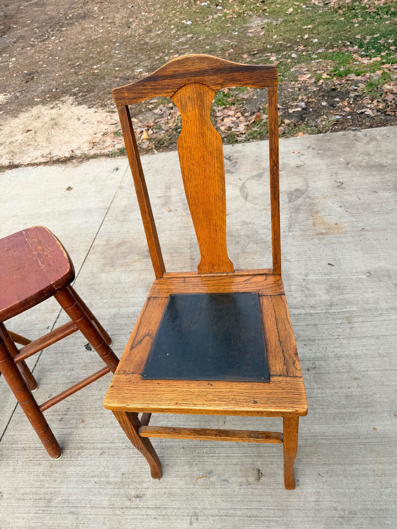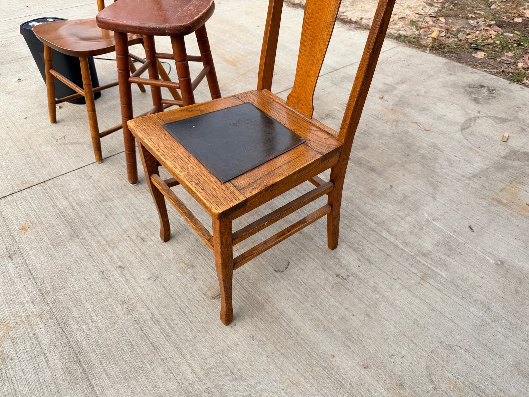 ONE CHAIR IS OAK WITH A LEATHER SEAT PAD