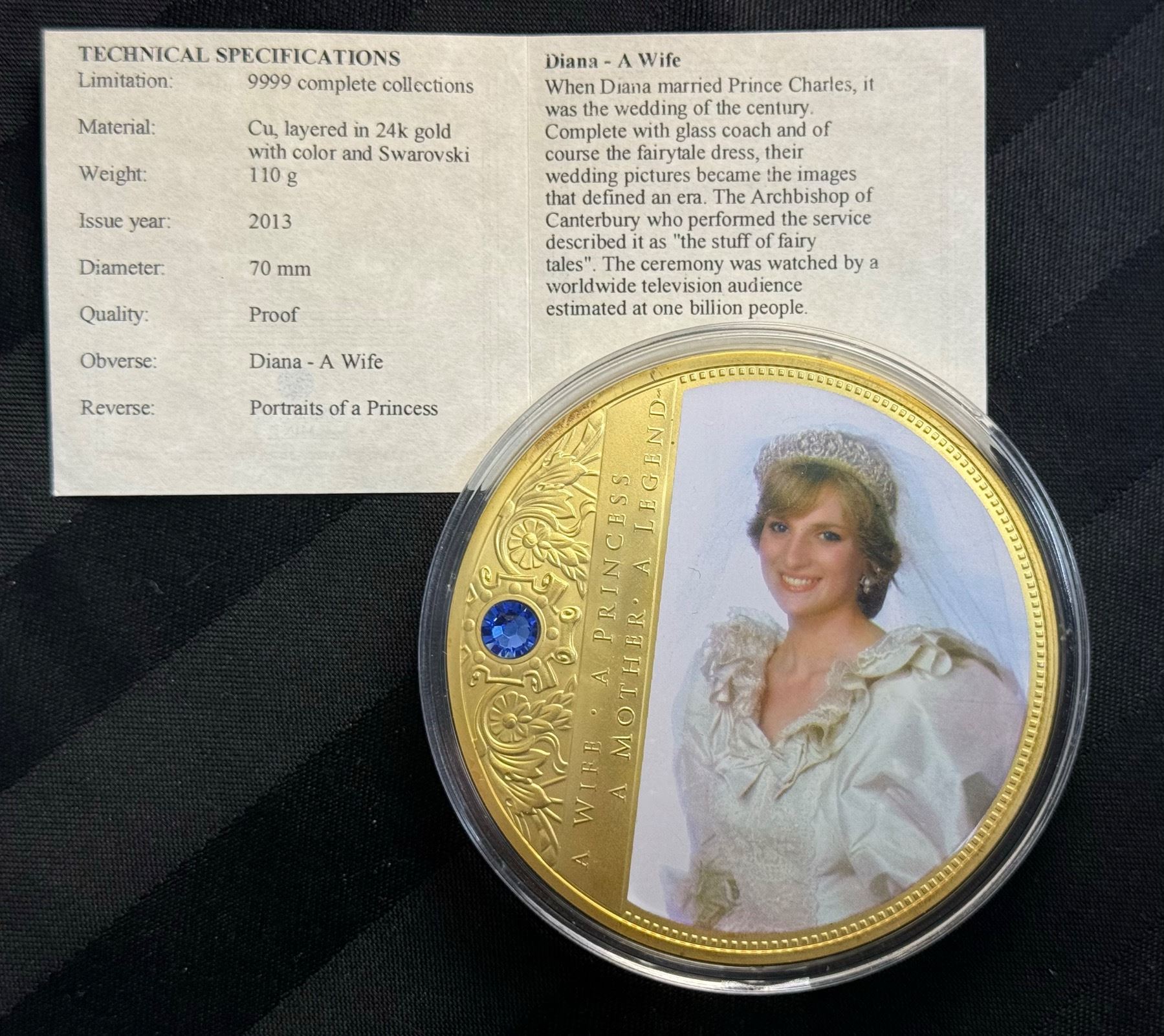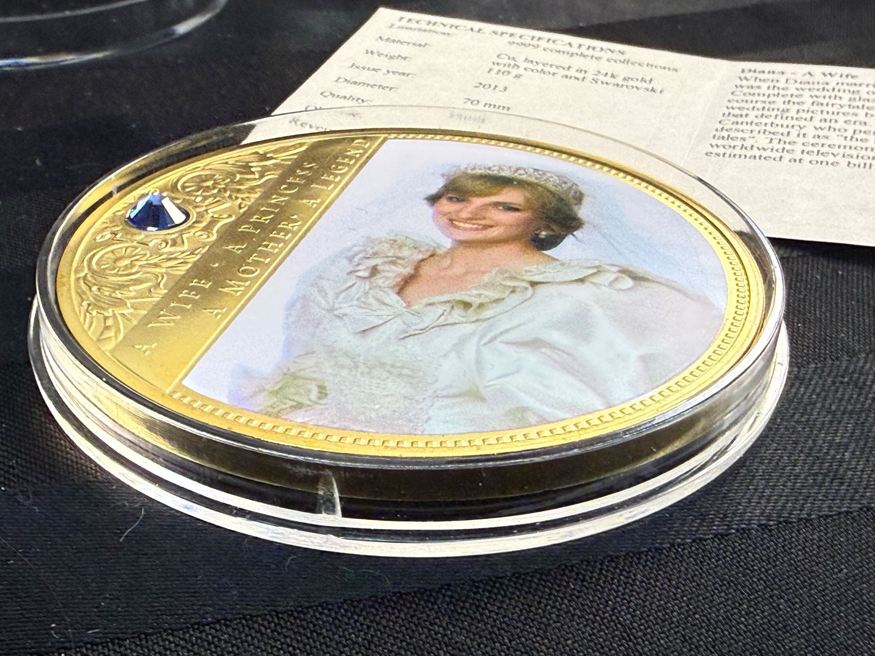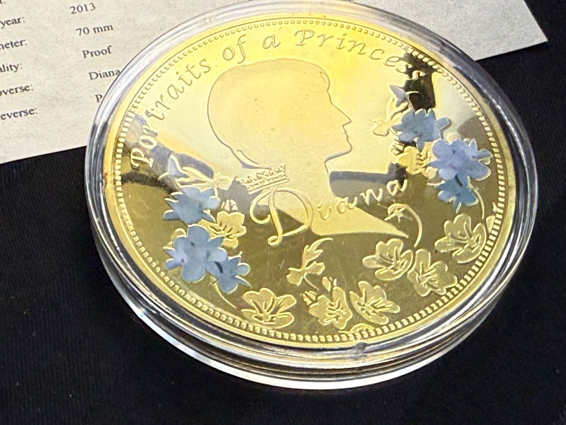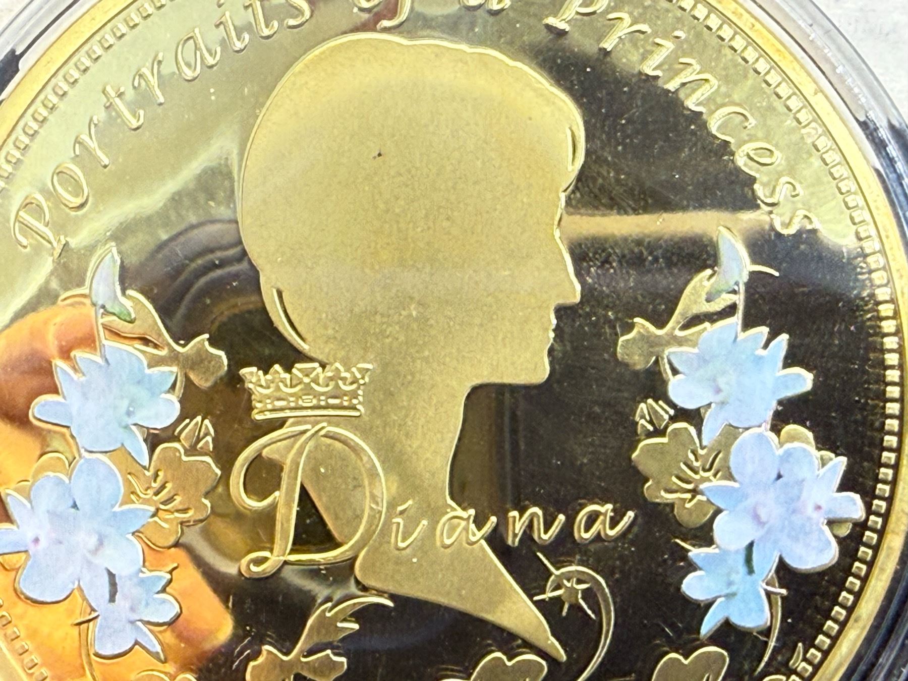 PORTRAIT OF A PRINCESS IS 2013 COMMEMORATIVE STRIKE COLLECTION; 24K GOLD LAYERED OVER COPPER, HAS A SWAROVSKI CRYSTAL, AN IMAGE OF PRINCESS DIANA, AND IS COLORIZED; 110 GRAMS, 70 MM (2.75 IN)