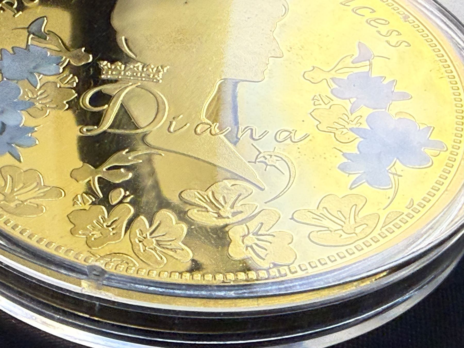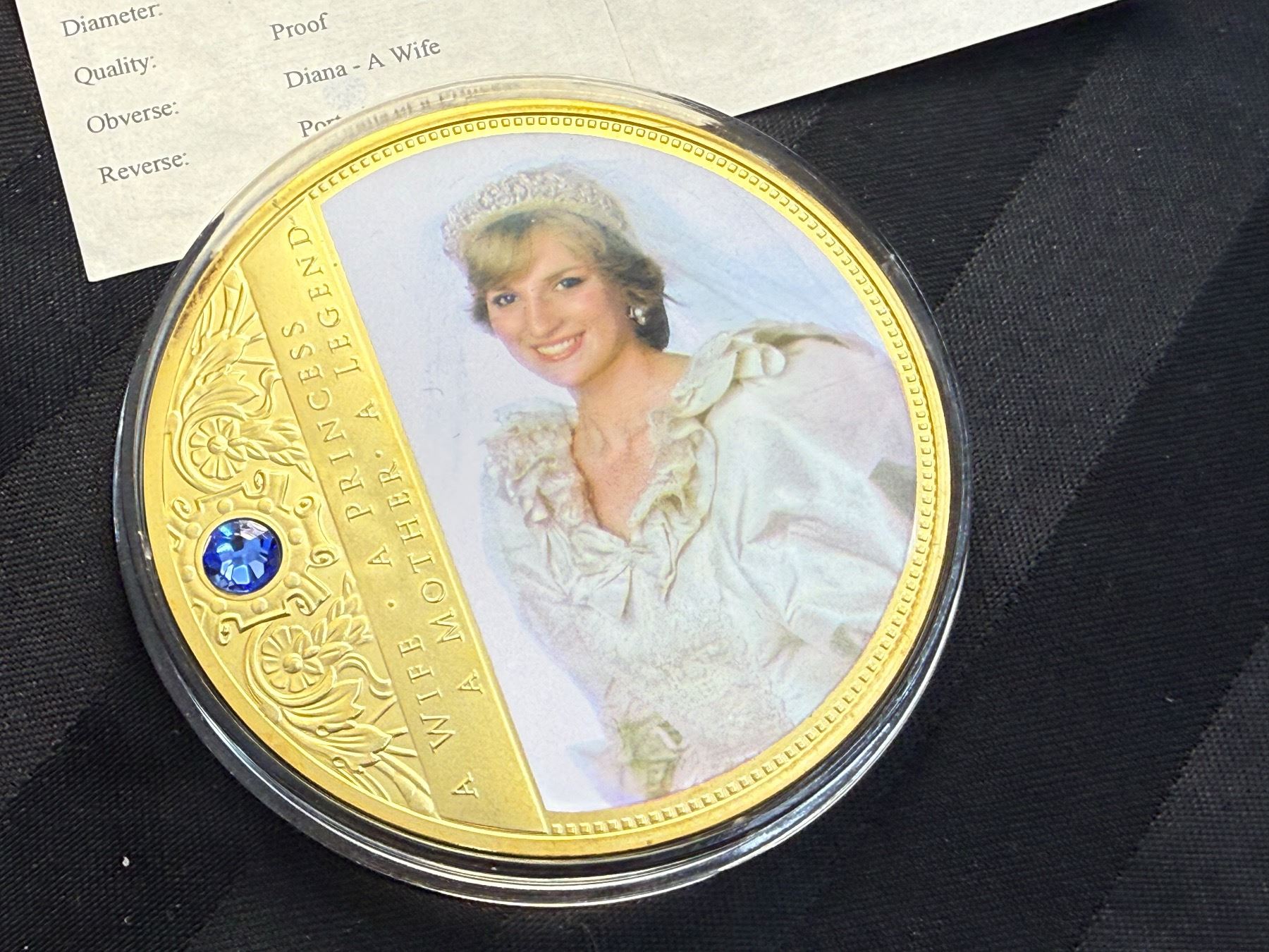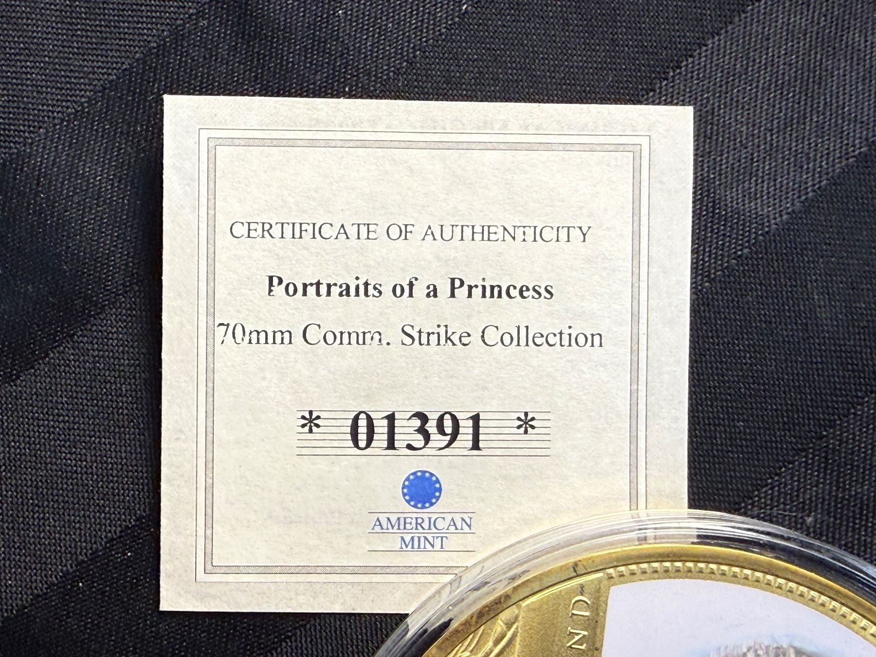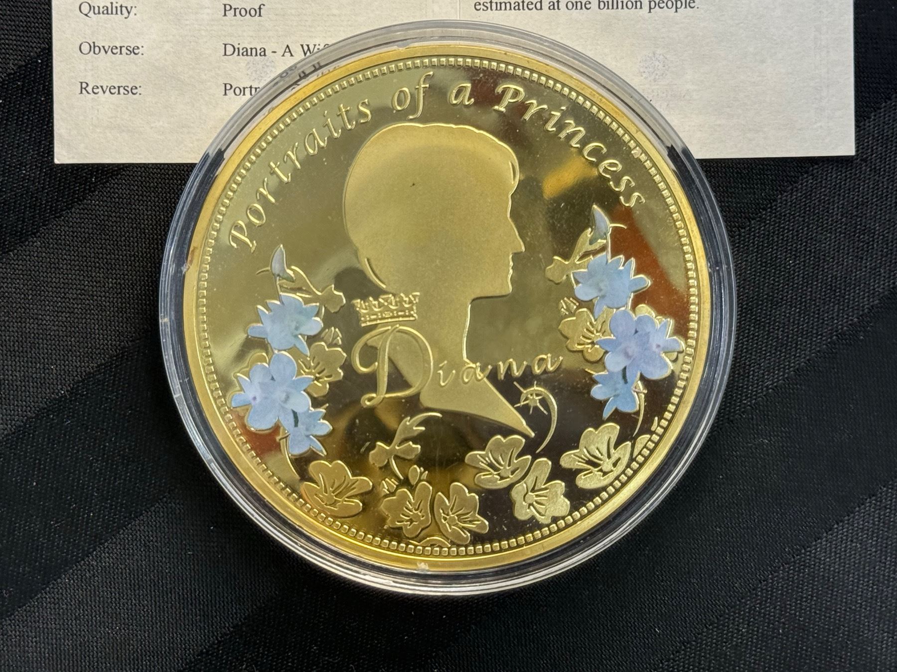 PORTRAIT OF A PRINCESS IS 2013 COMMEMORATIVE STRIKE COLLECTION; 24K GOLD LAYERED OVER COPPER, HAS A SWAROVSKI CRYSTAL, AN IMAGE OF PRINCESS DIANA, AND IS COLORIZED; 110 GRAMS, 70 MM (2.75 IN)