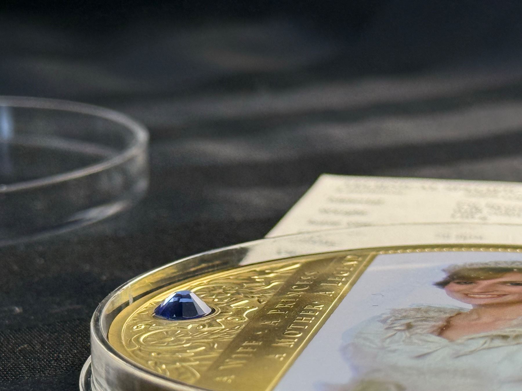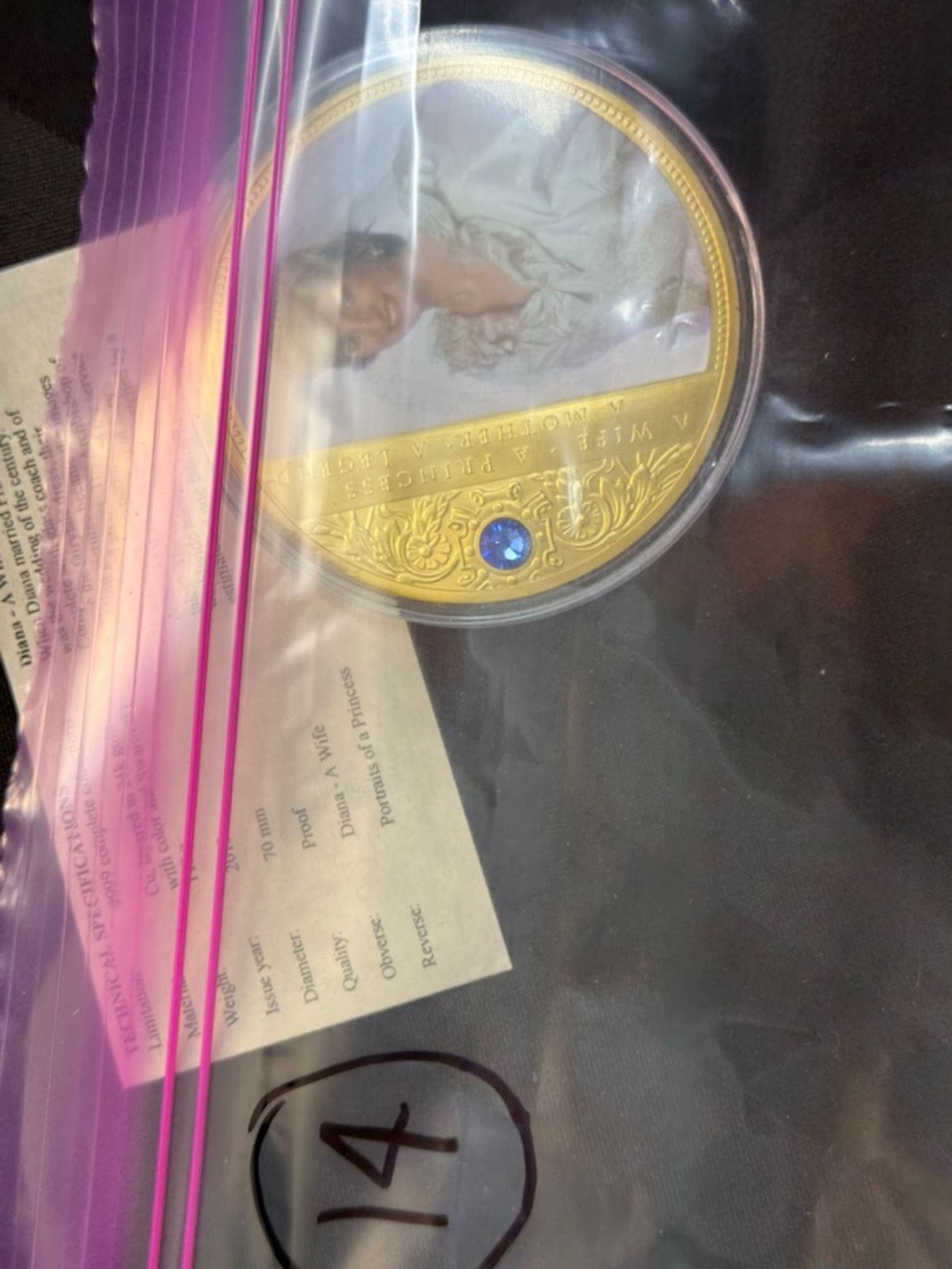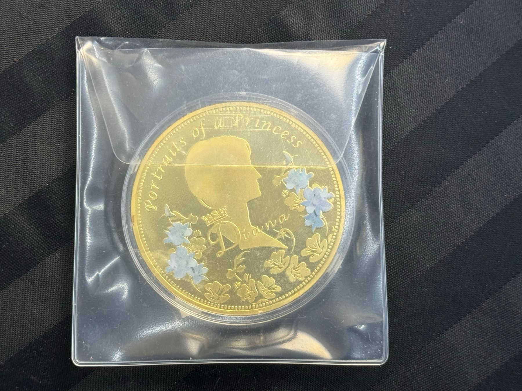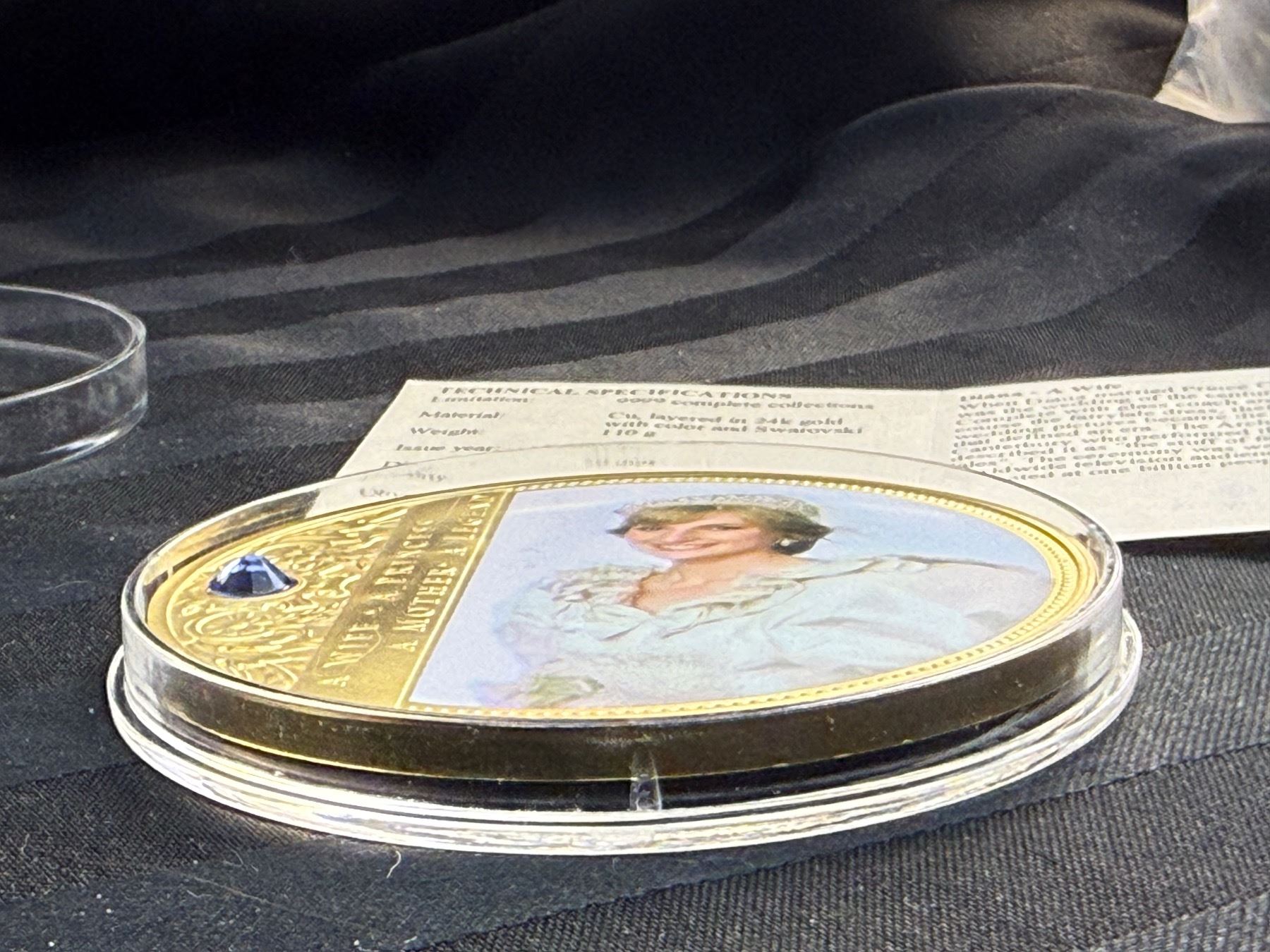 PORTRAIT OF A PRINCESS IS 2013 COMMEMORATIVE STRIKE COLLECTION; 24K GOLD LAYERED OVER COPPER, HAS A SWAROVSKI CRYSTAL, AN IMAGE OF PRINCESS DIANA, AND IS COLORIZED; 110 GRAMS, 70 MM (2.75 IN)
