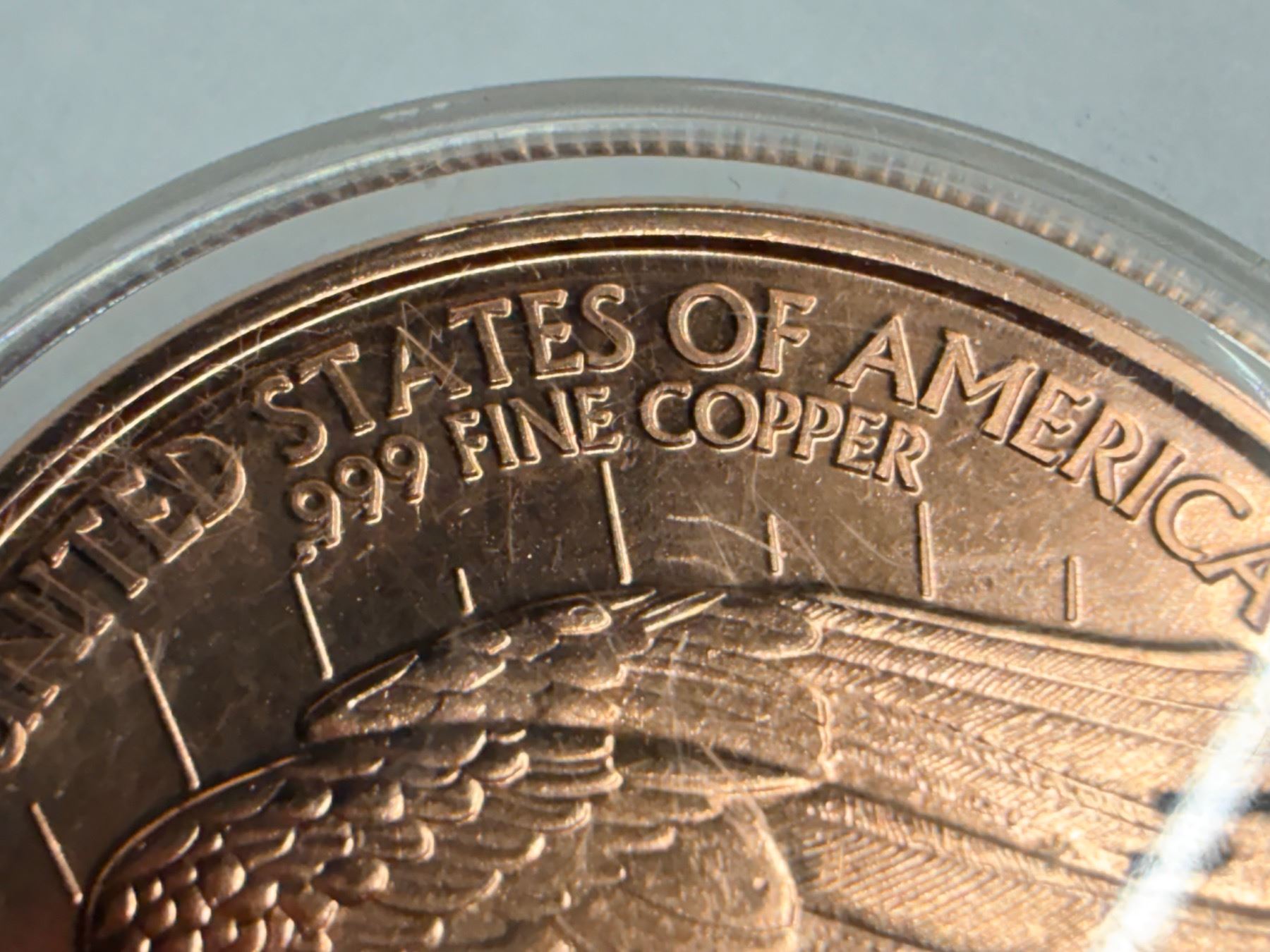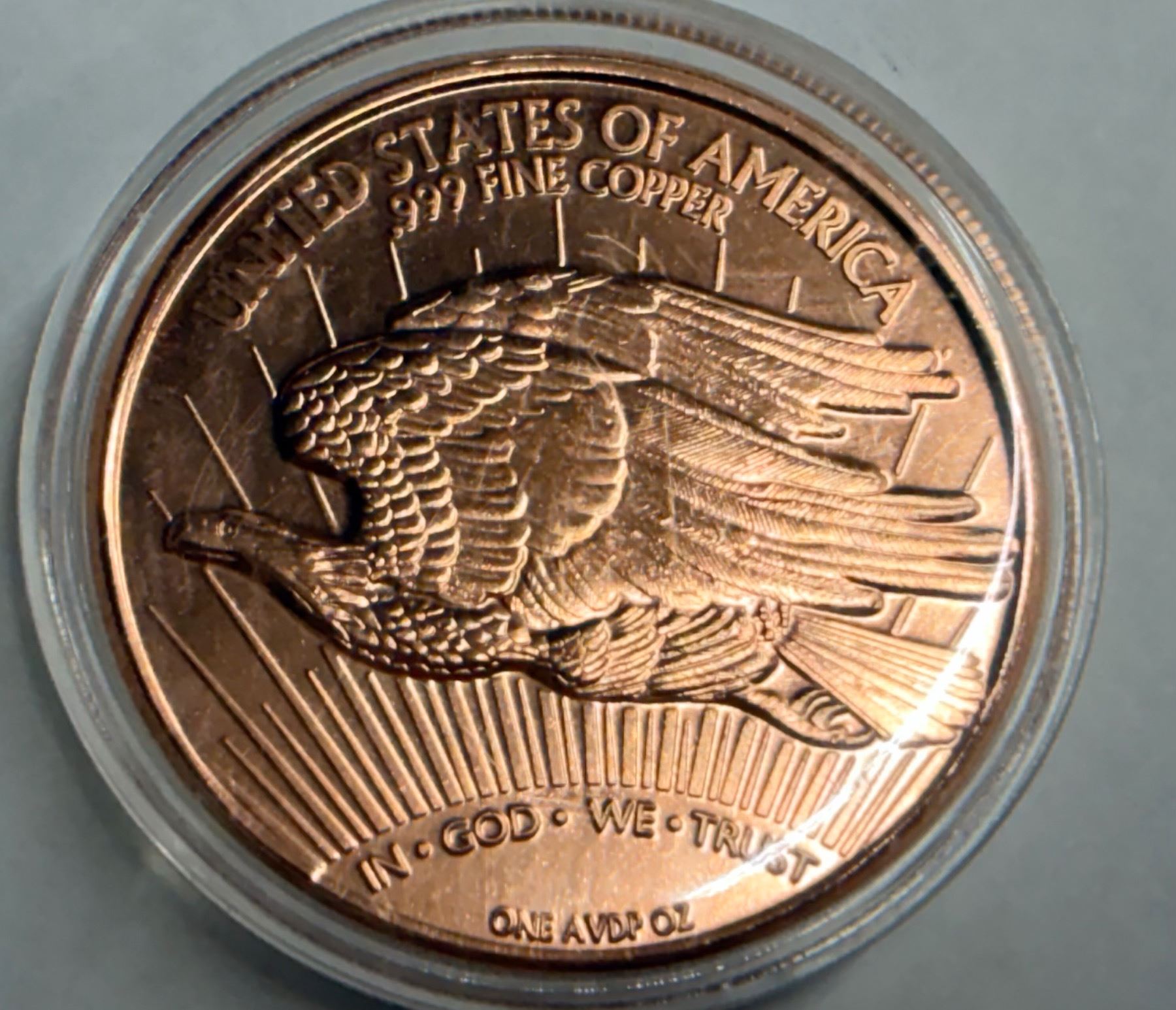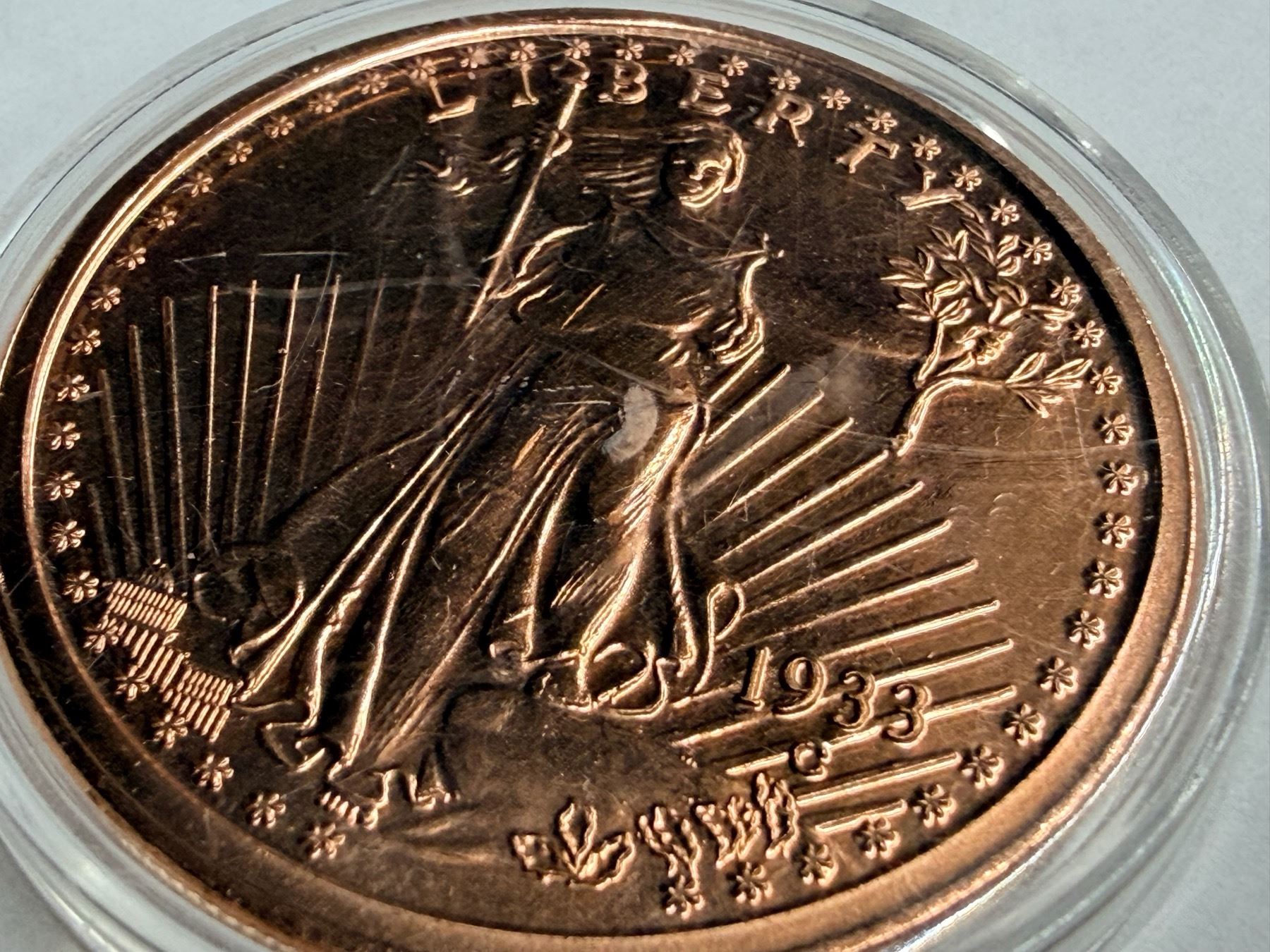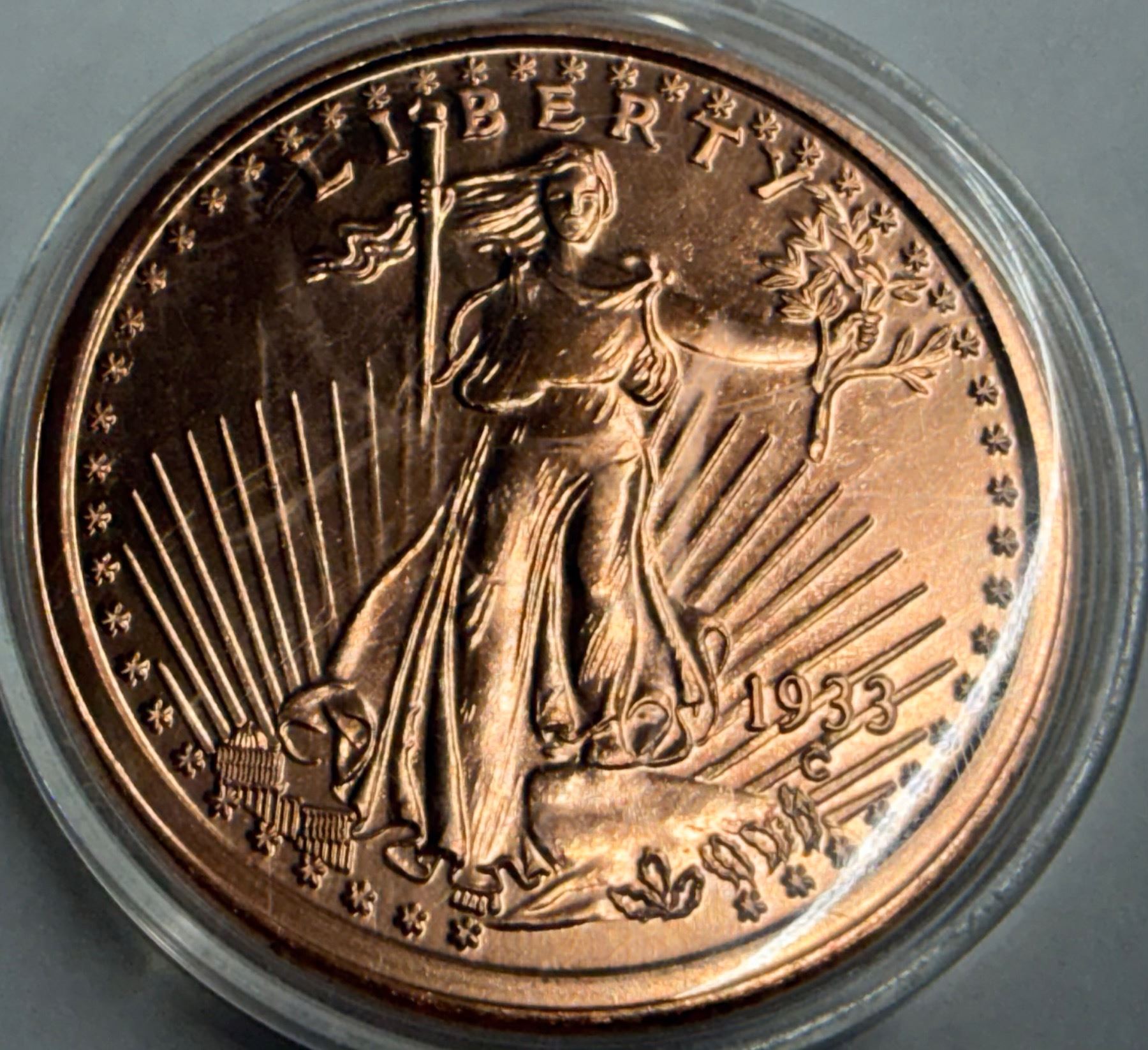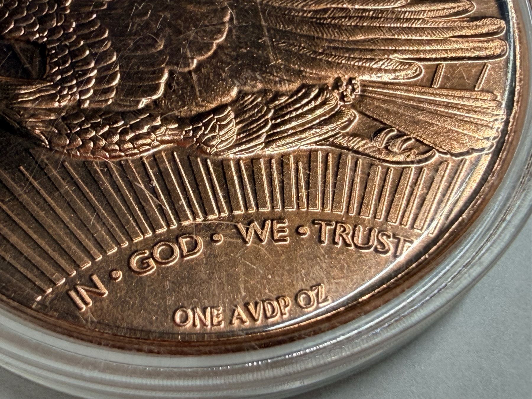 COPPER BULLION ROUND - 1 AVDP OUNCE .999 FINE COPPER SAINT GAUDENS $20 REPLICA IN COPPER BULLION; THE AVOIRDUPOIS OUNCE (AVDP OUNCE) IS A UNIT OF MEASUREMENT THAT WEIGHS APPROXIMATELY 28.35 GRAMS
