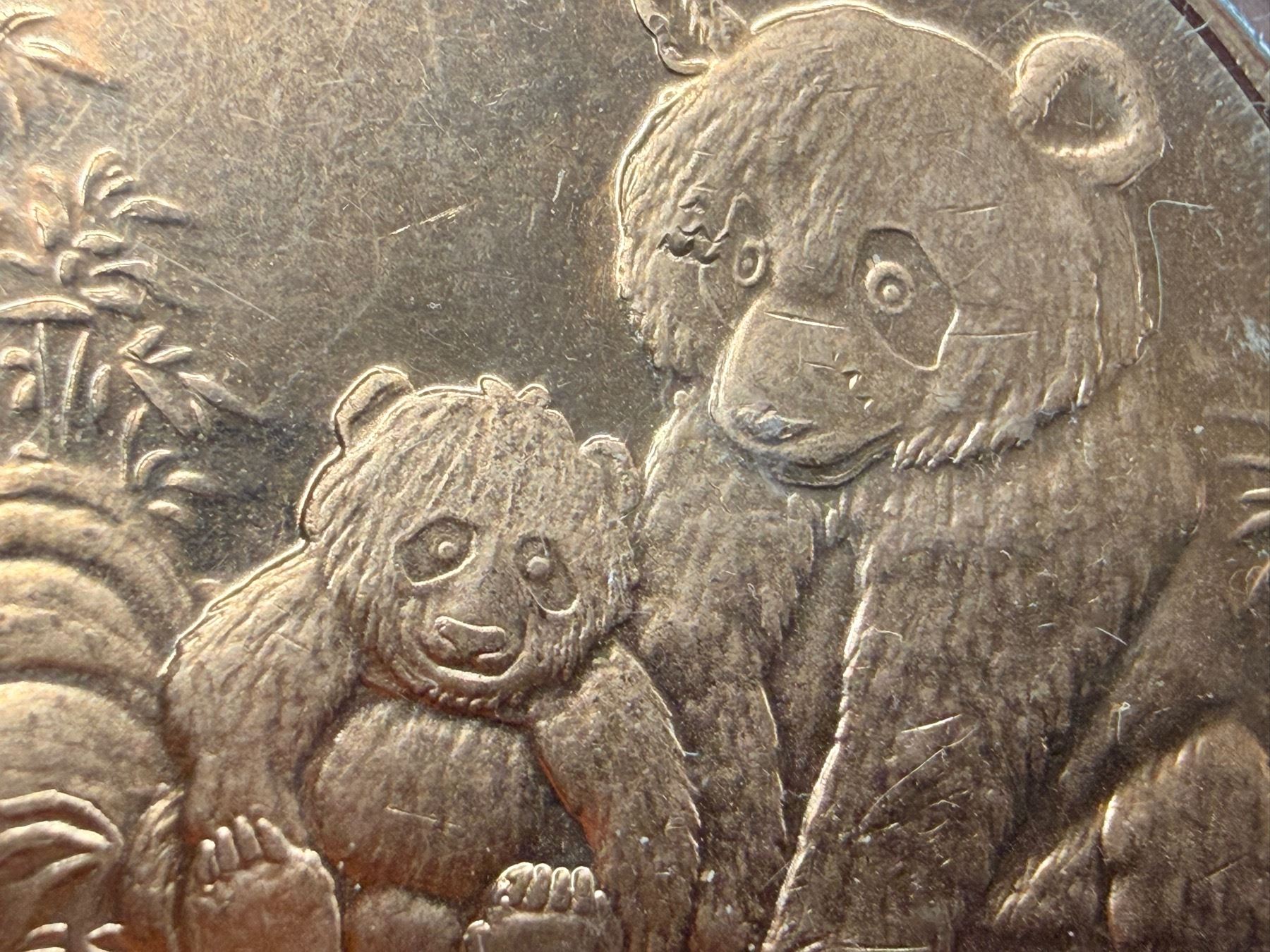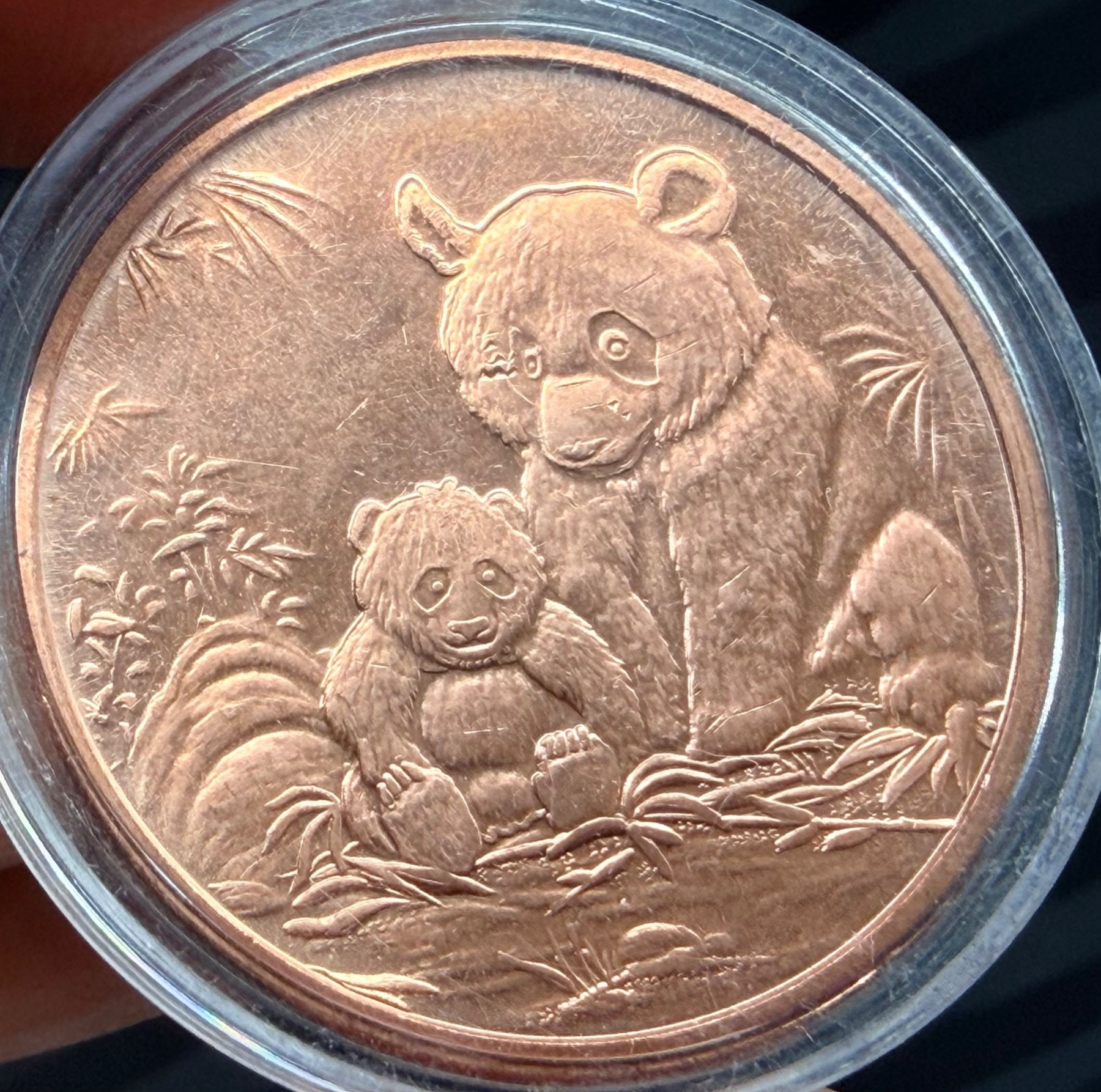 INSPIRED BY THE CHINESE PANDA GOLD AND SILVER COINS, THIS COPPER ROUND FEATURES THE MOTHER AND HER CUB; PANDAS SYMBOLIZE PEACE, HARMONY, AND FRIENDSHIP, FREQUENTLY SERVING AS GOODWILL AMBASSADORS FOR CHINA; THEY REPRESENT A BALANCE OF OPPOSING FORCES (YIN AND YANG) AND EMBODY GENTLE STRENGTH, PATIENCE, AND A CALM, LEISURELY APPROACH TO LIFE; PANDAS ALSO SYMBOLIZE ENVIRONMENTAL CONSERVATION AND QUIET, INNER RESILIENCE; IN PROTECTIVE PLASTIC CAPSULE