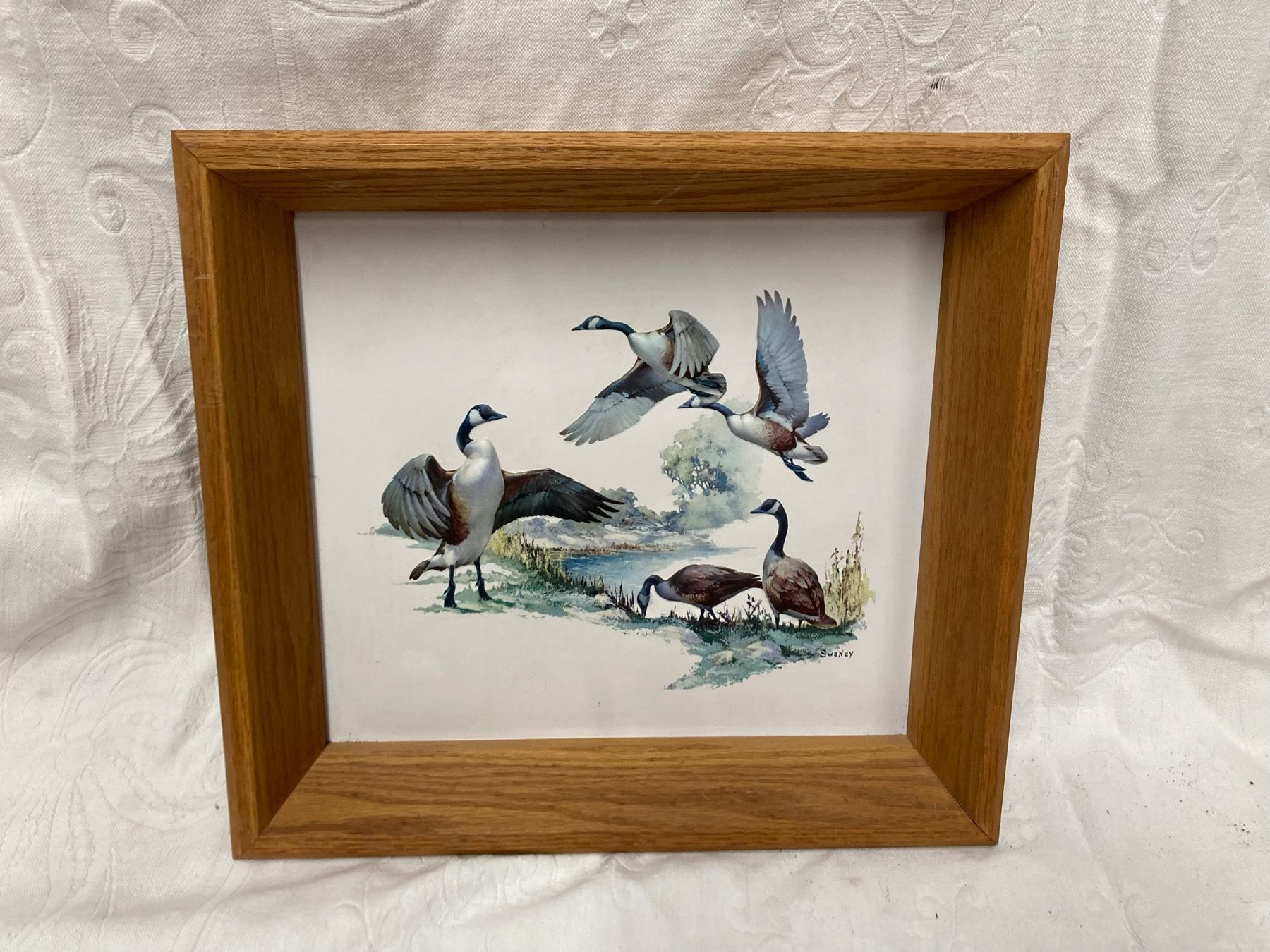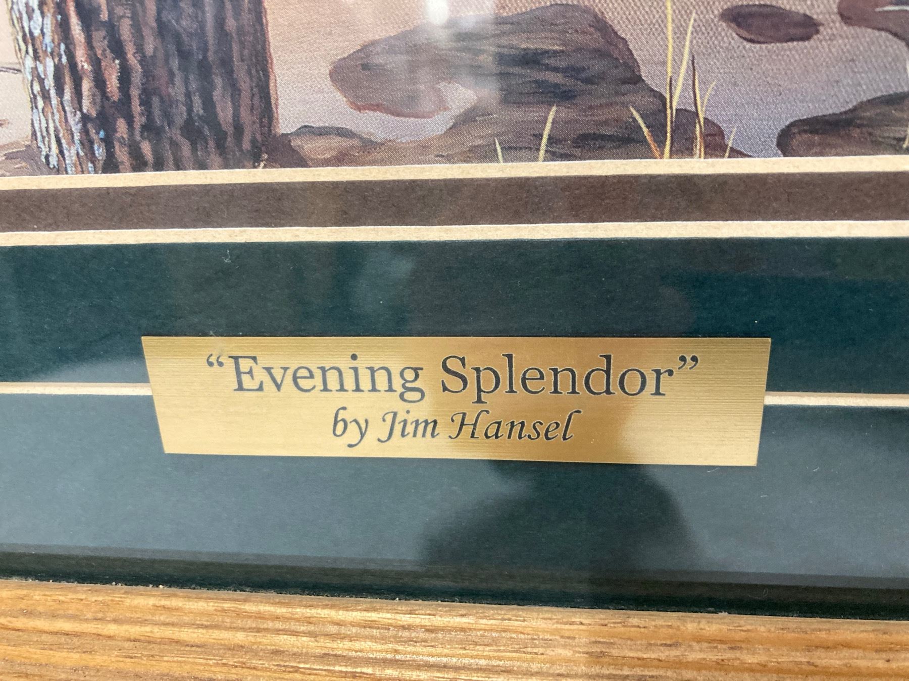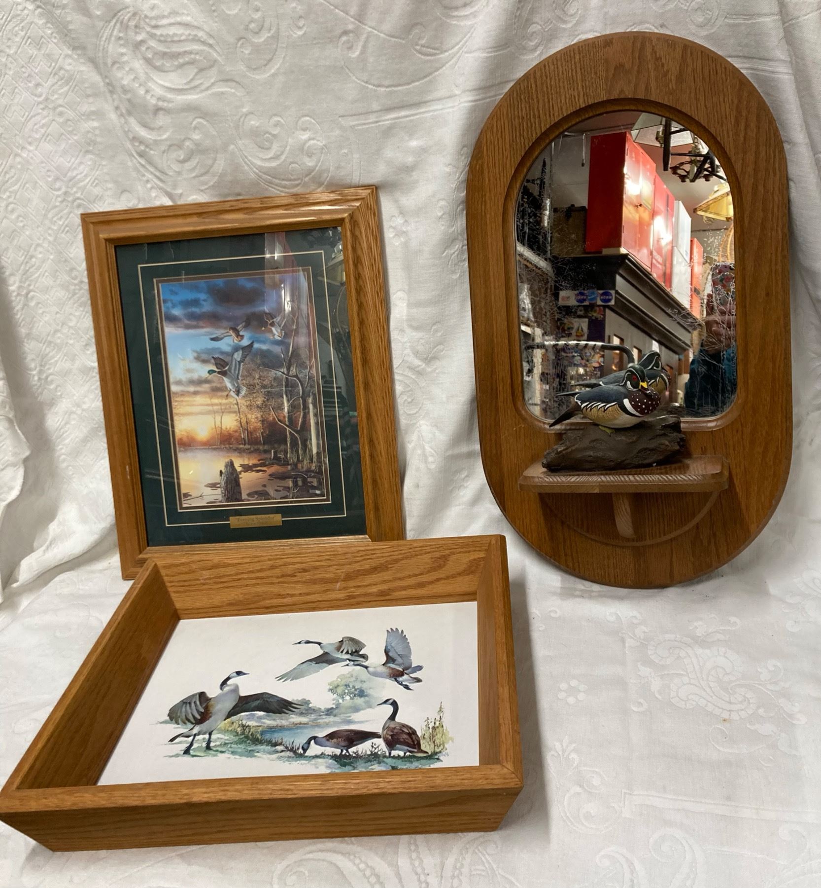 "EVENING SPLENDOR" BY AMERICAN WILDLIFE ARTIST JIM HANSEL; FRAMED ART PRINT OF CANADA GEESE BY THE ARTIST FRED SWENEY; FROSTED GLASS MIRROR WITH DUCK DECOY