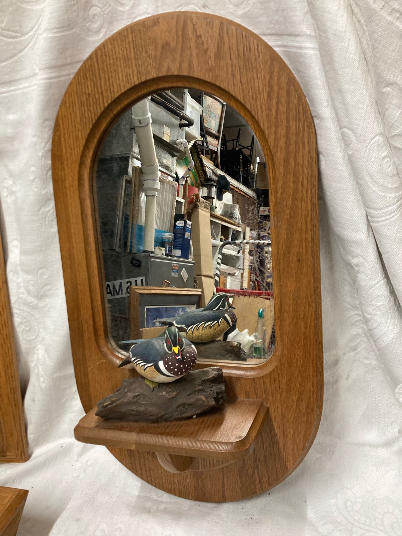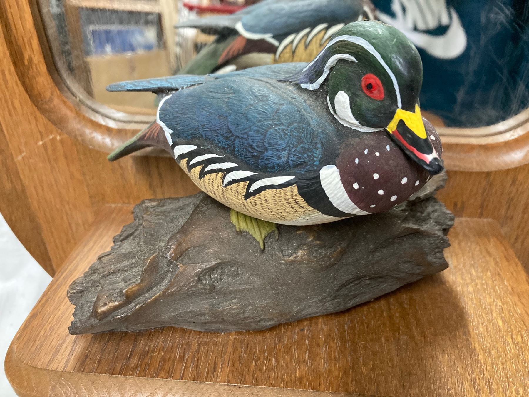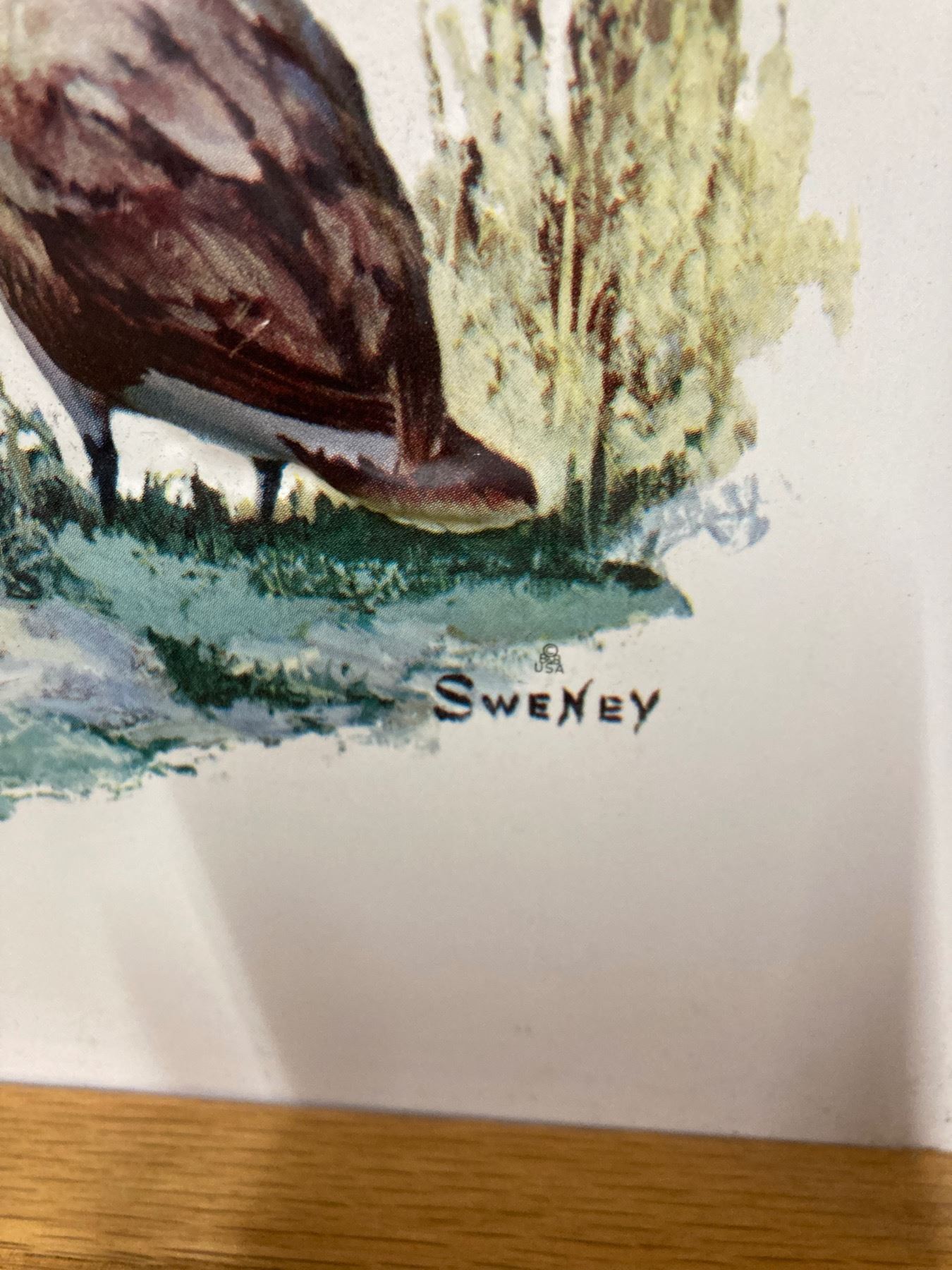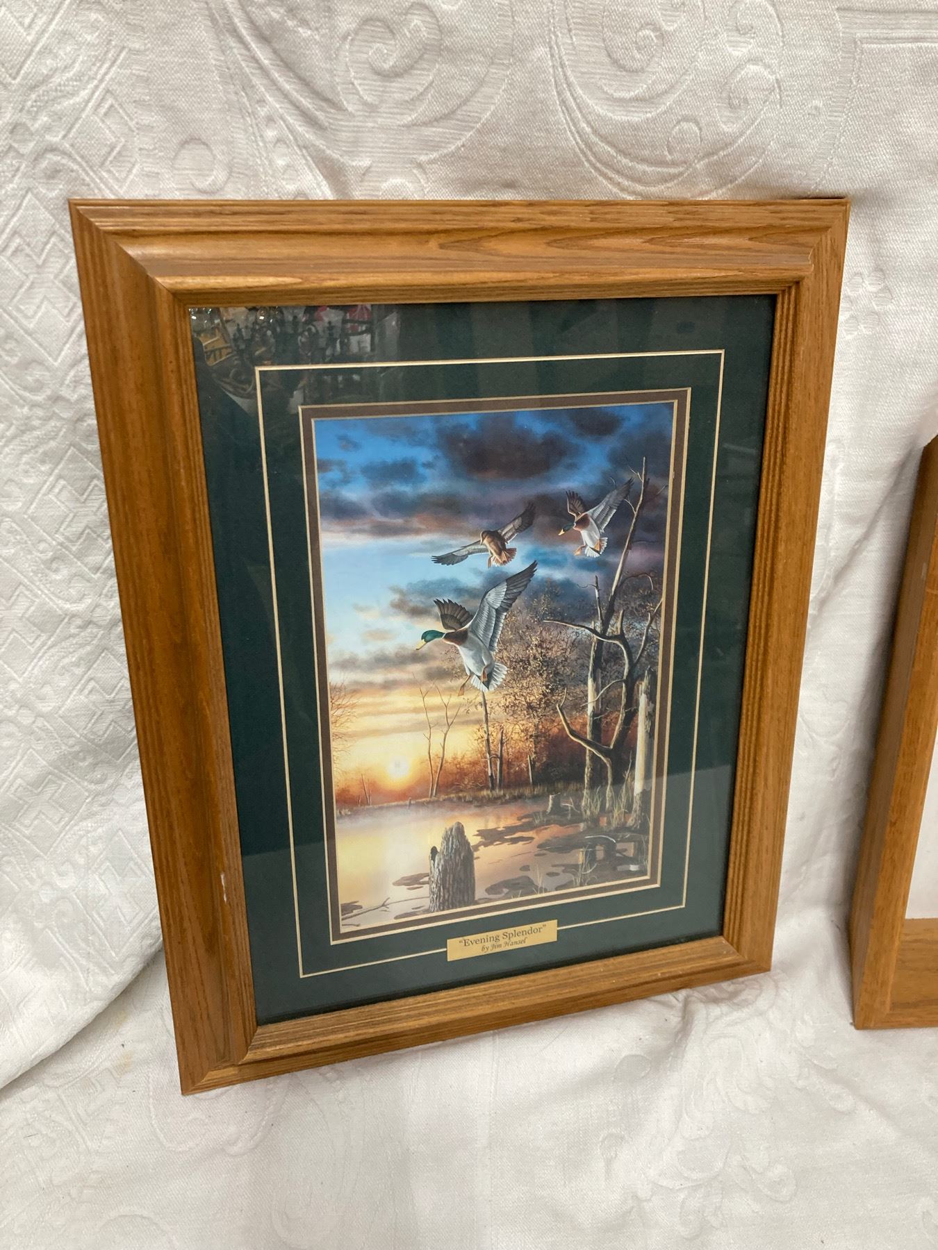 "EVENING SPLENDOR" BY AMERICAN WILDLIFE ARTIST JIM HANSEL; FRAMED ART PRINT OF CANADA GEESE BY THE ARTIST FRED SWENEY; FROSTED GLASS MIRROR WITH DUCK DECOY