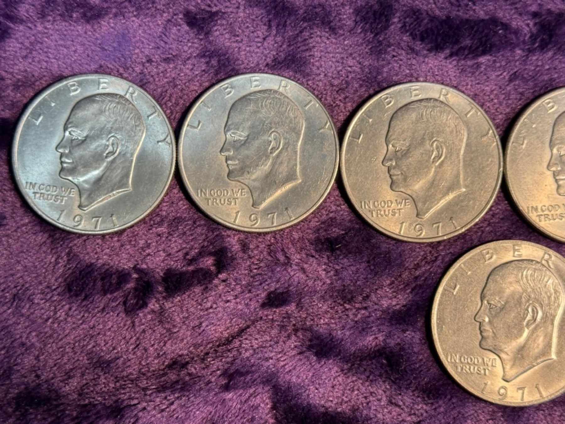 VARIOUS MINTS, SEE PICTURES; EISENHOWER DOLLARS WERE MINTED FROM 1971-1978 WITH A DESIGN CHANGE FOR THE BICENTENNIAL COMMEMORATION; SAN FRANCISCO MINT EISENHOWER DOLLARS FROM 1971-1976 ARE 40 PERCENT SILVER AND 60 PERCENT COPPER