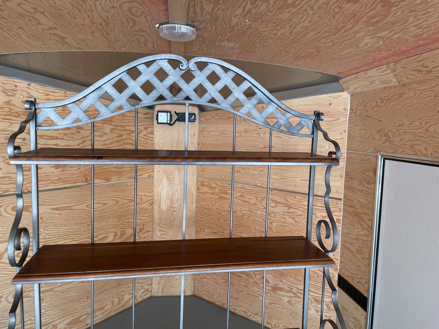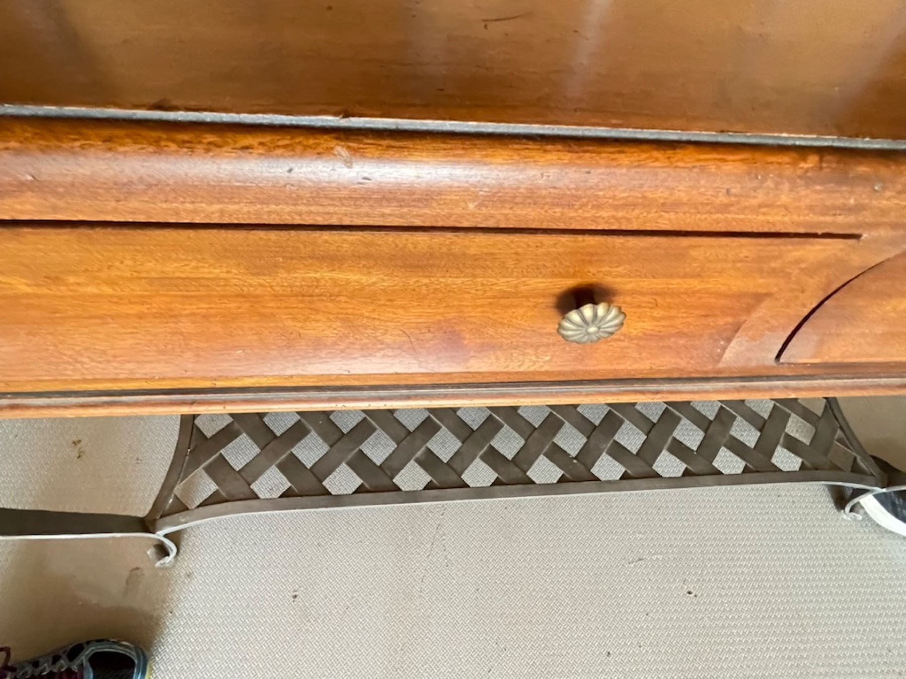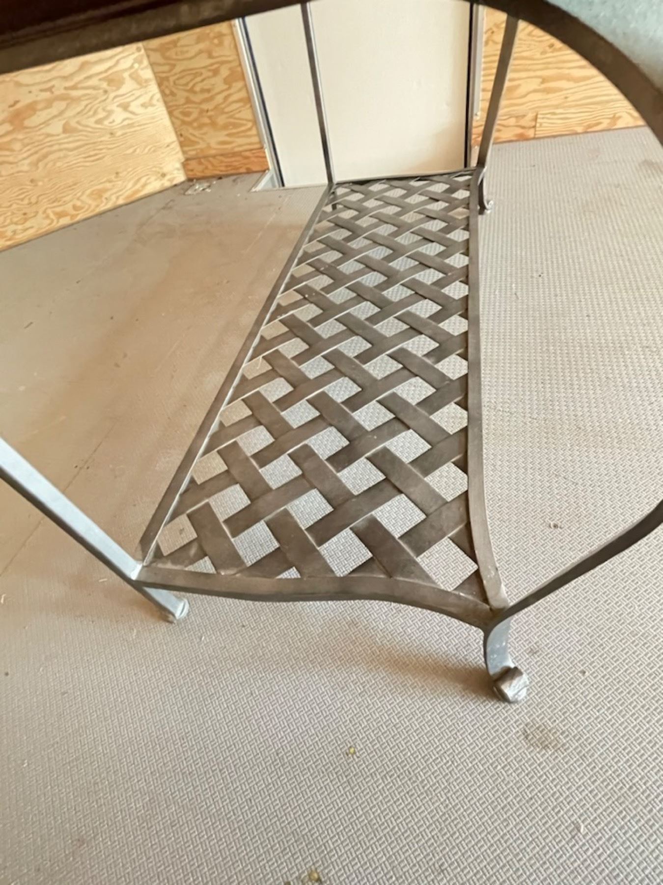 IMAGINE COOLING YOUR MACRONS, BREAD, OR PIES ON THIS BEAUTIFUL PIECE! THIS STYLISH AND VERY DETAILED RACK IS FRAMED WITH WROUGHT IRON THAT GIVES THE IMPRESSION OF BEING WOVEN AND INCLUDES SOLID MAPLE WOOD BASE AND TWO SHELVES; THIS RACK FEATURES A DECORATIVE ARCHED TOP, SCROLLED SIDES, CROSS STYLED CONSOLE, AND TWO CLEAN AND FULLY FUNCTIONAL DRAWERS; THIS ITEM WAS MANUFACTURED IN THE EARLY 2000S AND IS FACTORY DISTRESSED TO ADD CHARACTER AND CHARM TO THIS COUNTRY FRENCH COLLECTION; THIS RACK IS VERY CLEAN AND WAS WELL CARED FOR OVER THE YEARS AND IS IN EXCELLENT CONDITION