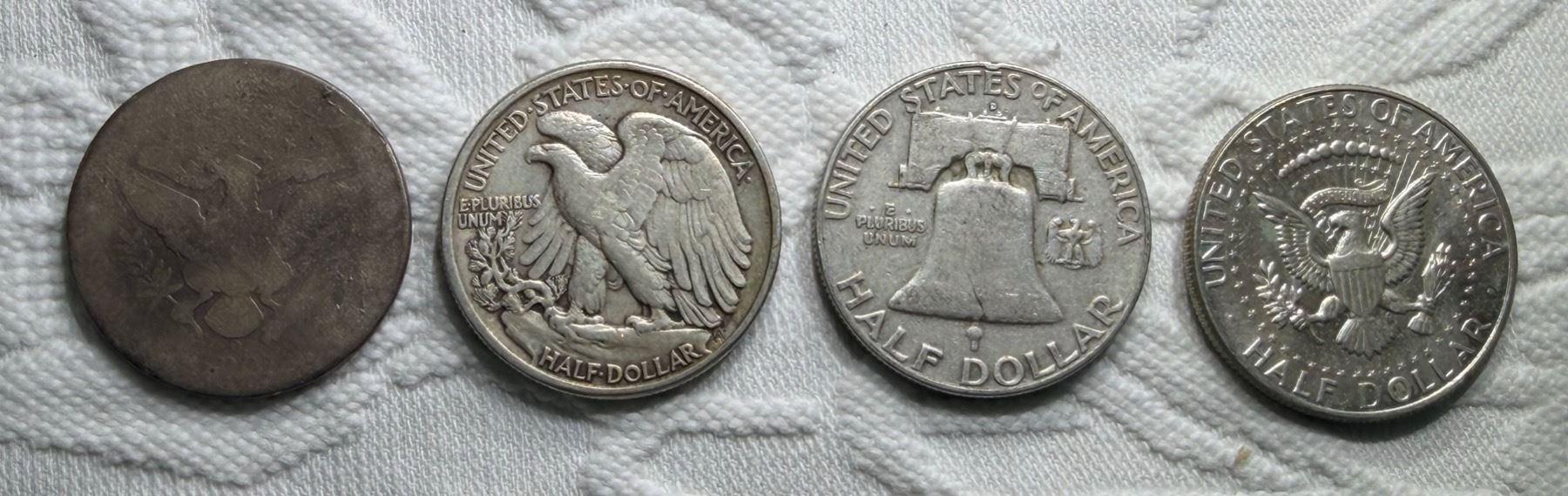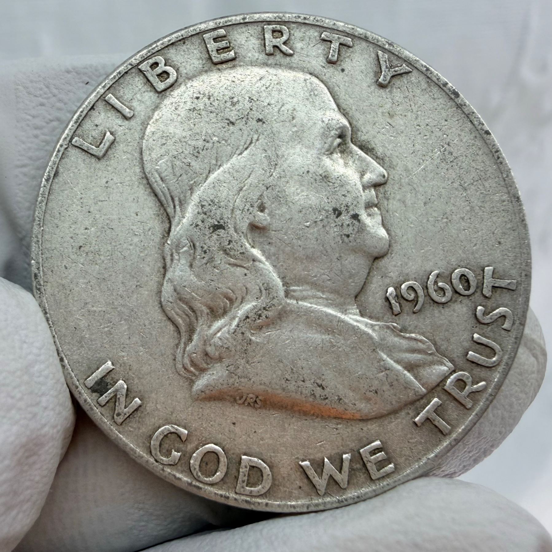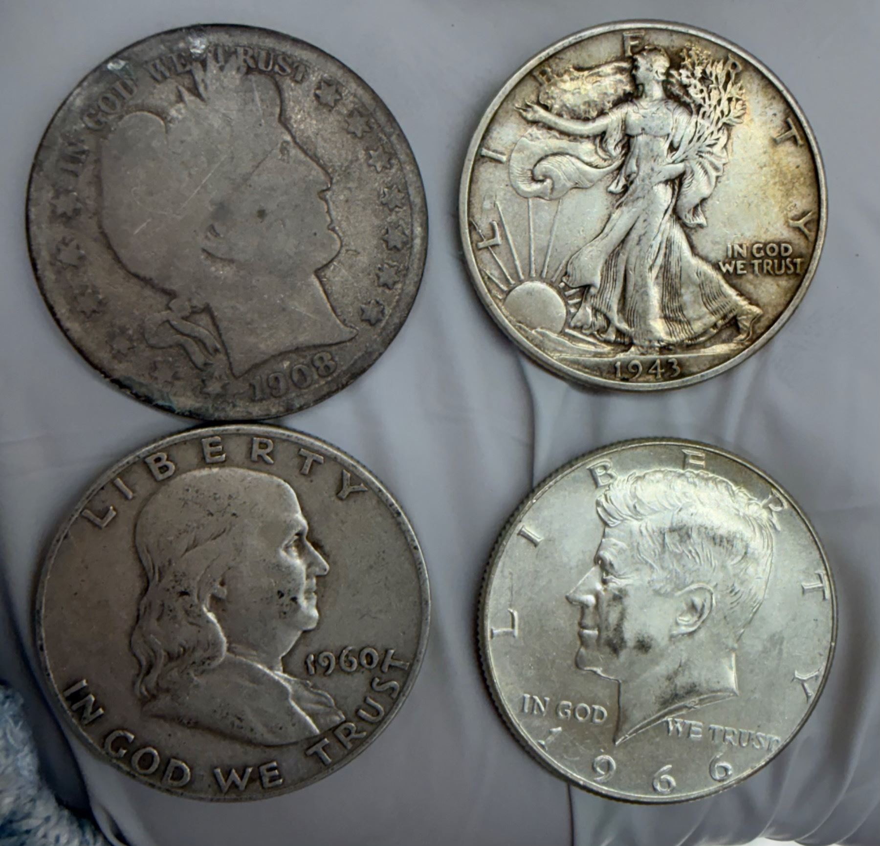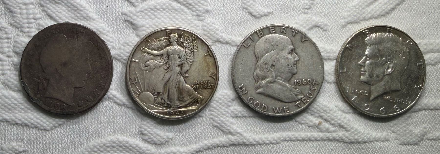 BARBER SILVER HALF DOLLAR - 1908O - NEW ORLEANS MINT; WALKING LIBERTY SILVER HALF DOLLAR, 1943 - PHILADELPHIA MINT; BEN FRANKLIN SILVER HALF DOLLAR, 1960D - DENVER MINT; KENNEDY SILVER HALF DOLLAR, 1966