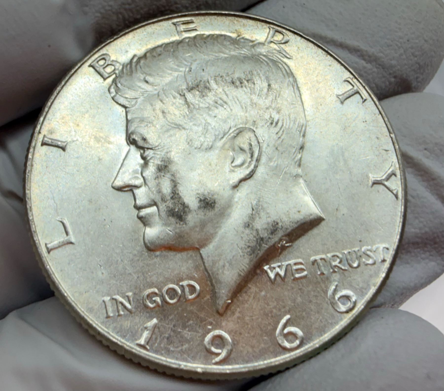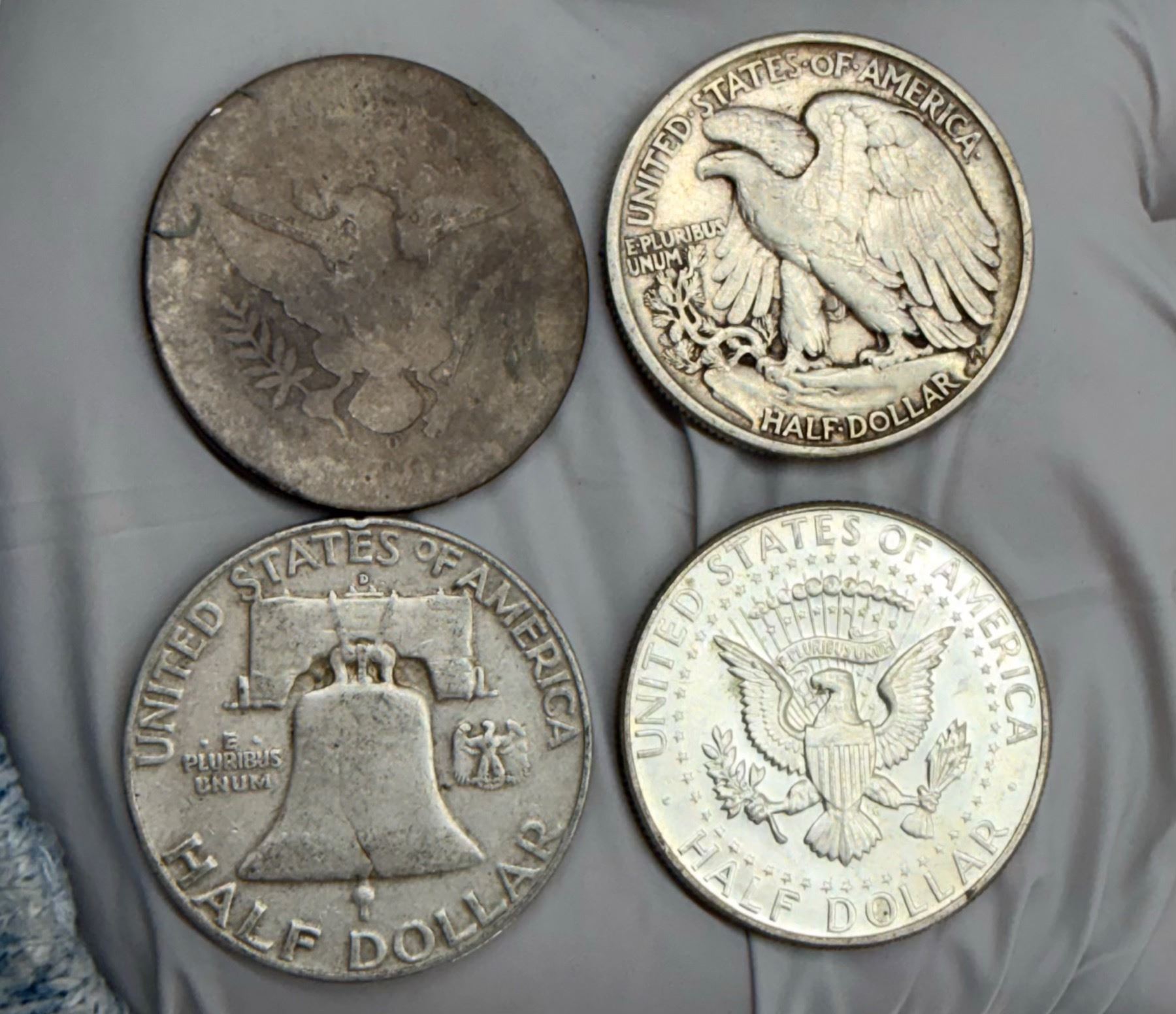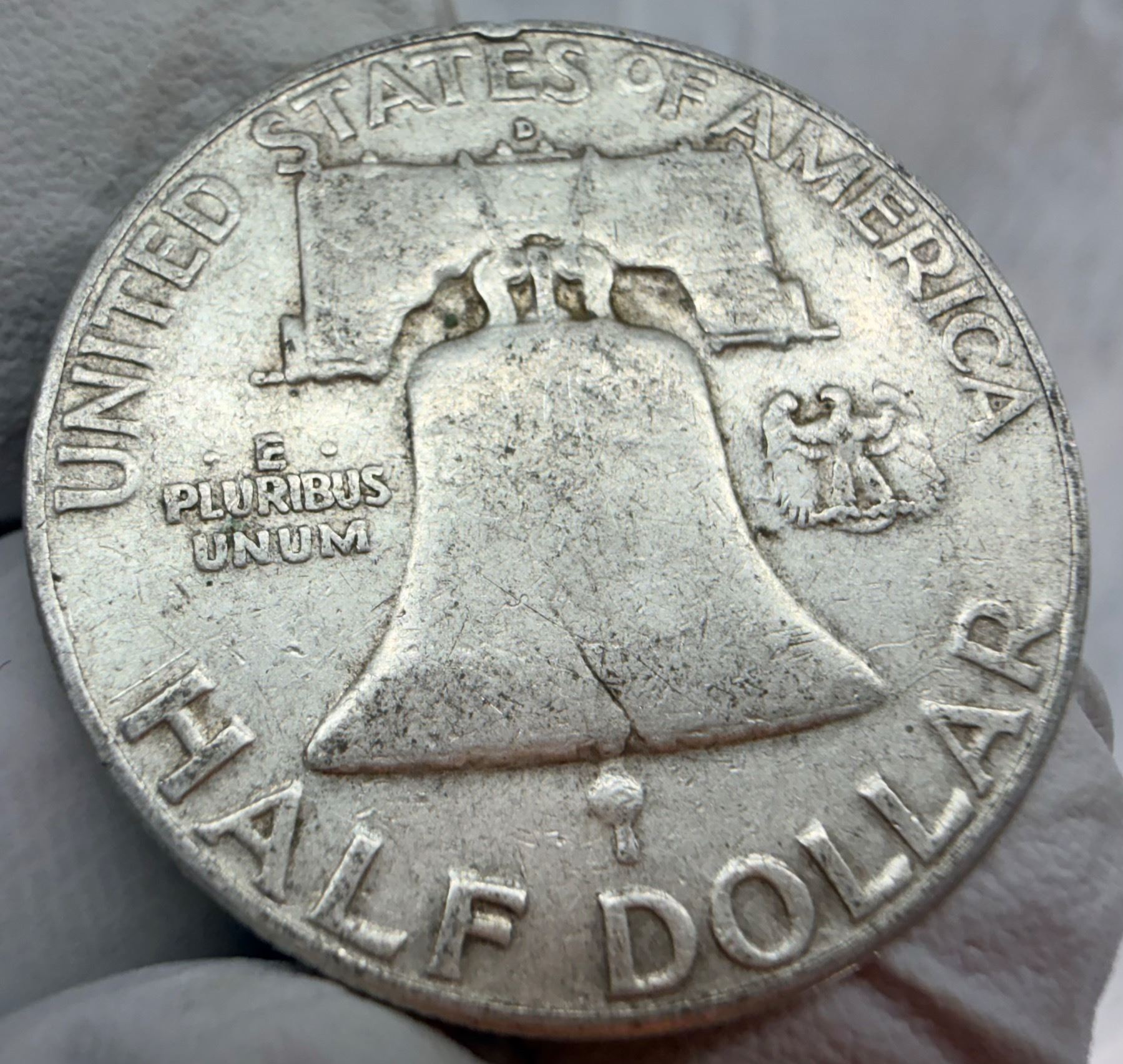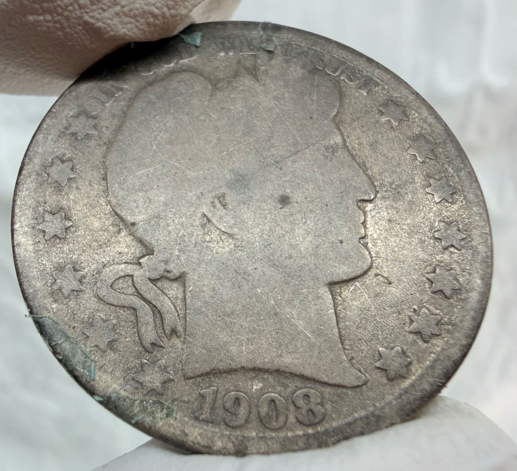 BARBER SILVER HALF DOLLAR - 1908O - NEW ORLEANS MINT; WALKING LIBERTY SILVER HALF DOLLAR, 1943 - PHILADELPHIA MINT; BEN FRANKLIN SILVER HALF DOLLAR, 1960D - DENVER MINT; KENNEDY SILVER HALF DOLLAR, 1966