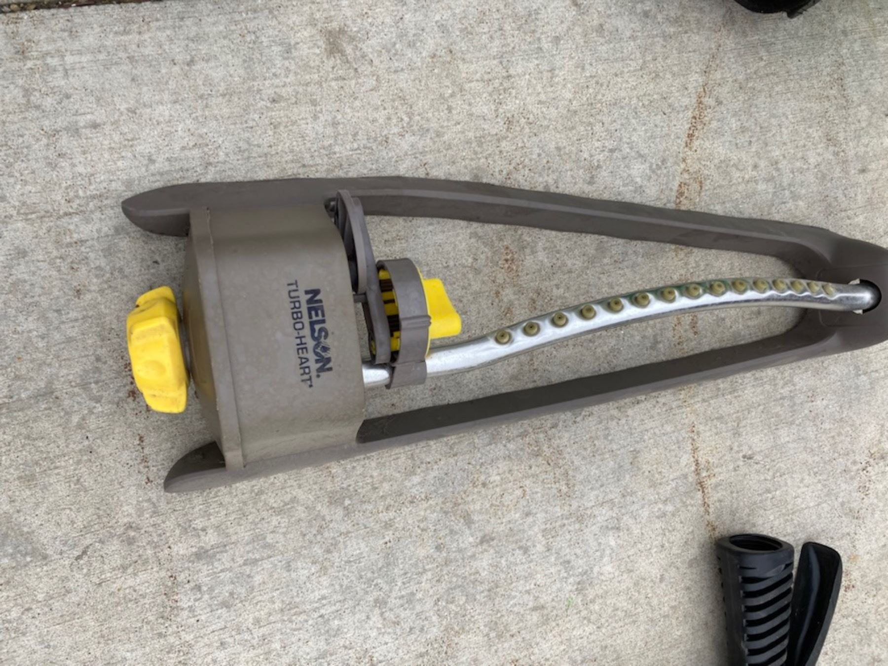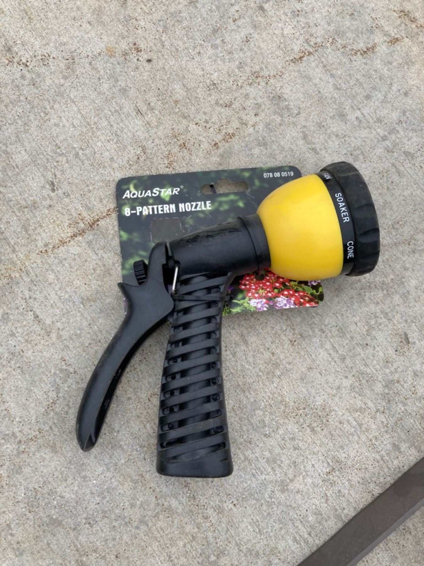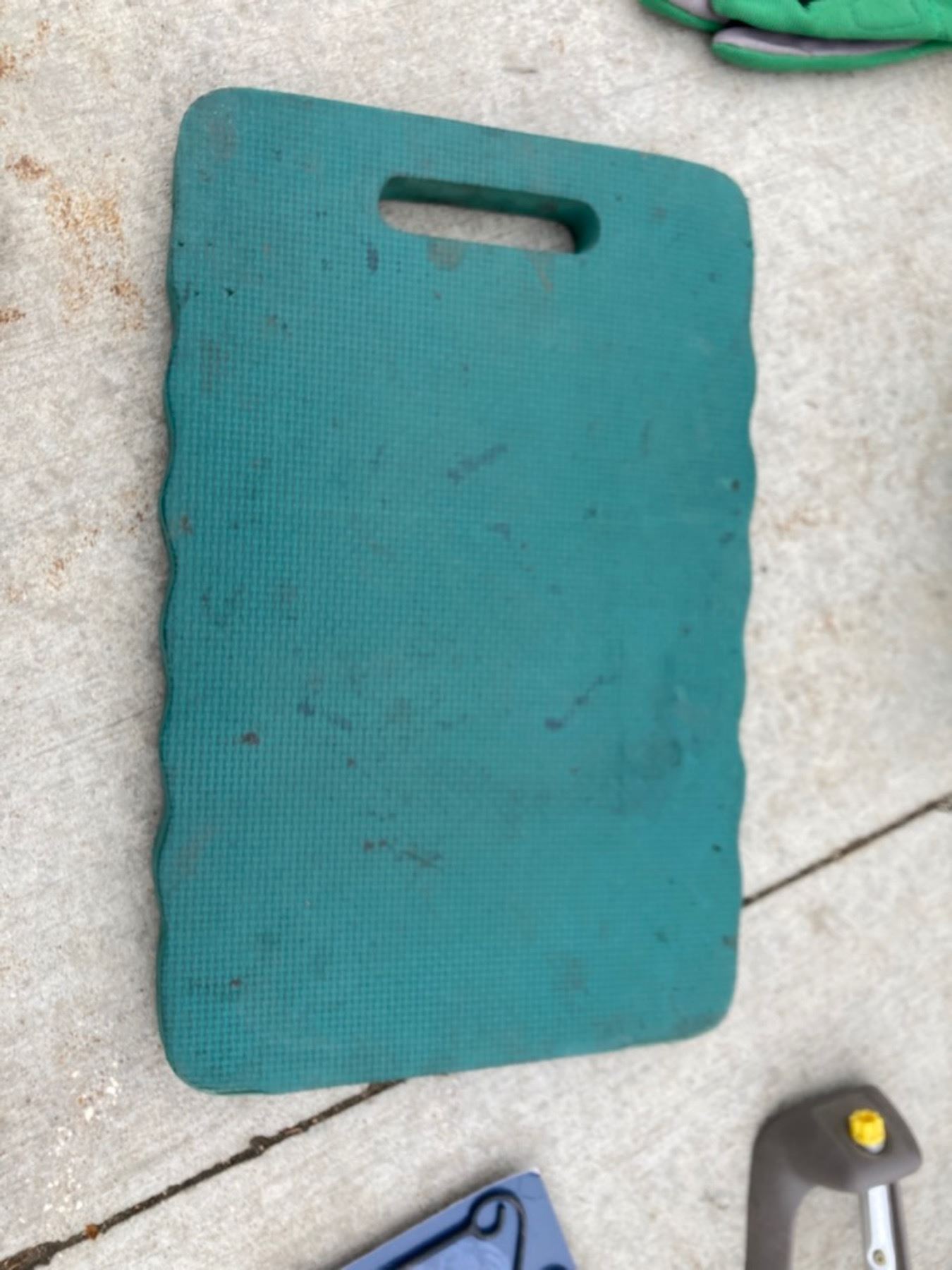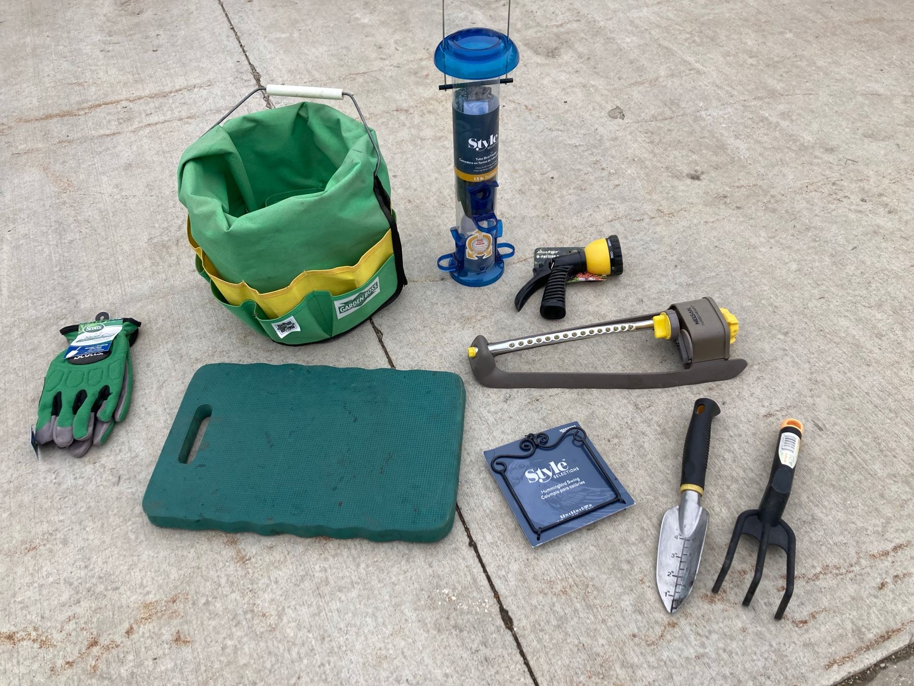 WATERING TOOLS: INCLUDES A SPRAY NOZZLE AND A LONG, ADJUSTABLE LAWN SPRINKLER FOR WATERING PLANTS AND LAWNS; GARDENING AIDS: FEATURES A DURABLE FOAM KNEELING PAD TO PROTECT KNEES WHILE WORKING ON THE GROUND, ALONG WITH BASIC HAND TROWEL AND CULTIVATOR TOOLS FOR DIGGING AND PLANTING