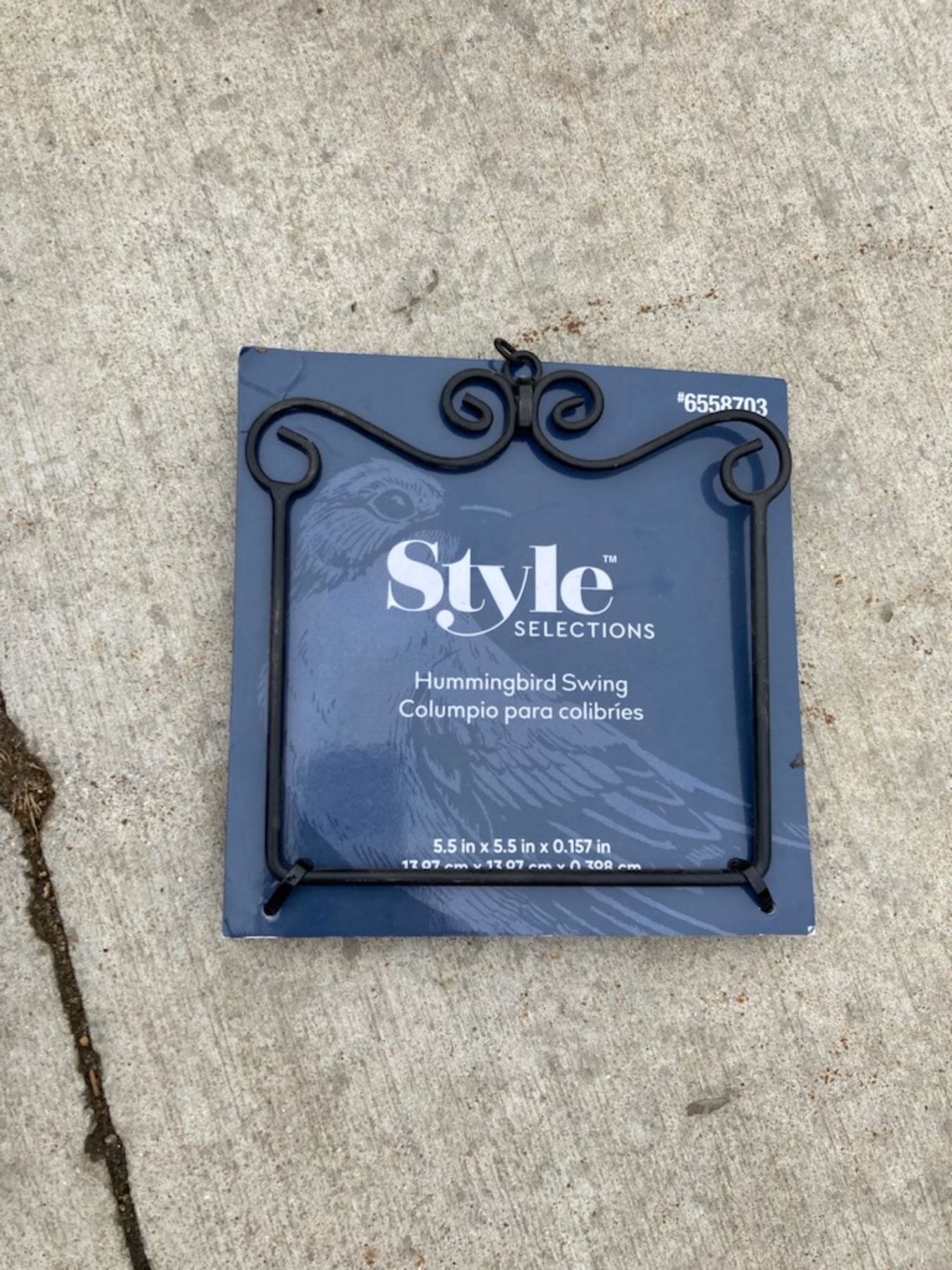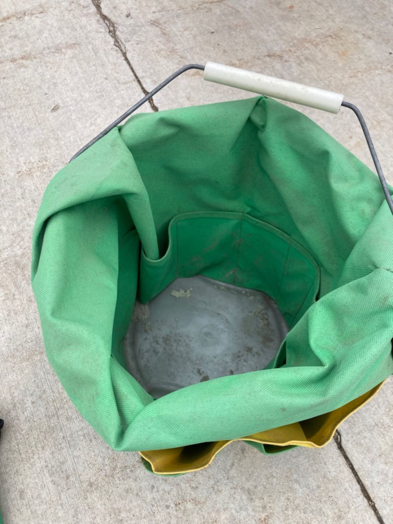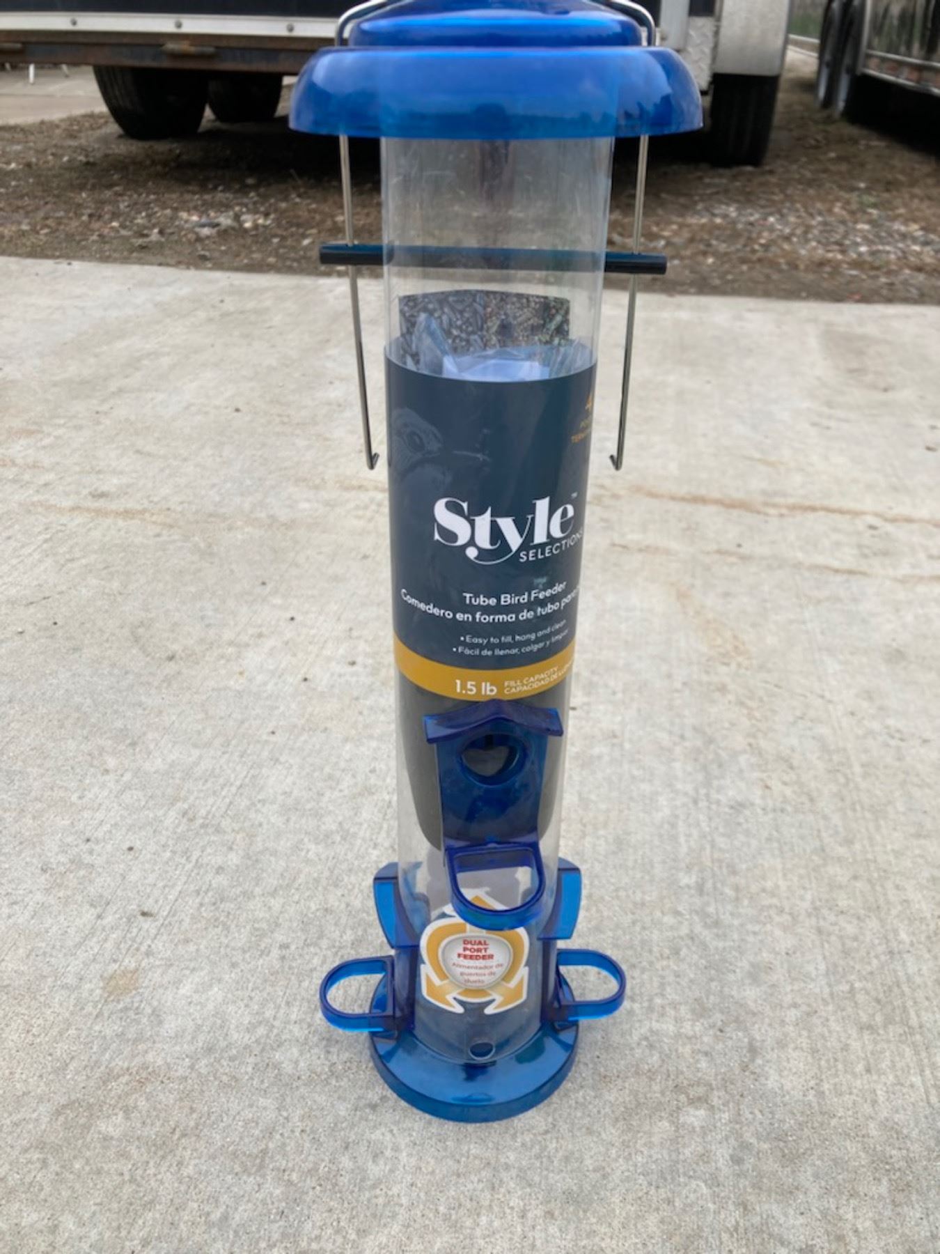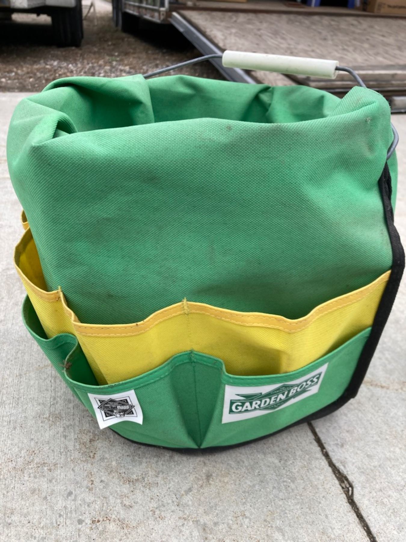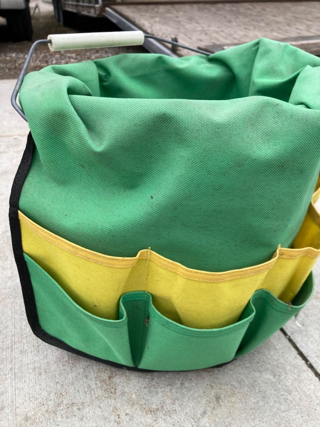 GARDEN TOOL TOTE: A GREEN AND YELLOW CANVAS TOTE BAG WITH POCKETS FOR ORGANIZING SMALL GARDENING HAND TOOLS; BIRD FEEDER: A BLUE AND CLEAR PLASTIC CYLINDER-STYLE FEEDER DESIGNED FOR DISPENSING BIRDSEED