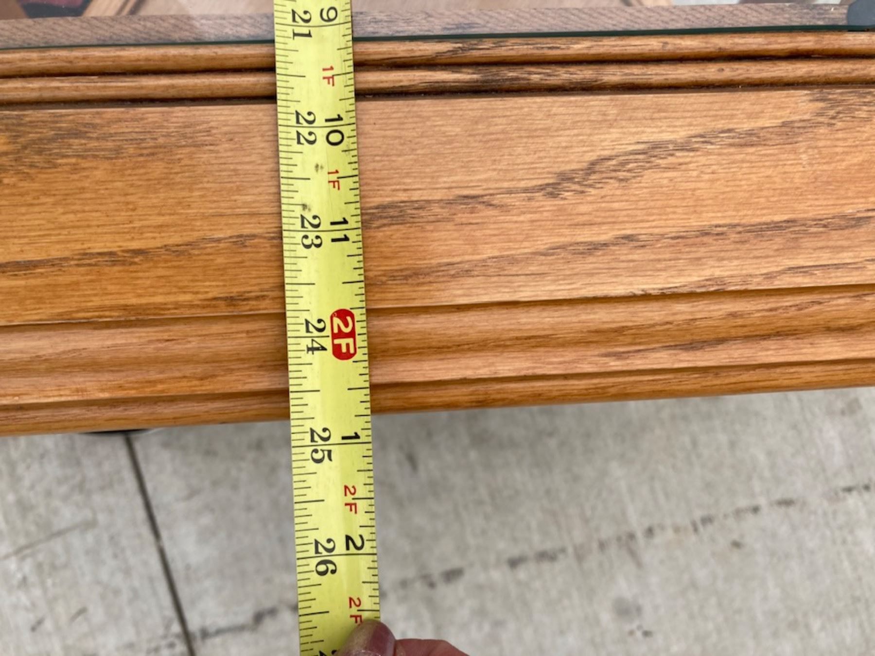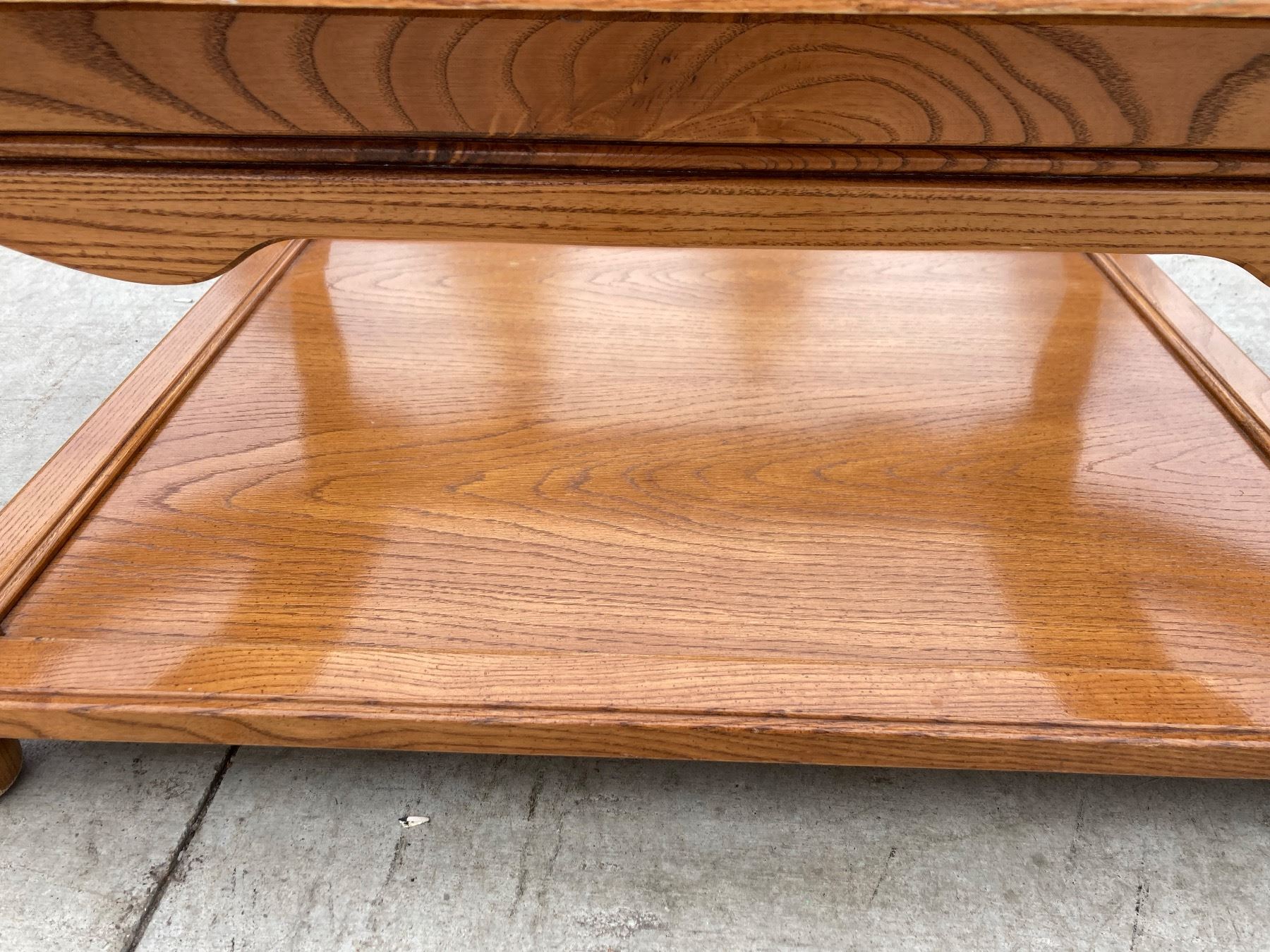 COFFEE TABLE MEASURES APPROXIMATELY  50 INCHES X 30 INCHES X 15 INCHES HIGH; SIDE TABLE MEASURES APPROXIMATELY  24 INCHES X 21 INCHES HIGH