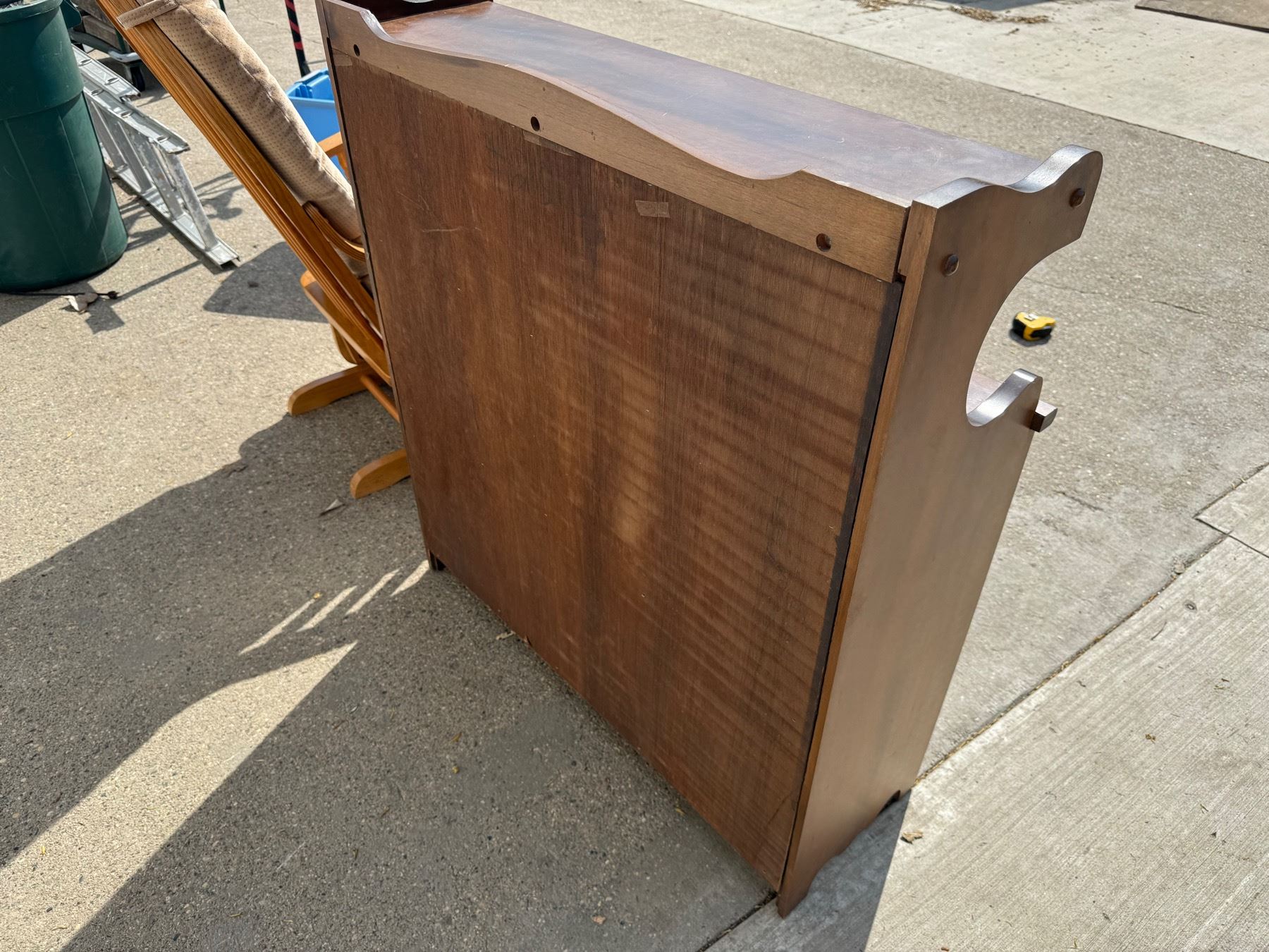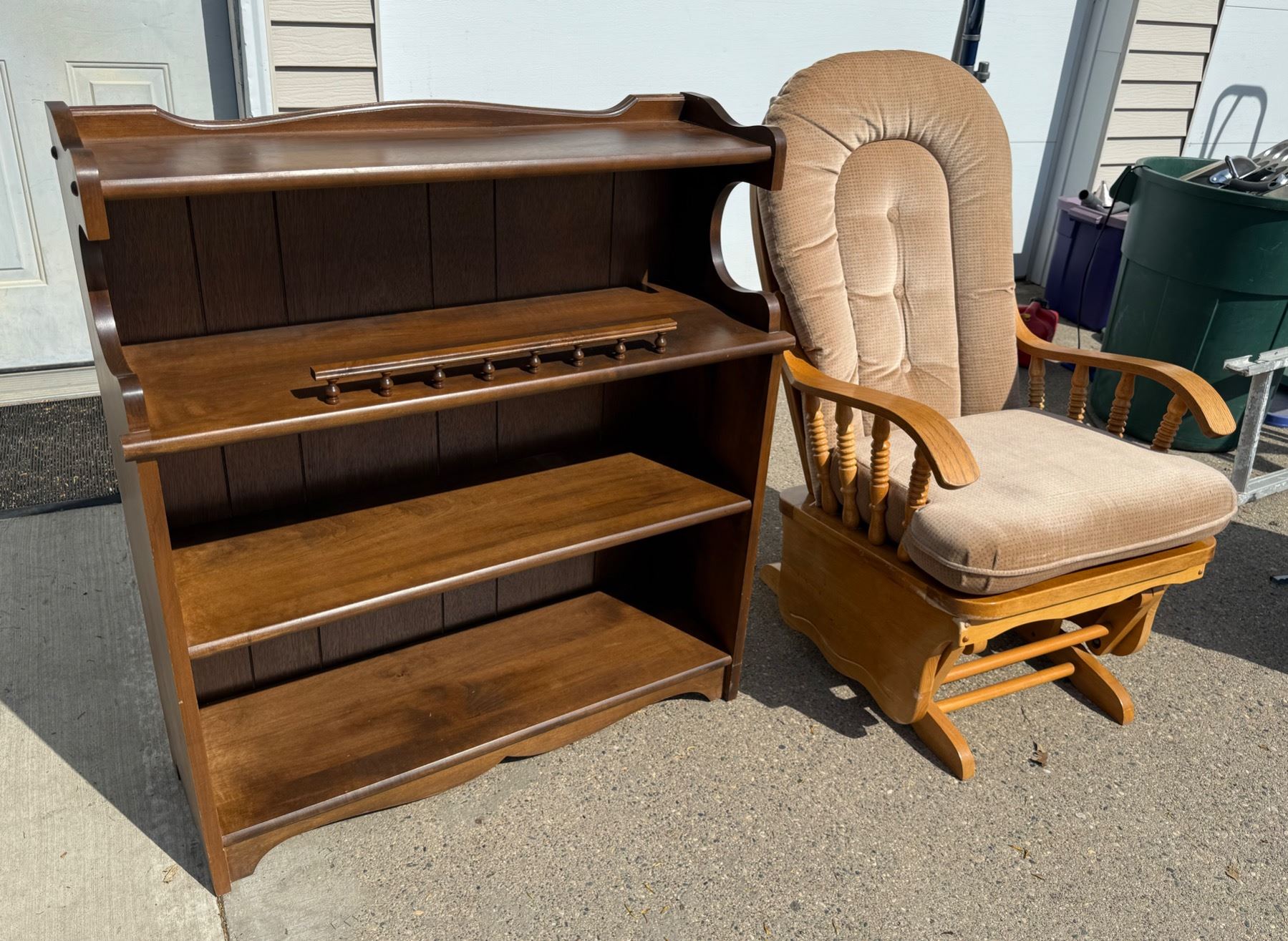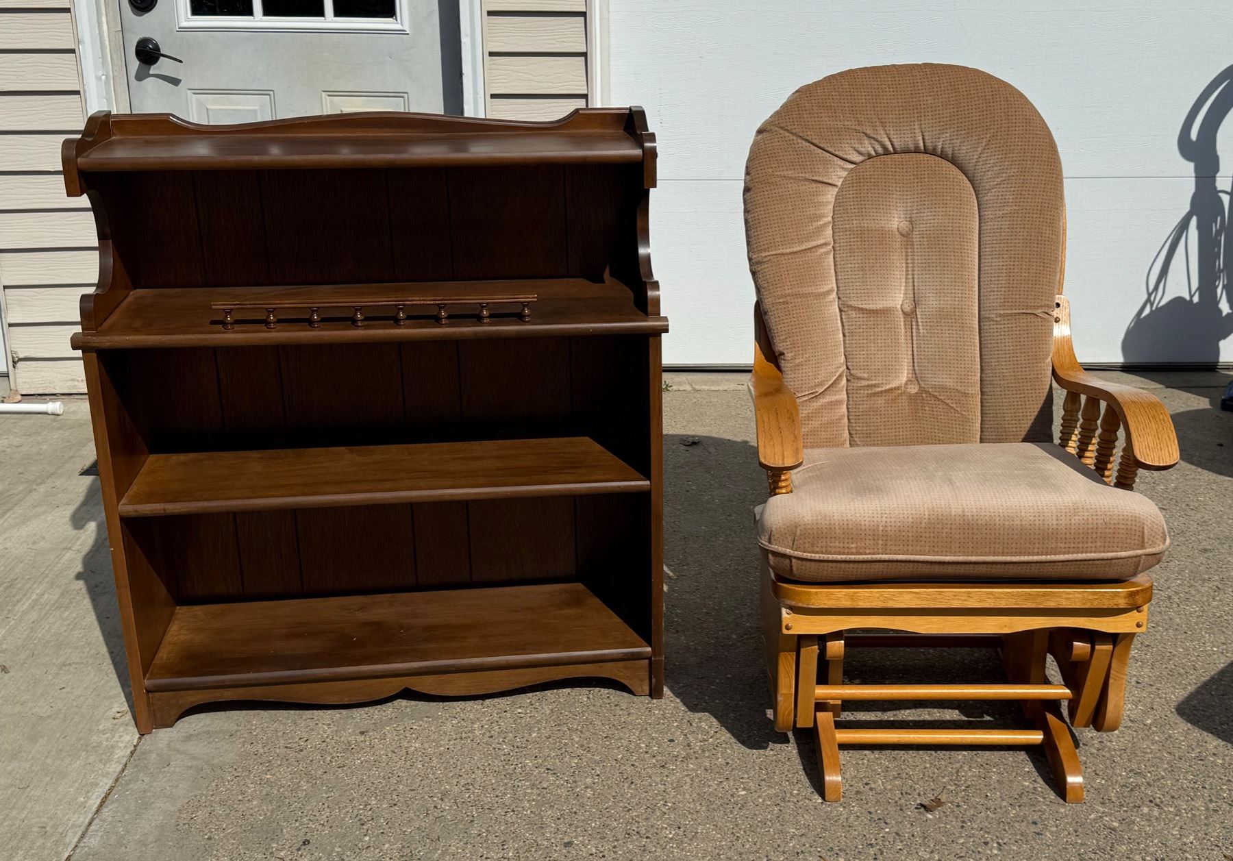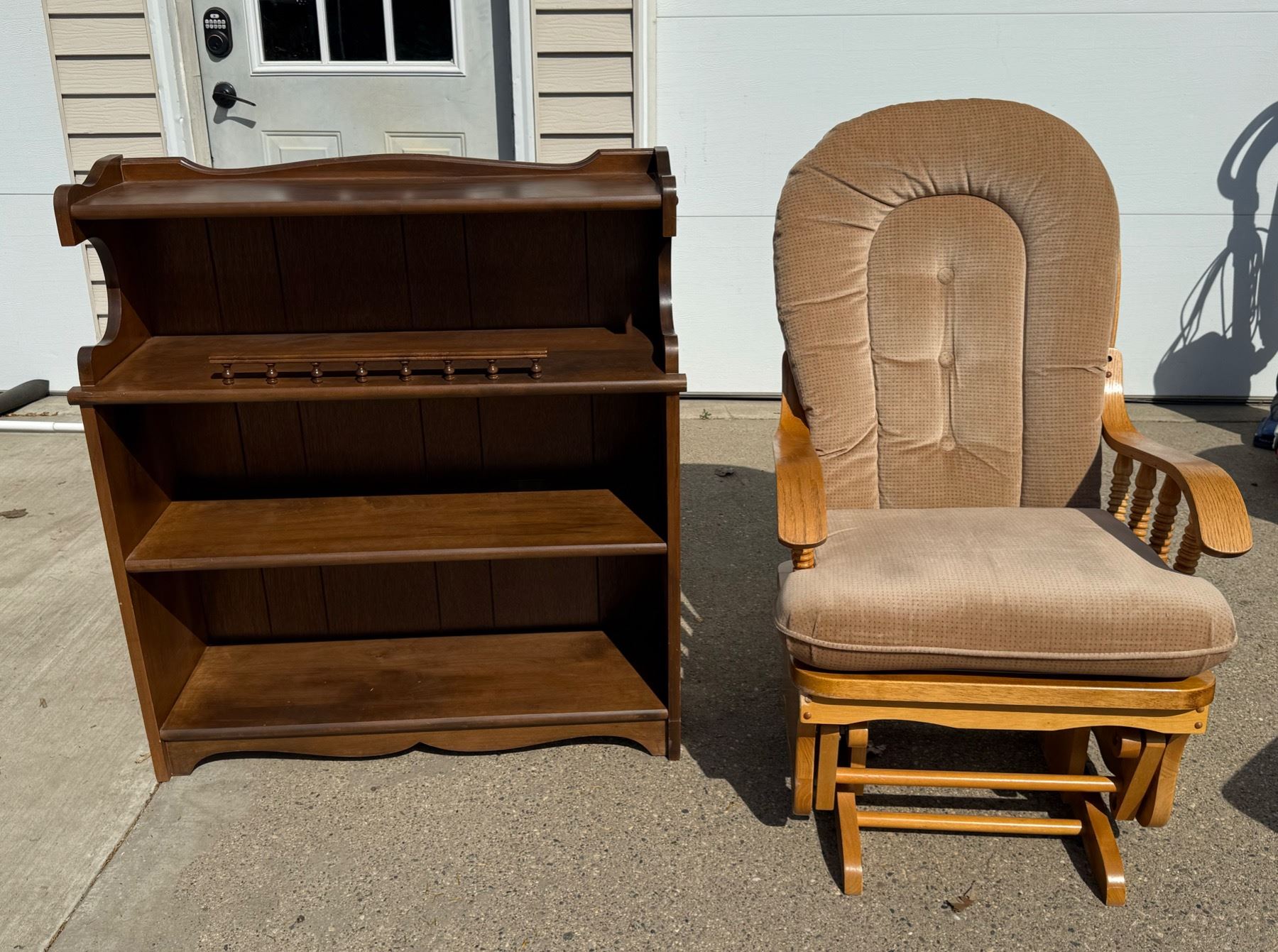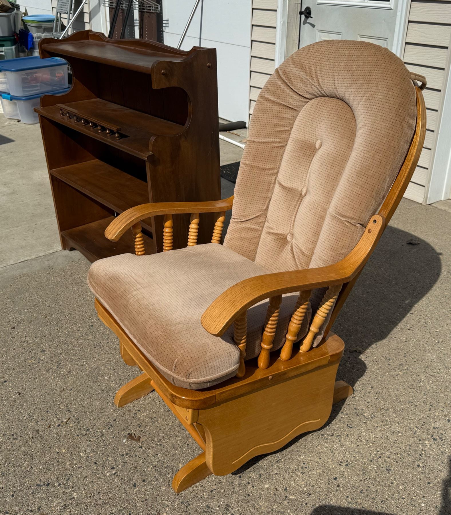 CLEAN, COMFORTABLE GLIDER ROCKER AND SHELF - GREAT FOR CURIOSITIES, KNICK KNACKS, OR TEACUPS/DISHES DISPLAY