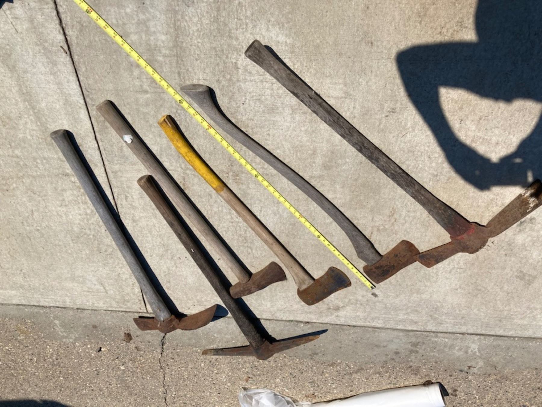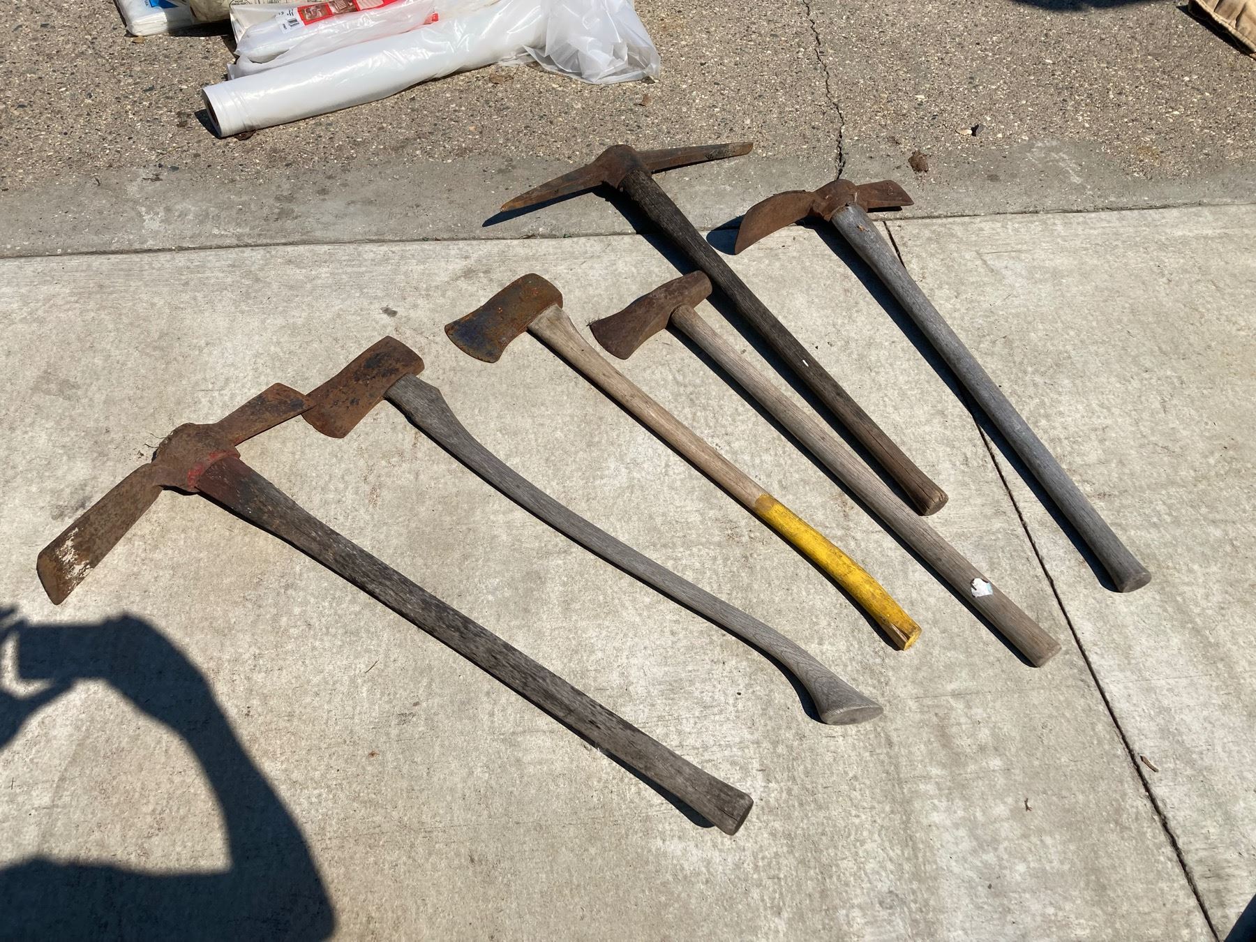 GRUB AXES, FELLING AXES, SPLITTING MAUL, AND PICKAXE; LOT OF 5