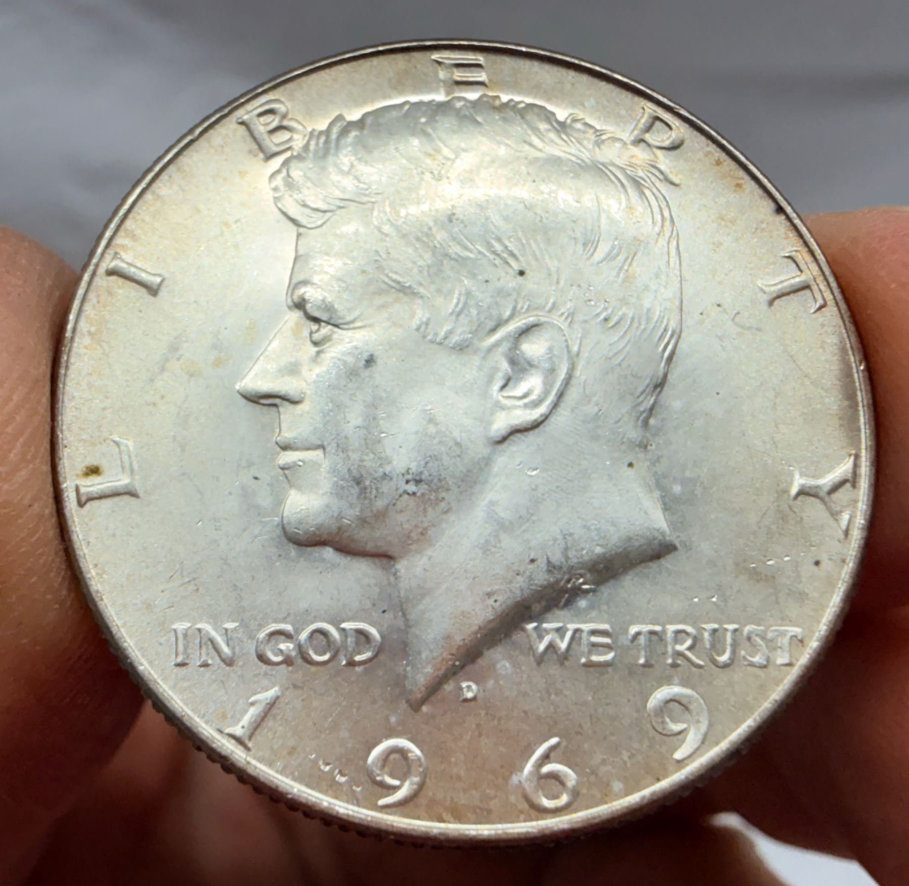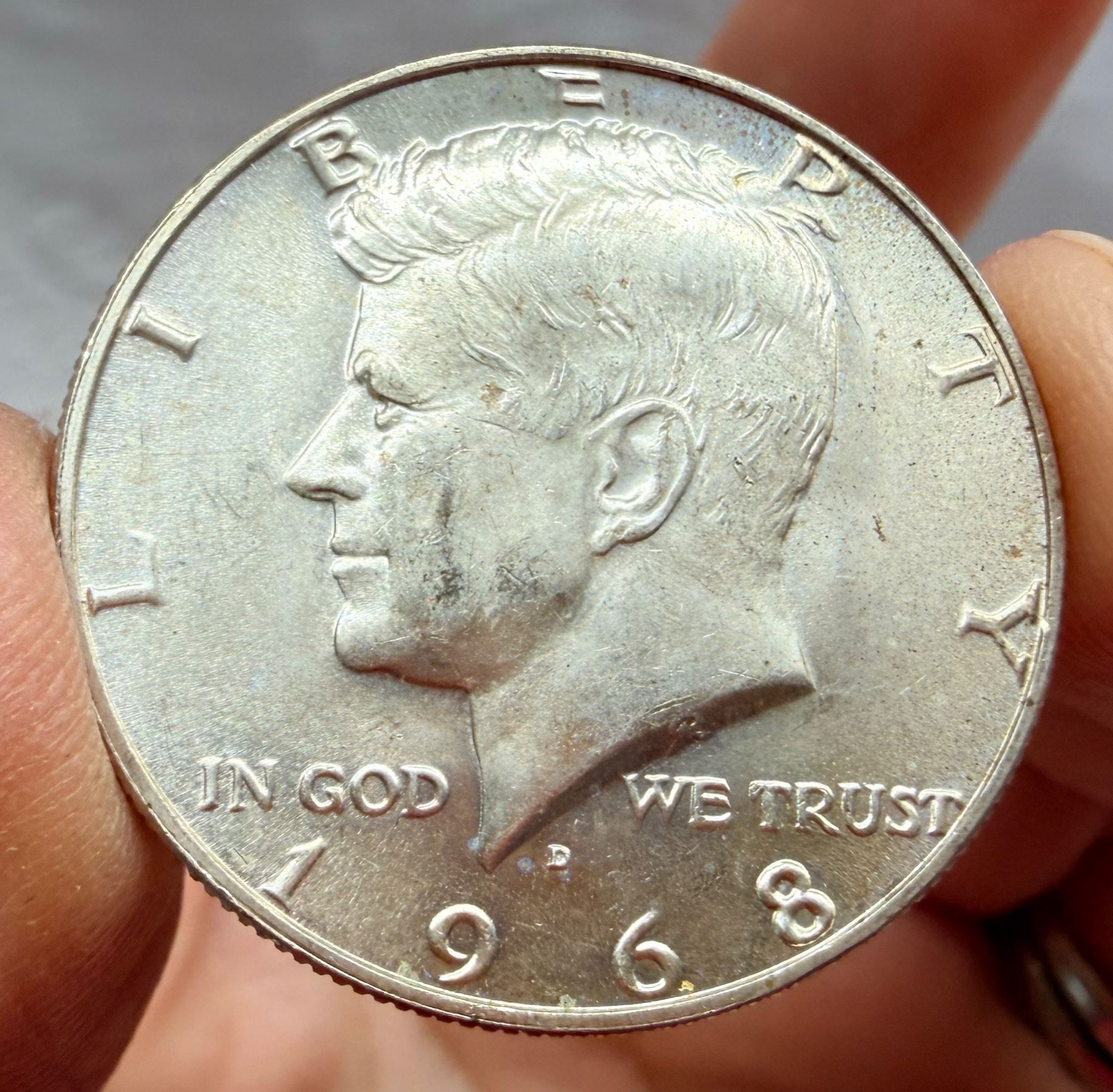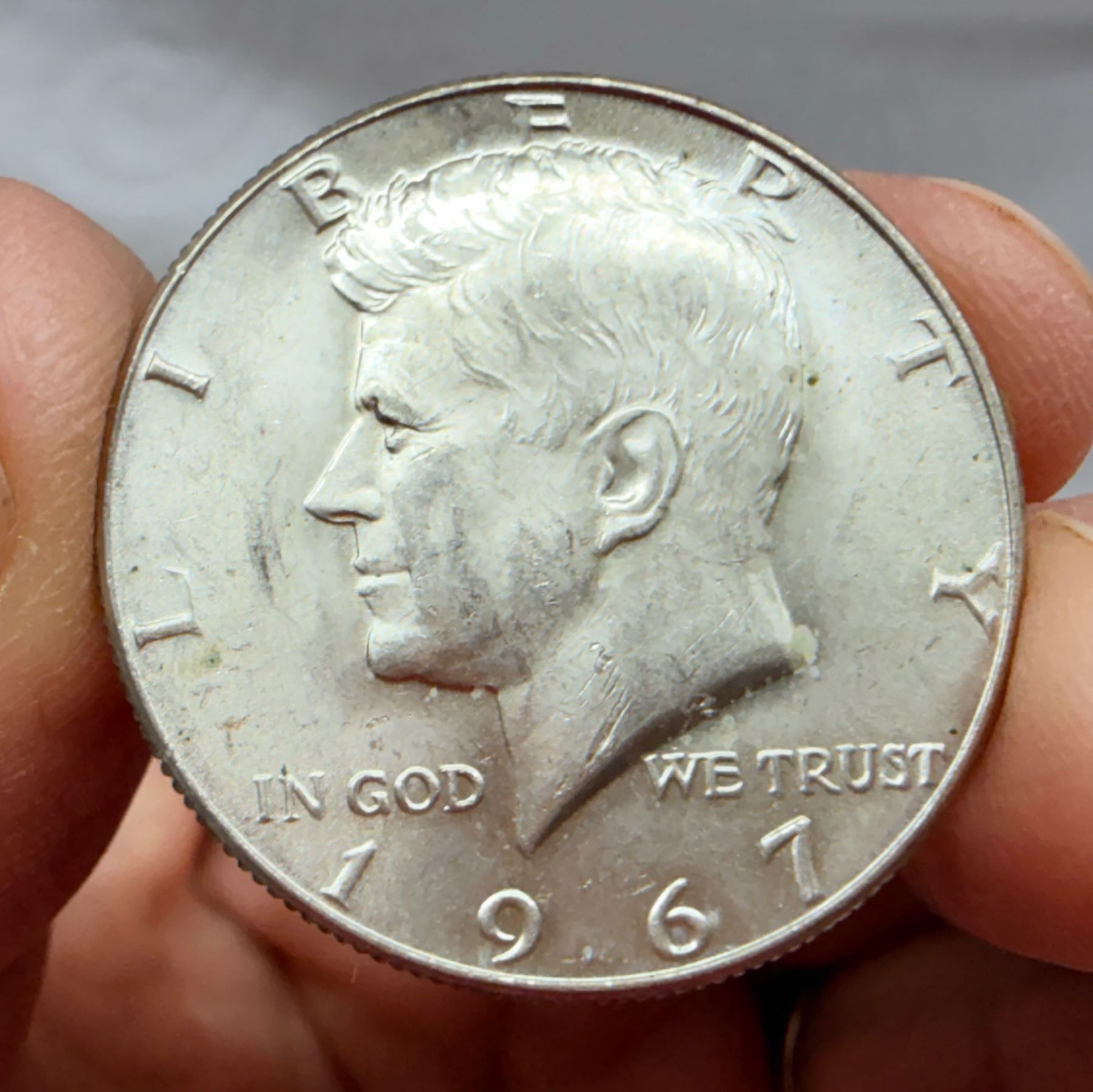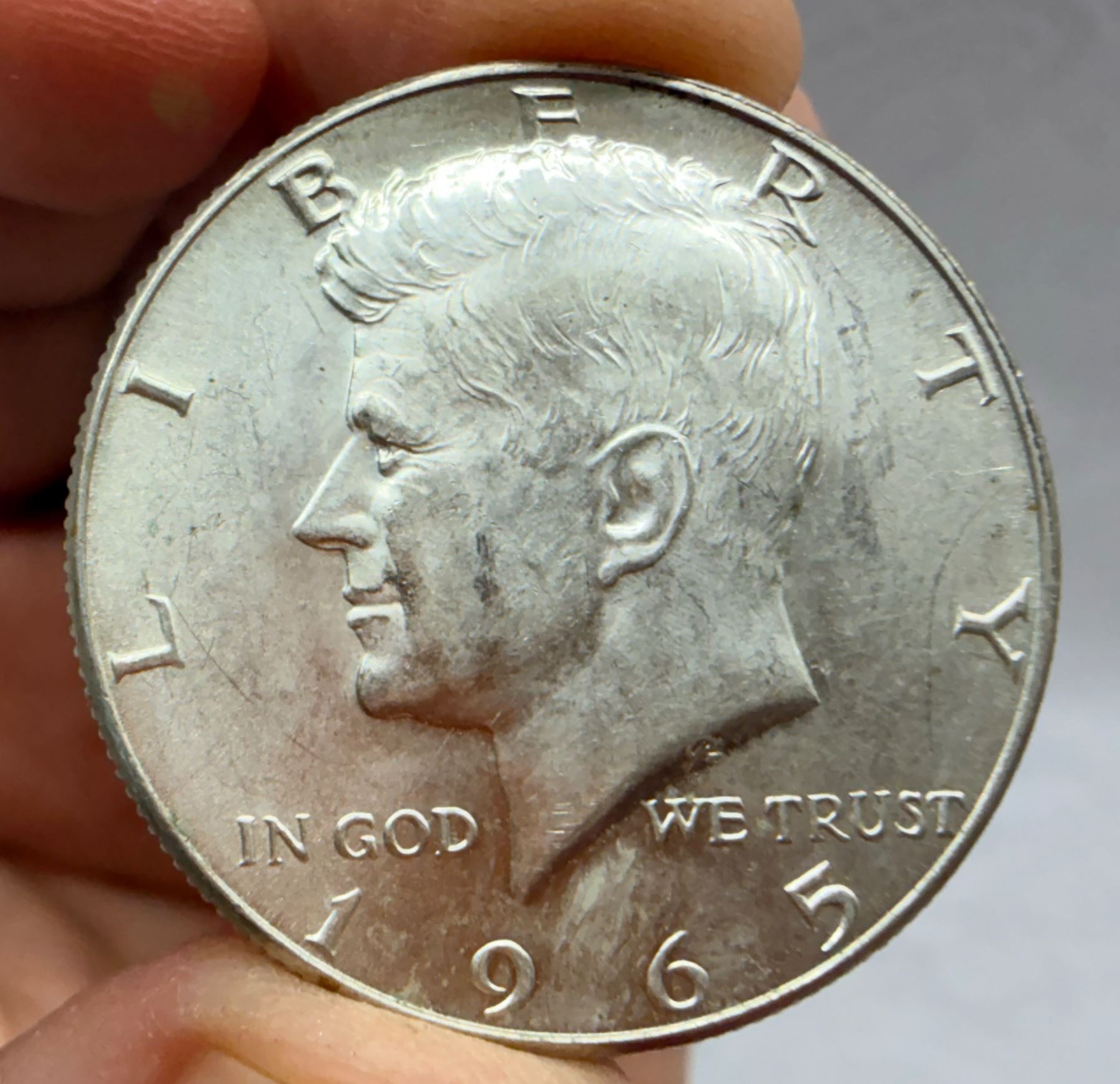 THE HALF DOLLAR DESIGNED CHANGED TO THE KENNEDY SILVER HALF DOLLAR IN 1964; THE 1964 KENNEDY HALF DOLLAR IS 90 PERCENT SILVER AND 10 PERCENT COPPER WITH A TOTAL WEIGHT OF 12.5 GRAMS, CONTAINS .36169 TROY OUNCE OF PURE SILVER; FROM 1965–1970, THE KENNEDY HALF DOLLAR IS 40 PERCENT SILVER AND 60 PERCENT COPPER WITH A TOTAL WEIGH OF 11.5 GRAMS AND CONTAINS .14779 TROY OUNCE OF PURE SILVER; THE KENNEDY HALF DOLLAR WAS ISSUED FROM 1964-PRESENT; THE 1964 MINT MARK IN ON THE REVERSE OF THE COIN, THERE WERE NO MINT MARKS ON ANY FROM 1965-1967, THE MINT MARKS ARE ON THE FRONT (OBVERSE) OF THE COIN FROM 1968-PRESENT