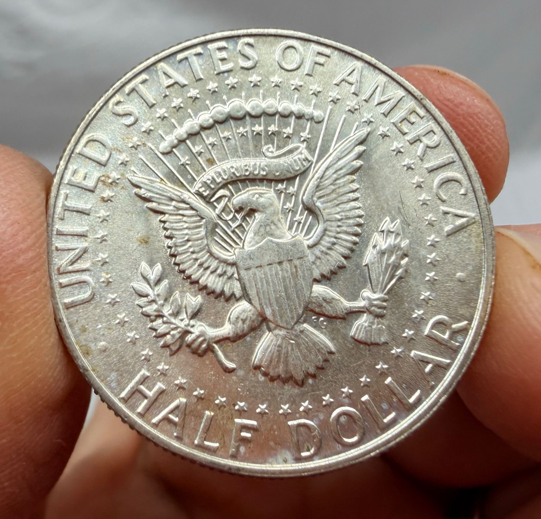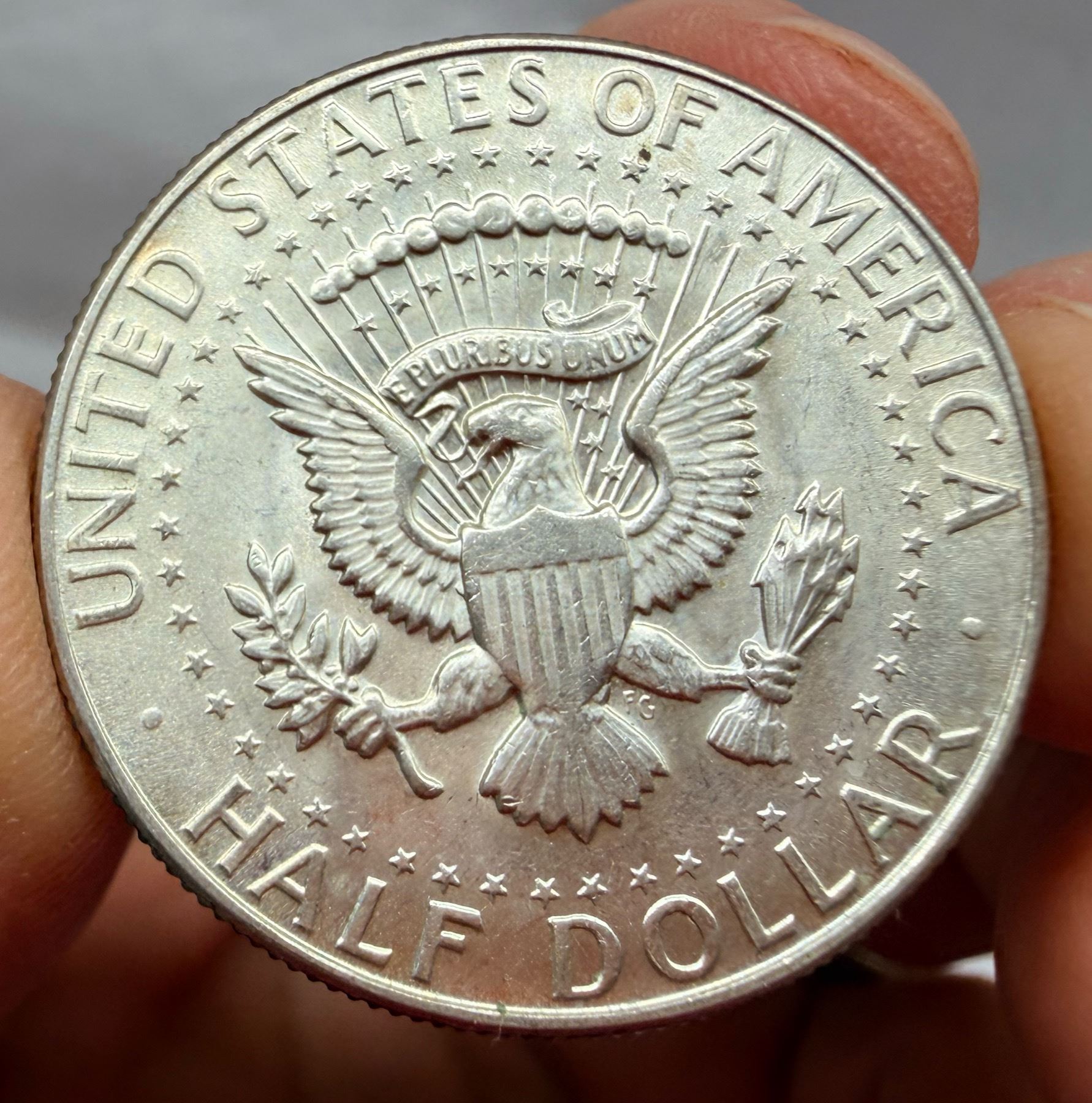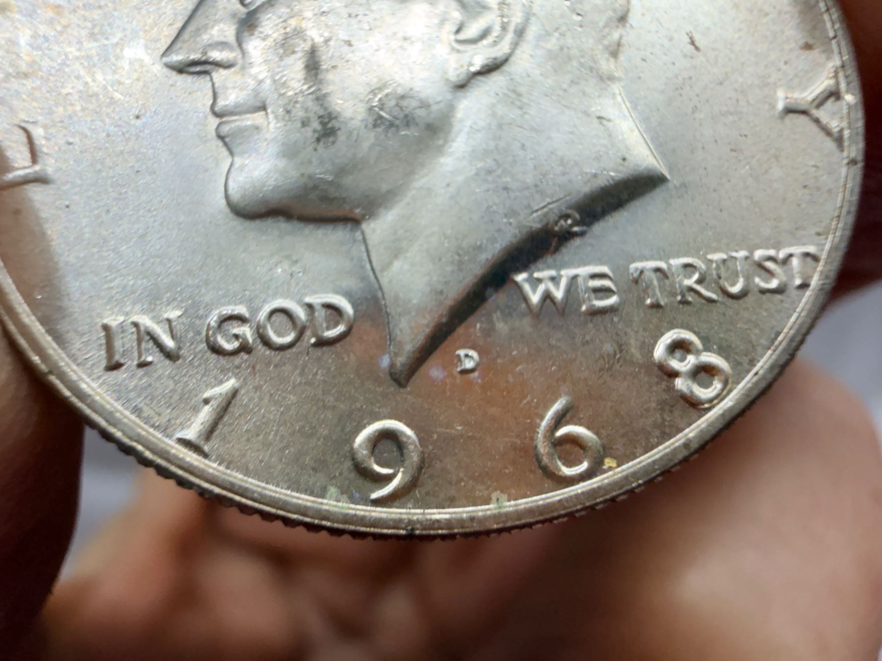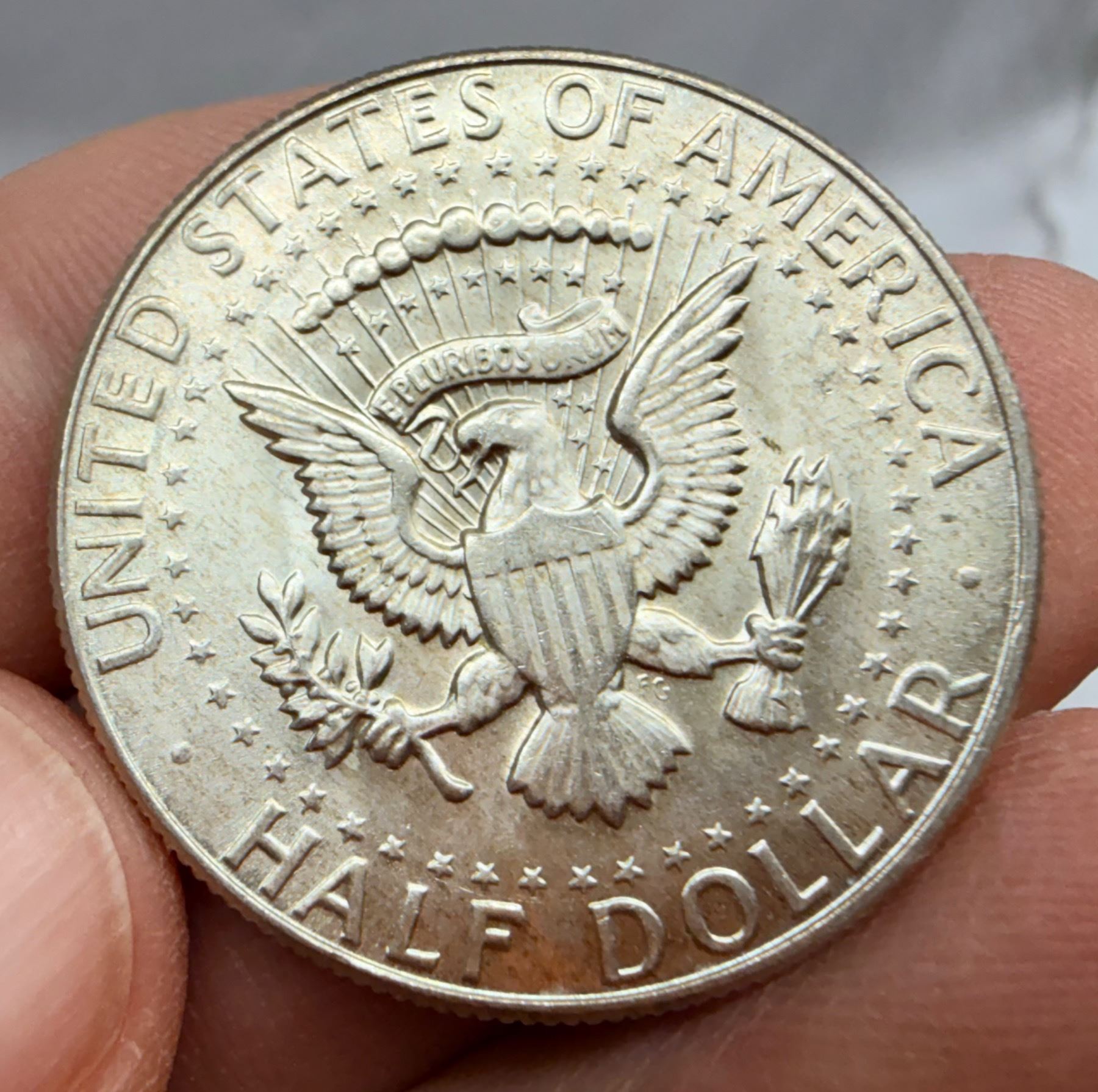 THE HALF DOLLAR DESIGNED CHANGED TO THE KENNEDY SILVER HALF DOLLAR IN 1964; THE 1964 KENNEDY HALF DOLLAR IS 90 PERCENT SILVER AND 10 PERCENT COPPER WITH A TOTAL WEIGHT OF 12.5 GRAMS, CONTAINS .36169 TROY OUNCE OF PURE SILVER; FROM 1965–1970, THE KENNEDY HALF DOLLAR IS 40 PERCENT SILVER AND 60 PERCENT COPPER WITH A TOTAL WEIGH OF 11.5 GRAMS AND CONTAINS .14779 TROY OUNCE OF PURE SILVER; THE KENNEDY HALF DOLLAR WAS ISSUED FROM 1964-PRESENT; THE 1964 MINT MARK IN ON THE REVERSE OF THE COIN, THERE WERE NO MINT MARKS ON ANY FROM 1965-1967, THE MINT MARKS ARE ON THE FRONT (OBVERSE) OF THE COIN FROM 1968-PRESENT