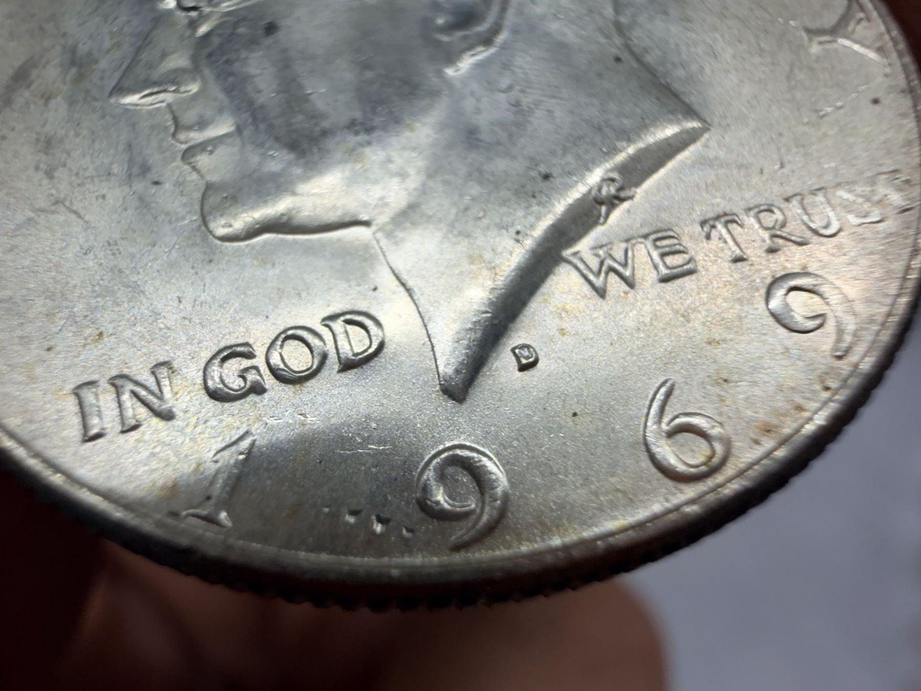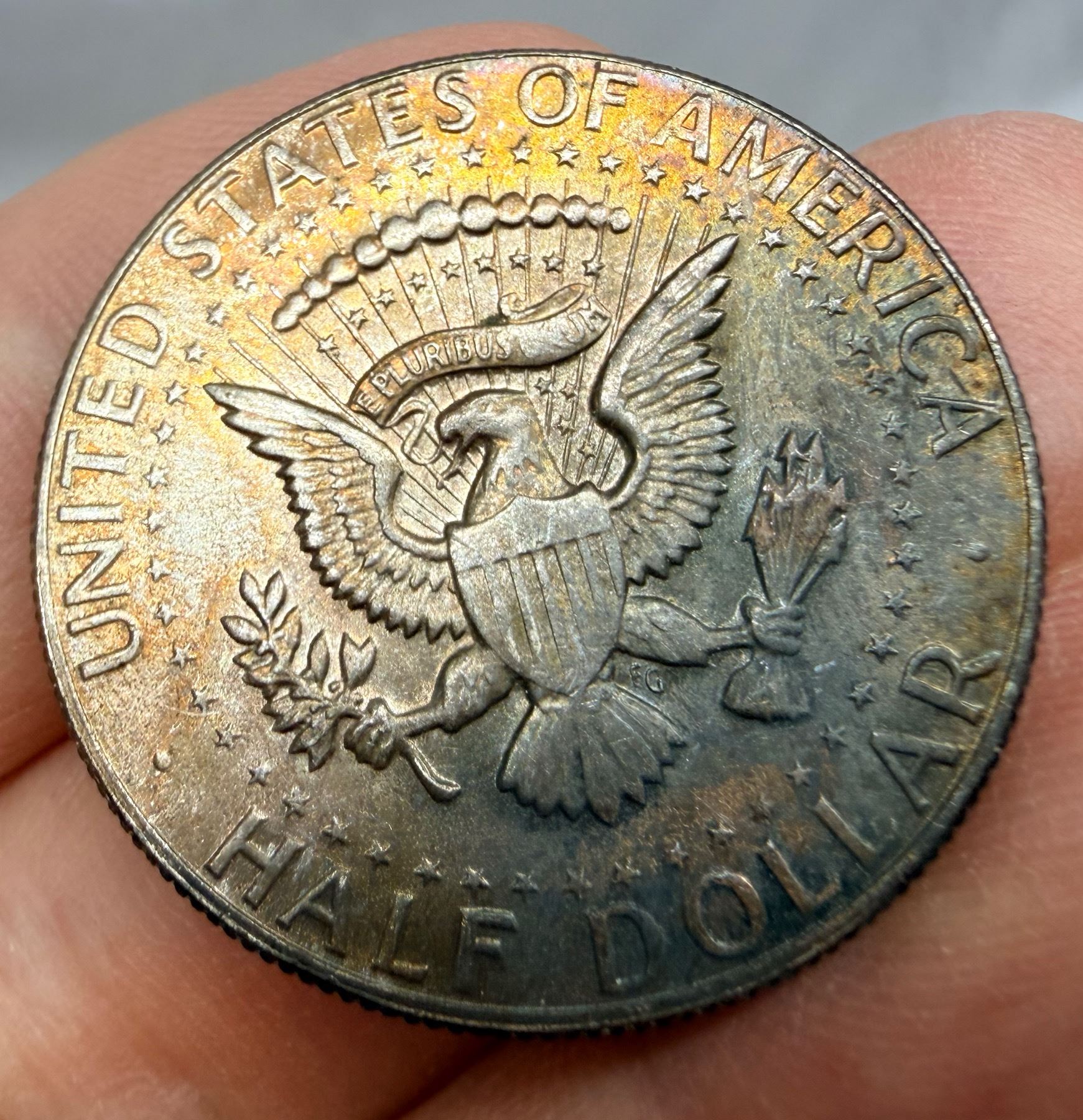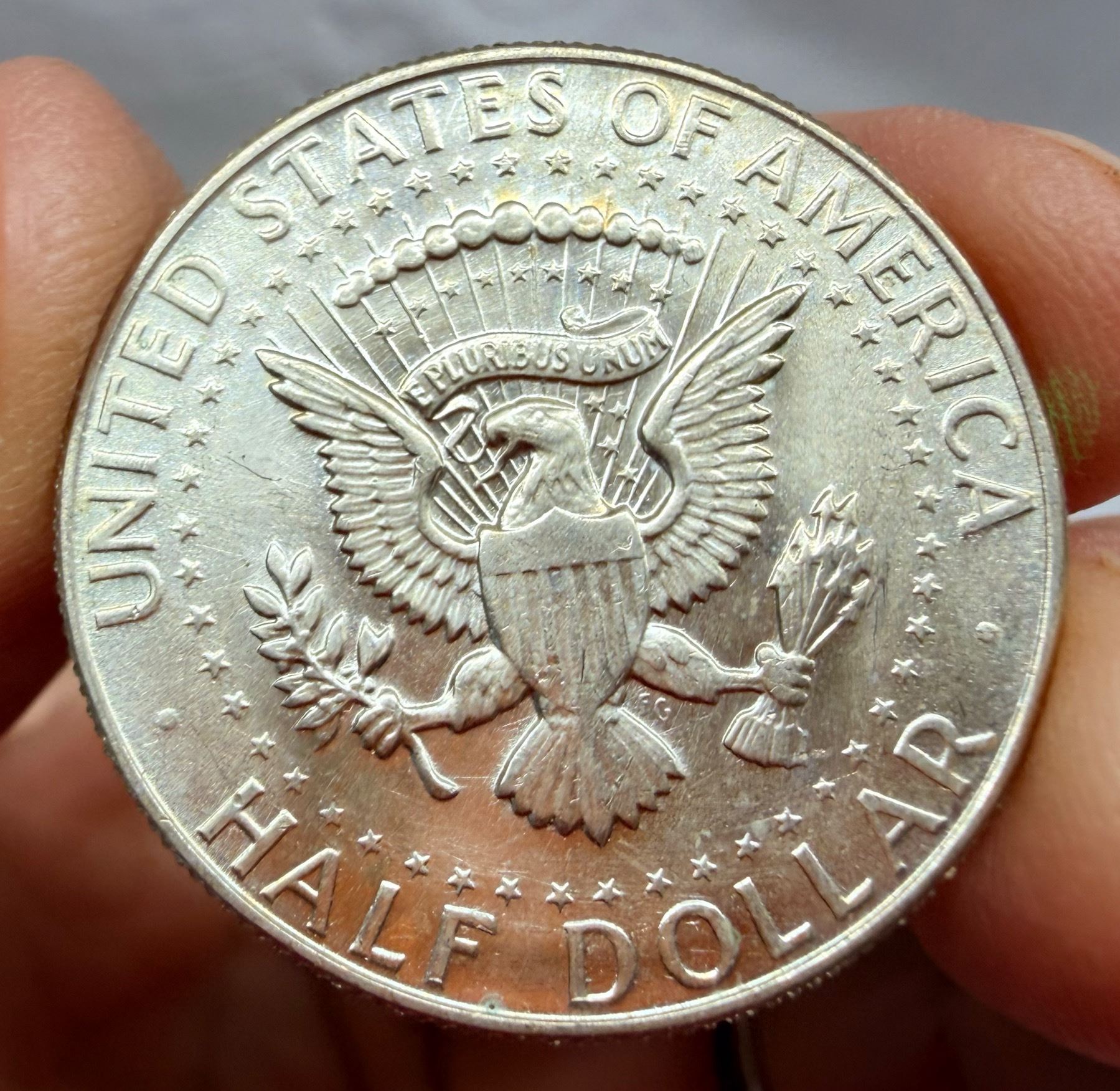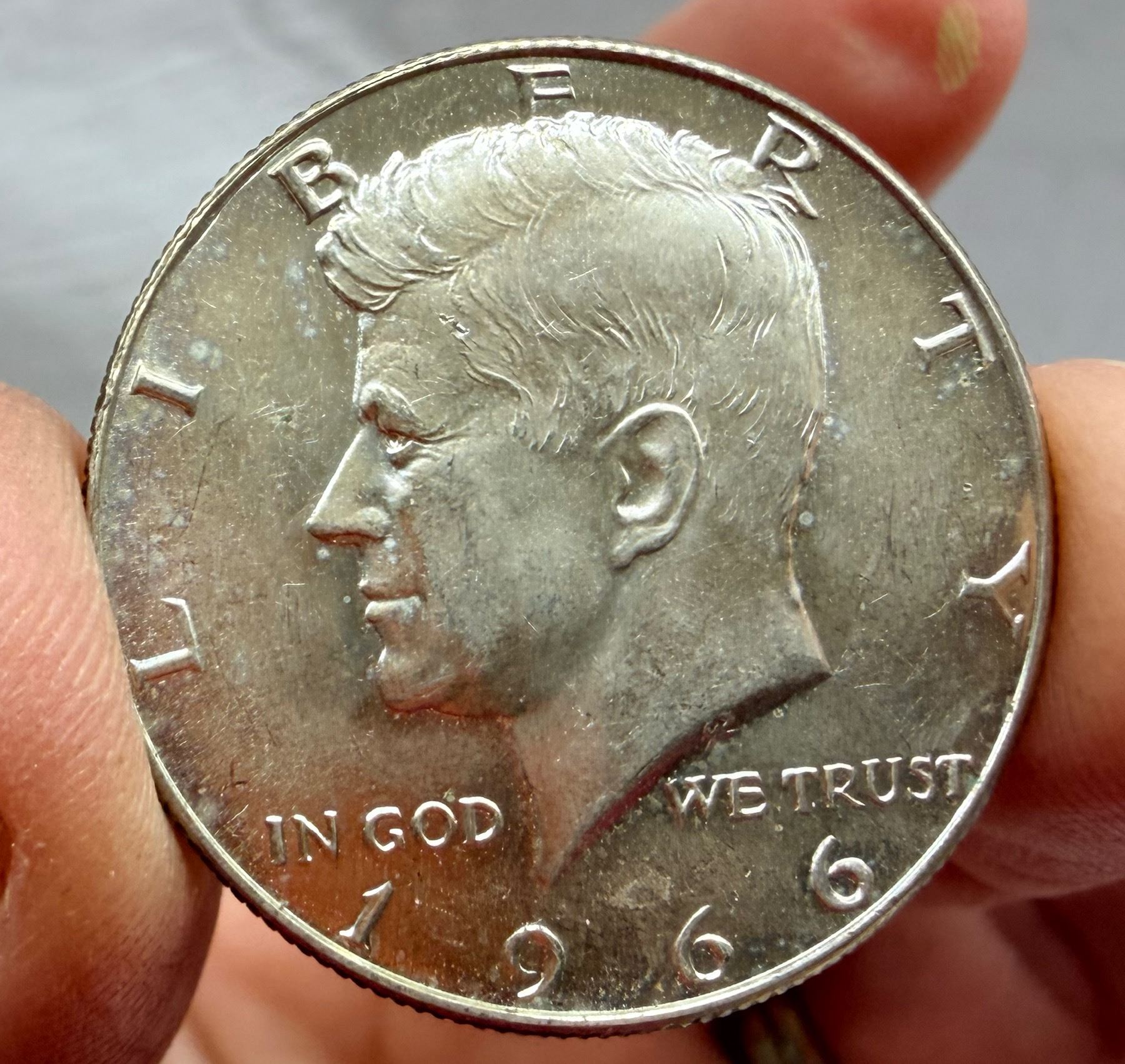 THE HALF DOLLAR DESIGNED CHANGED TO THE KENNEDY SILVER HALF DOLLAR IN 1964; THE 1964 KENNEDY HALF DOLLAR IS 90 PERCENT SILVER AND 10 PERCENT COPPER WITH A TOTAL WEIGHT OF 12.5 GRAMS, CONTAINS .36169 TROY OUNCE OF PURE SILVER; FROM 1965–1970, THE KENNEDY HALF DOLLAR IS 40 PERCENT SILVER AND 60 PERCENT COPPER WITH A TOTAL WEIGH OF 11.5 GRAMS AND CONTAINS .14779 TROY OUNCE OF PURE SILVER; THE KENNEDY HALF DOLLAR WAS ISSUED FROM 1964-PRESENT; THE 1964 MINT MARK IN ON THE REVERSE OF THE COIN, THERE WERE NO MINT MARKS ON ANY FROM 1965-1967, THE MINT MARKS ARE ON THE FRONT (OBVERSE) OF THE COIN FROM 1968-PRESENT