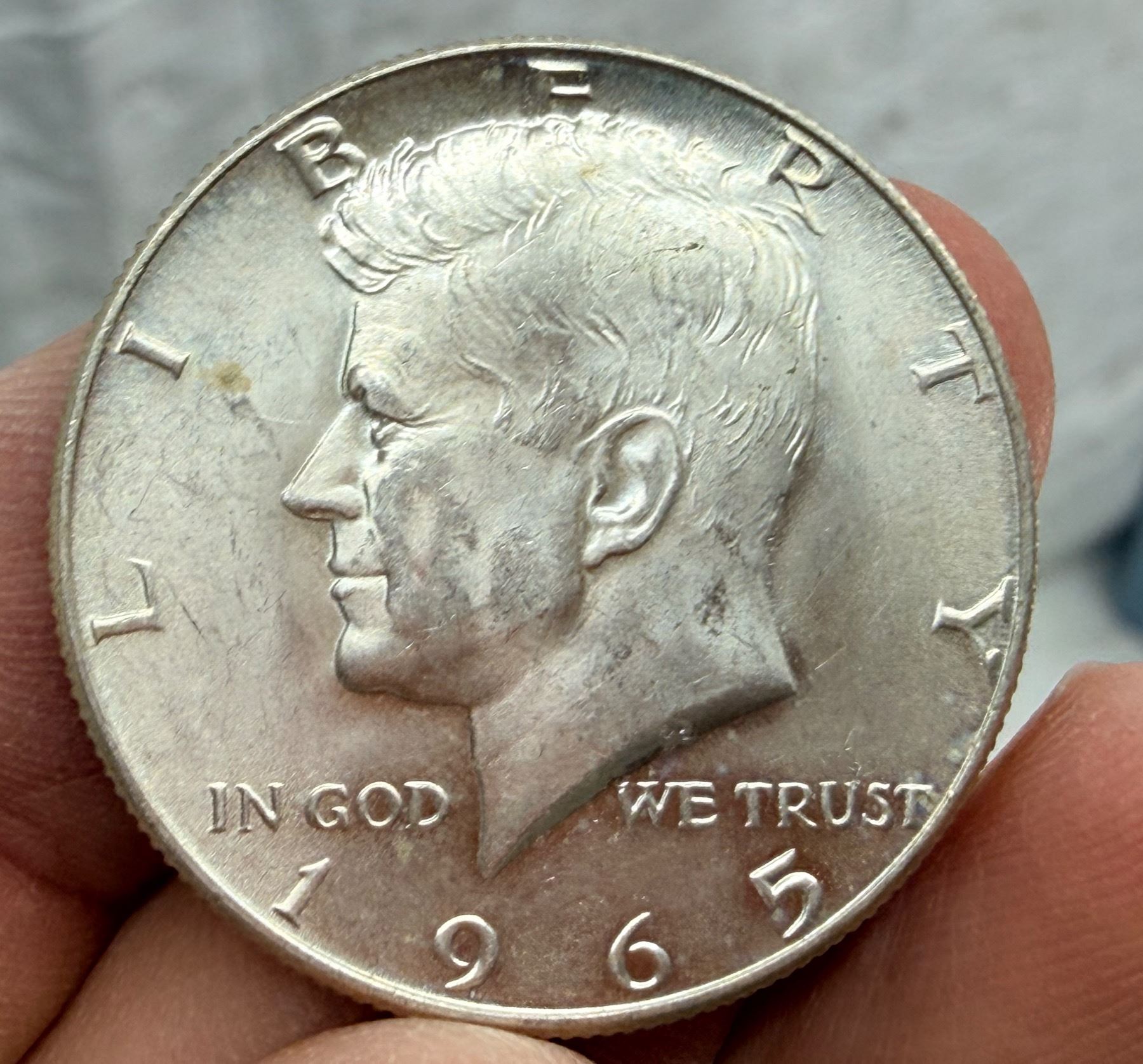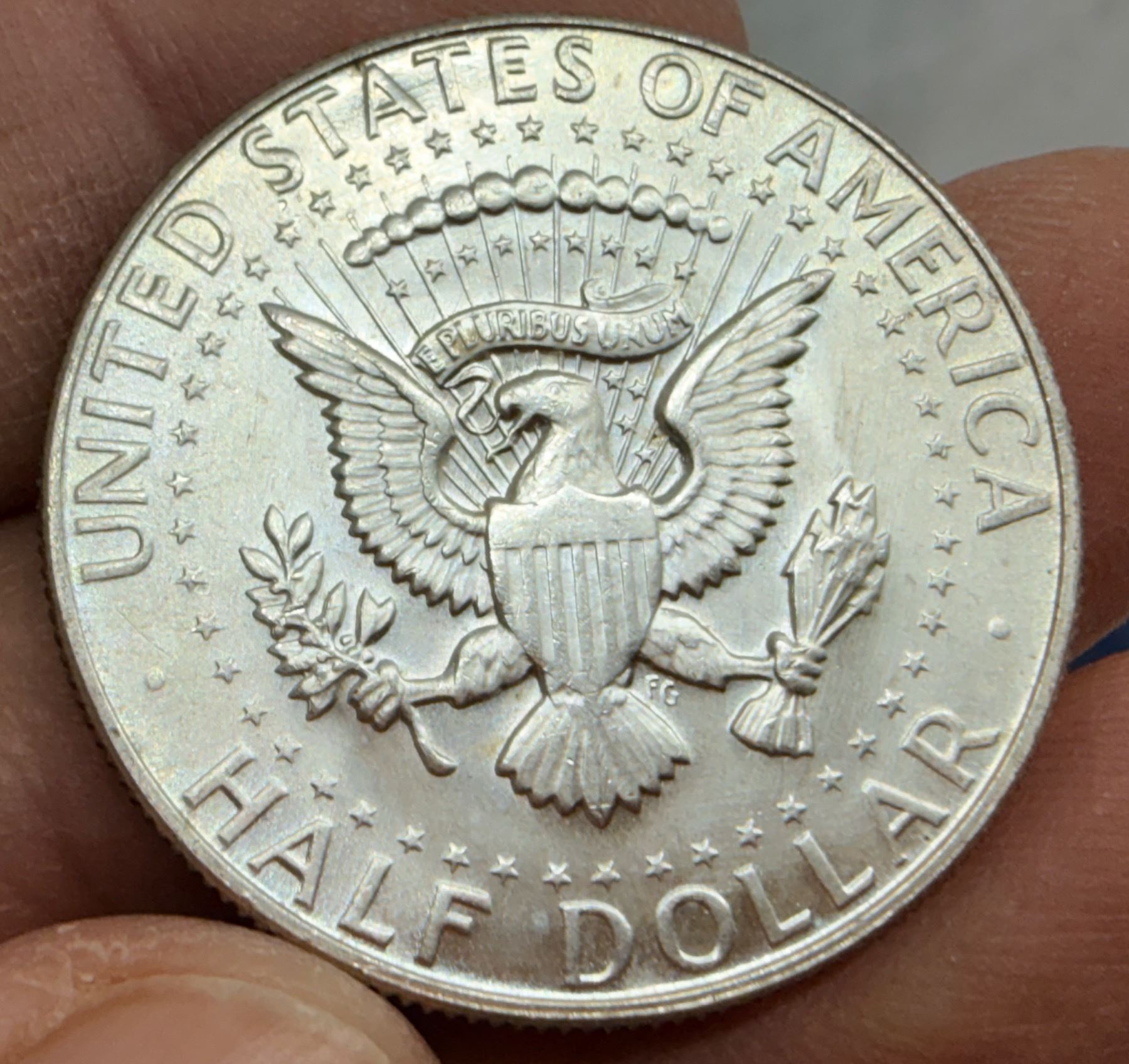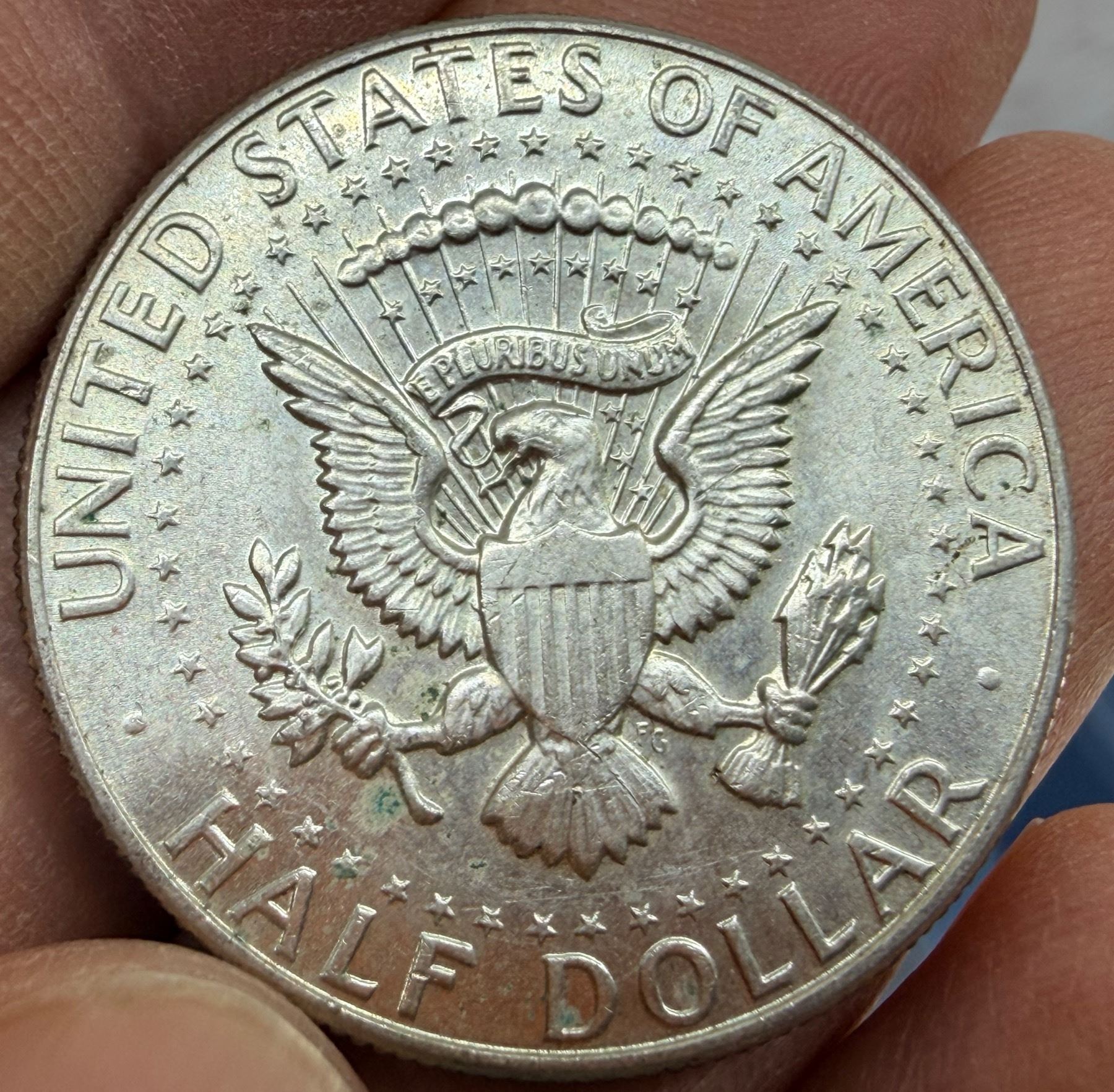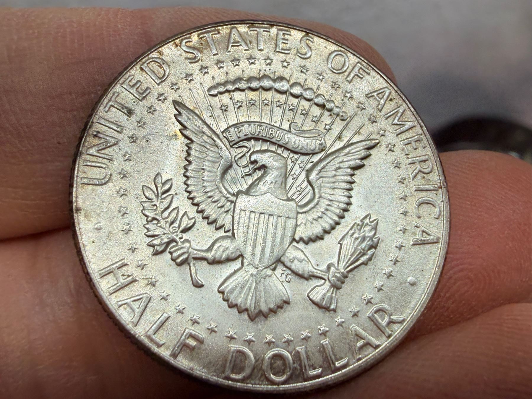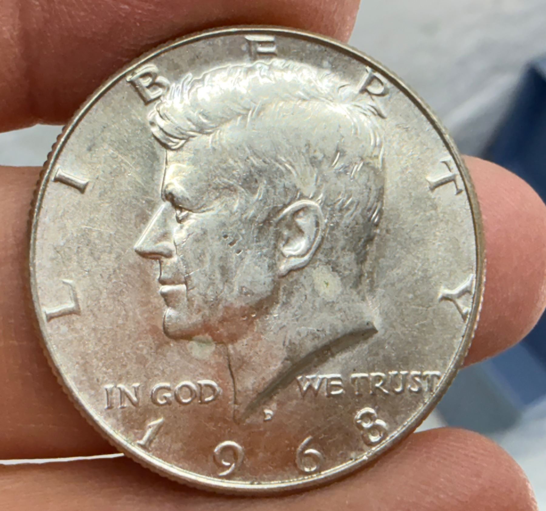 THE HALF DOLLAR DESIGNED CHANGED TO THE KENNEDY SILVER HALF DOLLAR IN 1964; THE 1964 KENNEDY HALF DOLLAR IS 90 PERCENT SILVER AND 10 PERCENT COPPER WITH A TOTAL WEIGHT OF 12.5 GRAMS, CONTAINS .36169 TROY OUNCE OF PURE SILVER; FROM 1965–1970, THE KENNEDY HALF DOLLAR IS 40 PERCENT SILVER AND 60 PERCENT COPPER WITH A TOTAL WEIGH OF 11.5 GRAMS AND CONTAINS .14779 TROY OUNCE OF PURE SILVER; THE KENNEDY HALF DOLLAR WAS ISSUED FROM 1964-PRESENT; THE 1964 MINT MARK IN ON THE REVERSE OF THE COIN, THERE WERE NO MINT MARKS ON ANY FROM 1965-1967, THE MINT MARKS ARE ON THE FRONT (OBVERSE) OF THE COIN FROM 1968-PRESENT