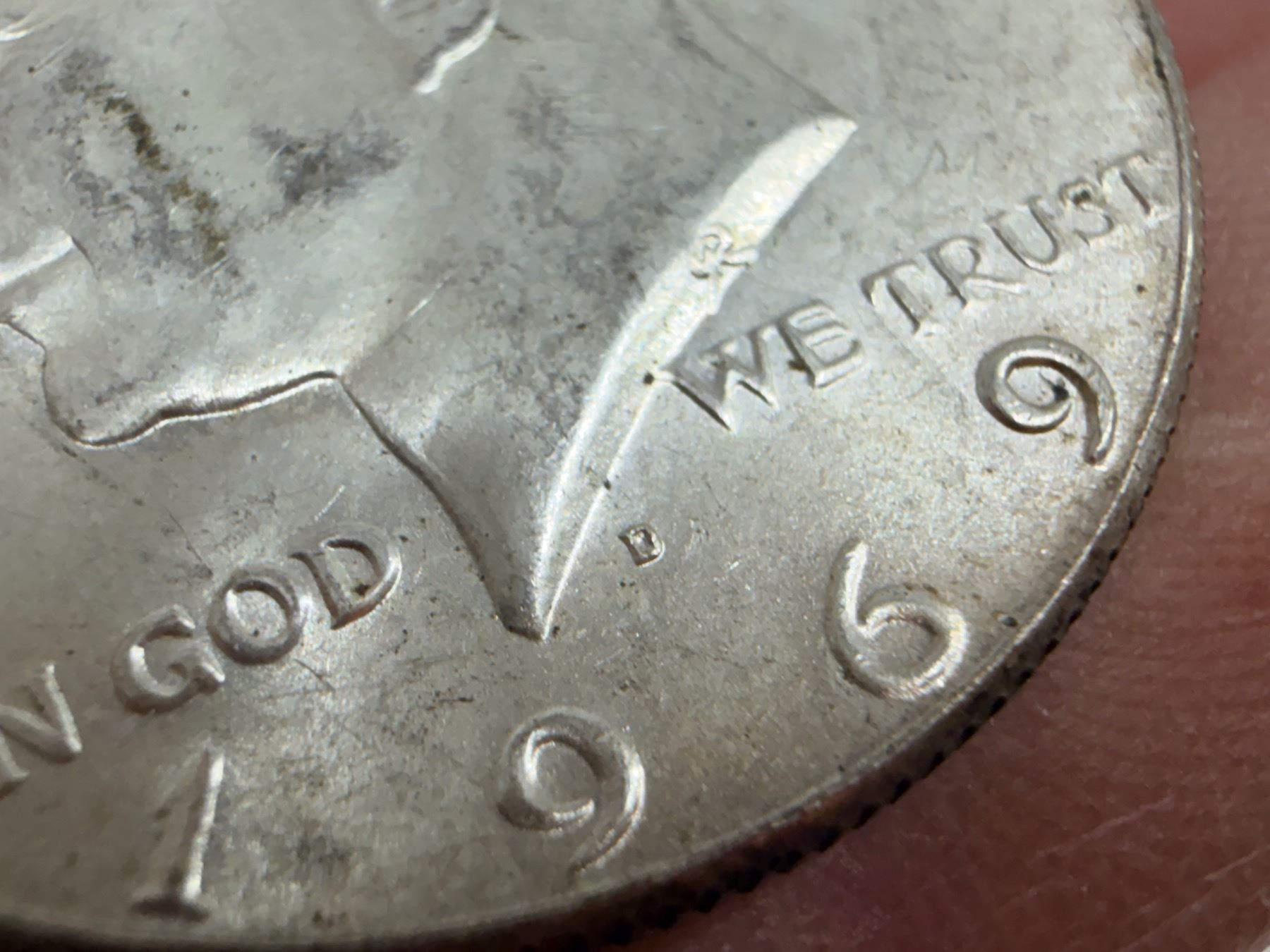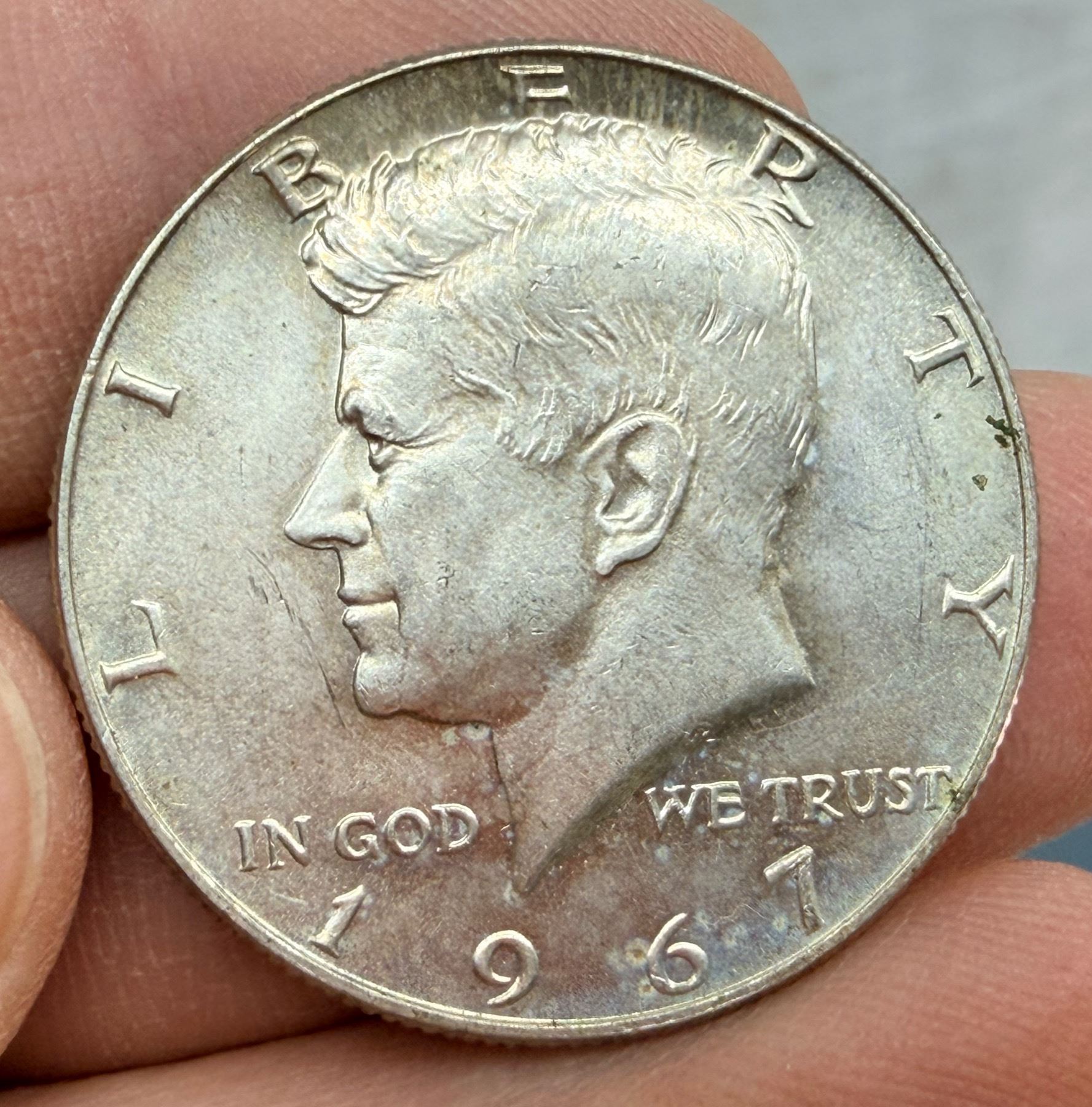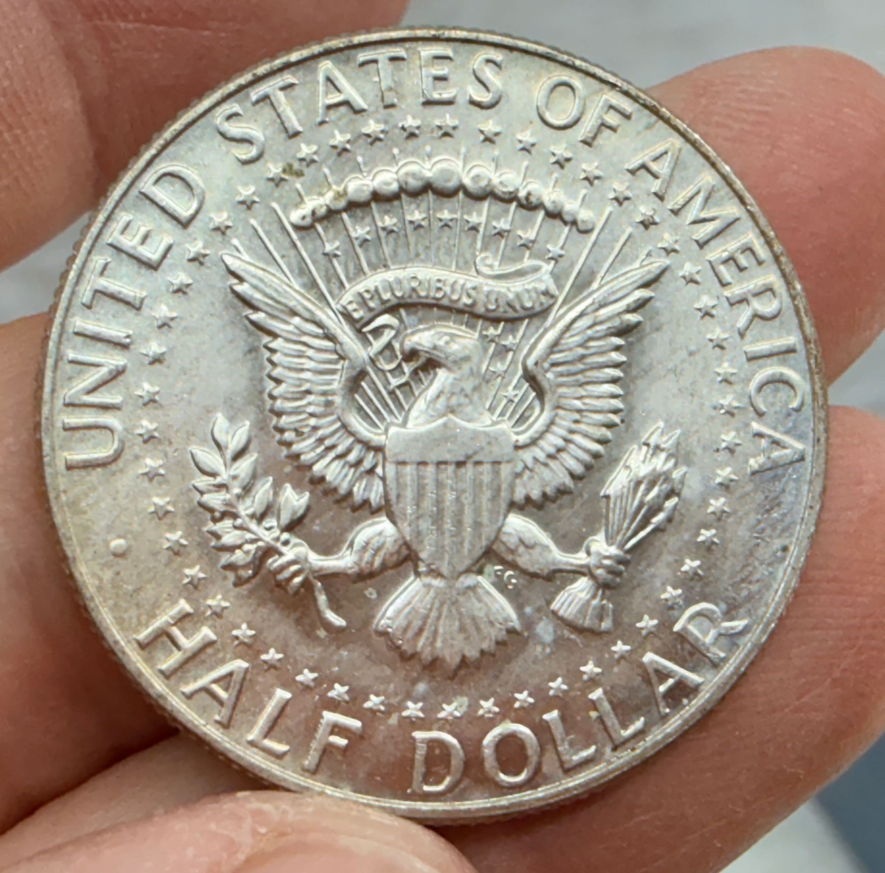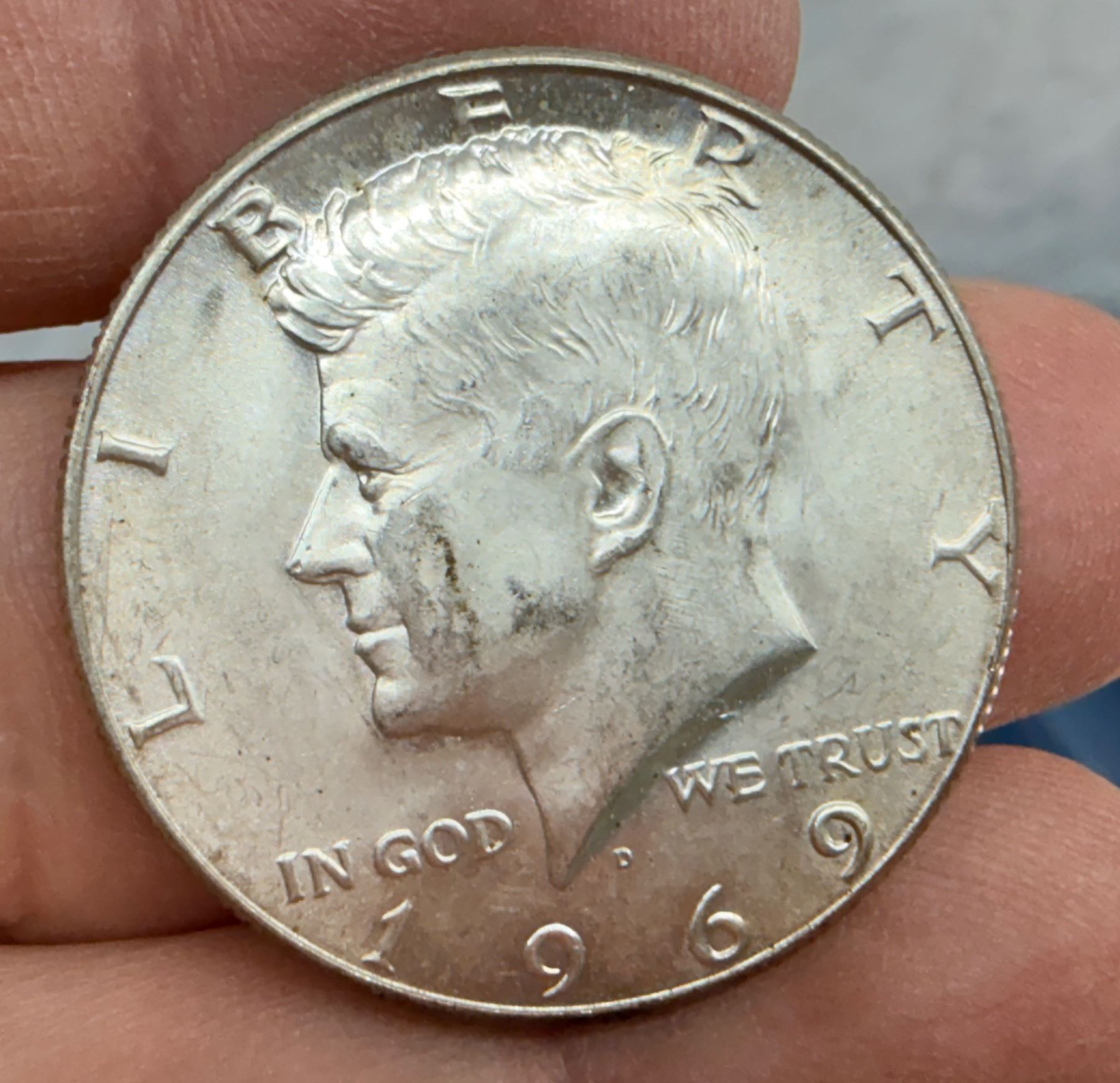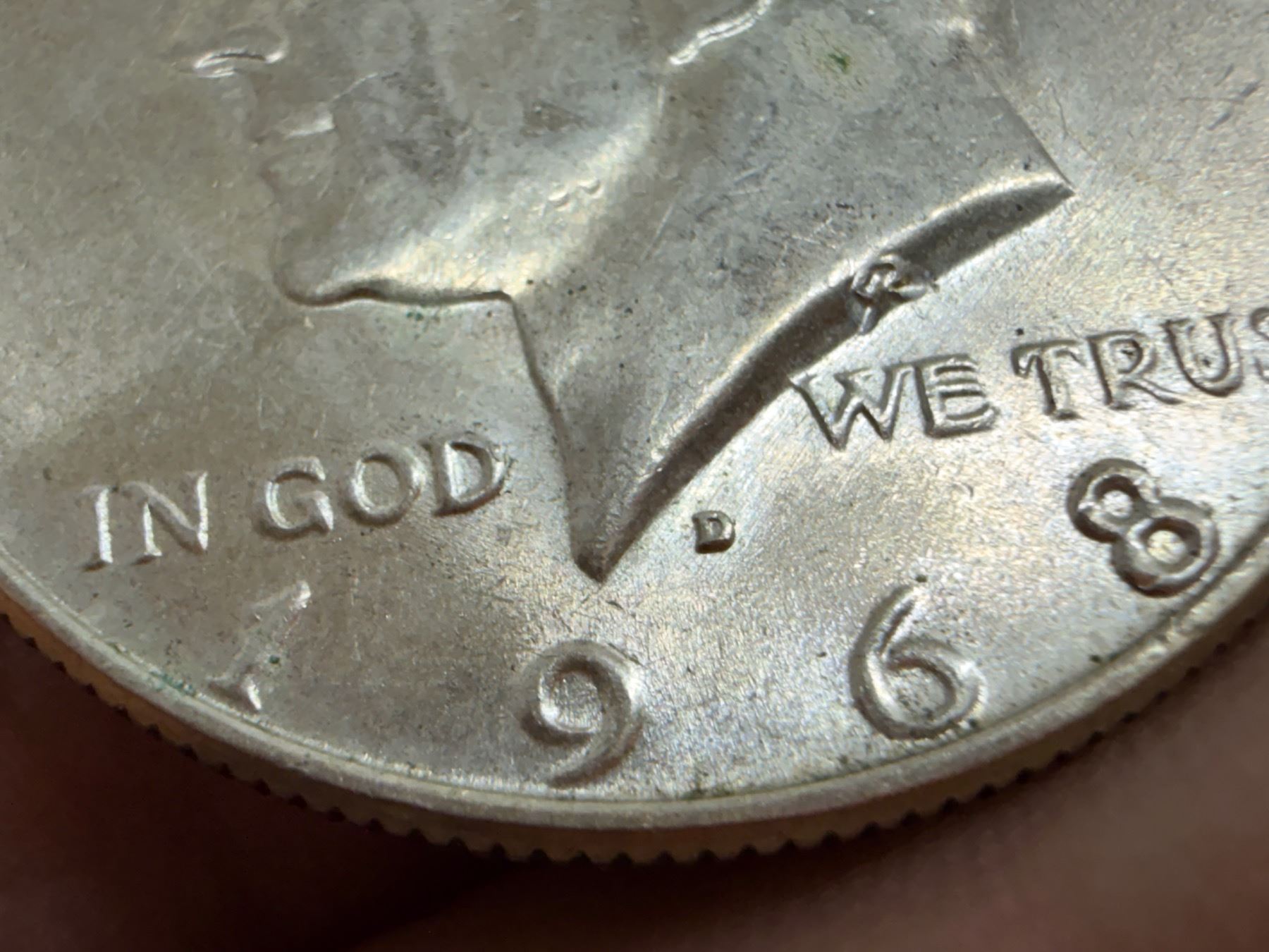 THE HALF DOLLAR DESIGNED CHANGED TO THE KENNEDY SILVER HALF DOLLAR IN 1964; THE 1964 KENNEDY HALF DOLLAR IS 90 PERCENT SILVER AND 10 PERCENT COPPER WITH A TOTAL WEIGHT OF 12.5 GRAMS, CONTAINS .36169 TROY OUNCE OF PURE SILVER; FROM 1965–1970, THE KENNEDY HALF DOLLAR IS 40 PERCENT SILVER AND 60 PERCENT COPPER WITH A TOTAL WEIGH OF 11.5 GRAMS AND CONTAINS .14779 TROY OUNCE OF PURE SILVER; THE KENNEDY HALF DOLLAR WAS ISSUED FROM 1964-PRESENT; THE 1964 MINT MARK IN ON THE REVERSE OF THE COIN, THERE WERE NO MINT MARKS ON ANY FROM 1965-1967, THE MINT MARKS ARE ON THE FRONT (OBVERSE) OF THE COIN FROM 1968-PRESENT