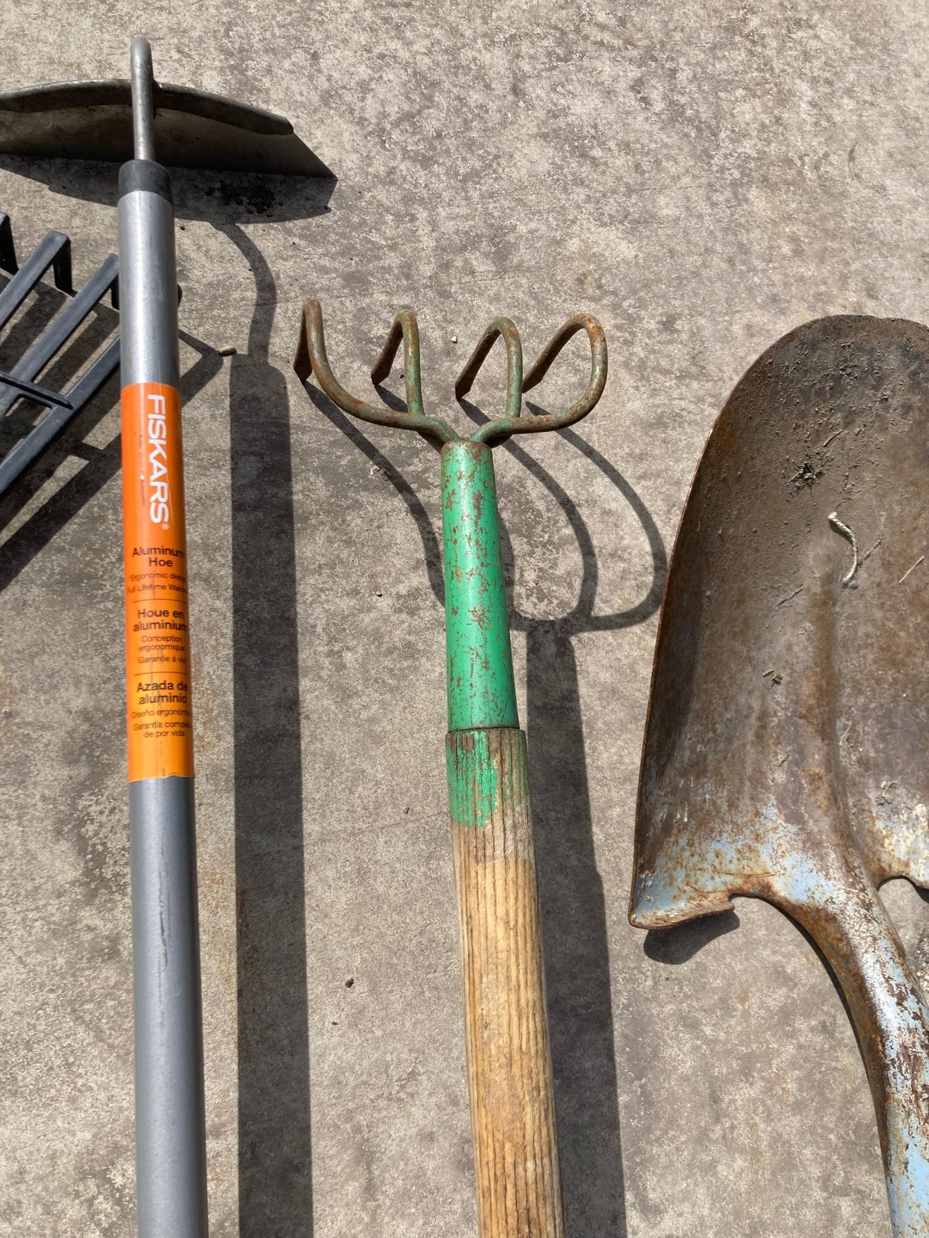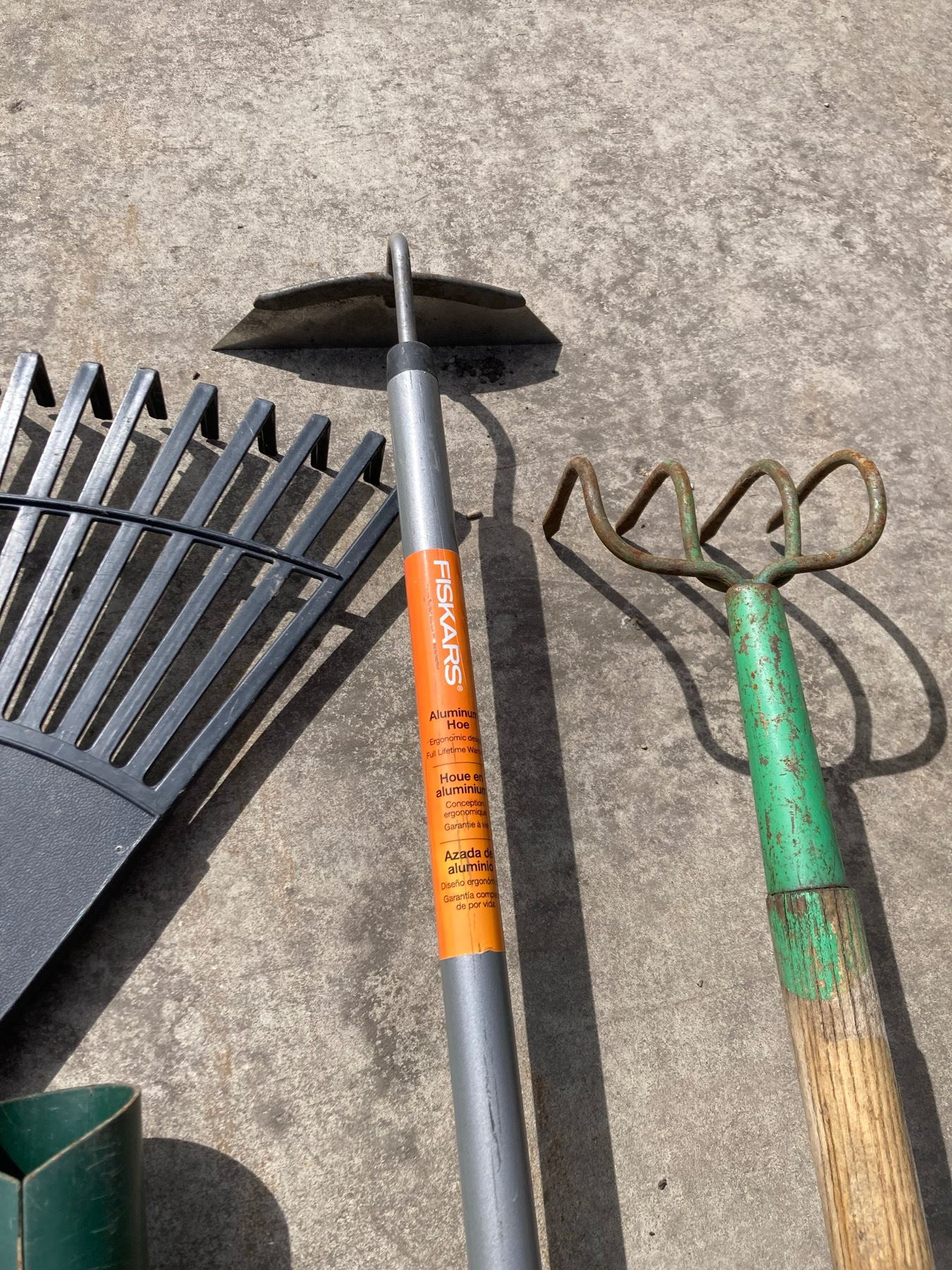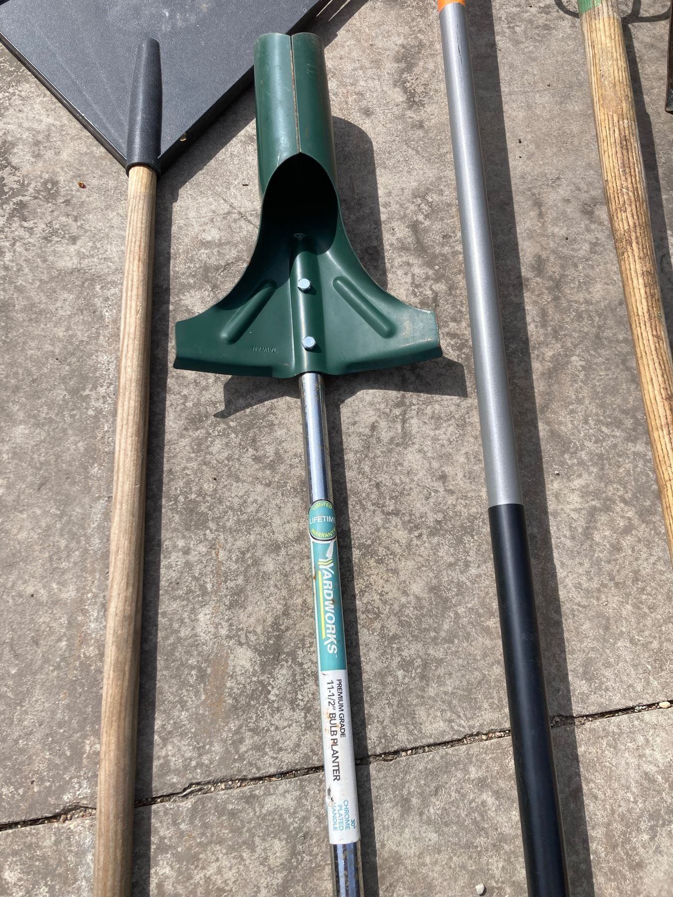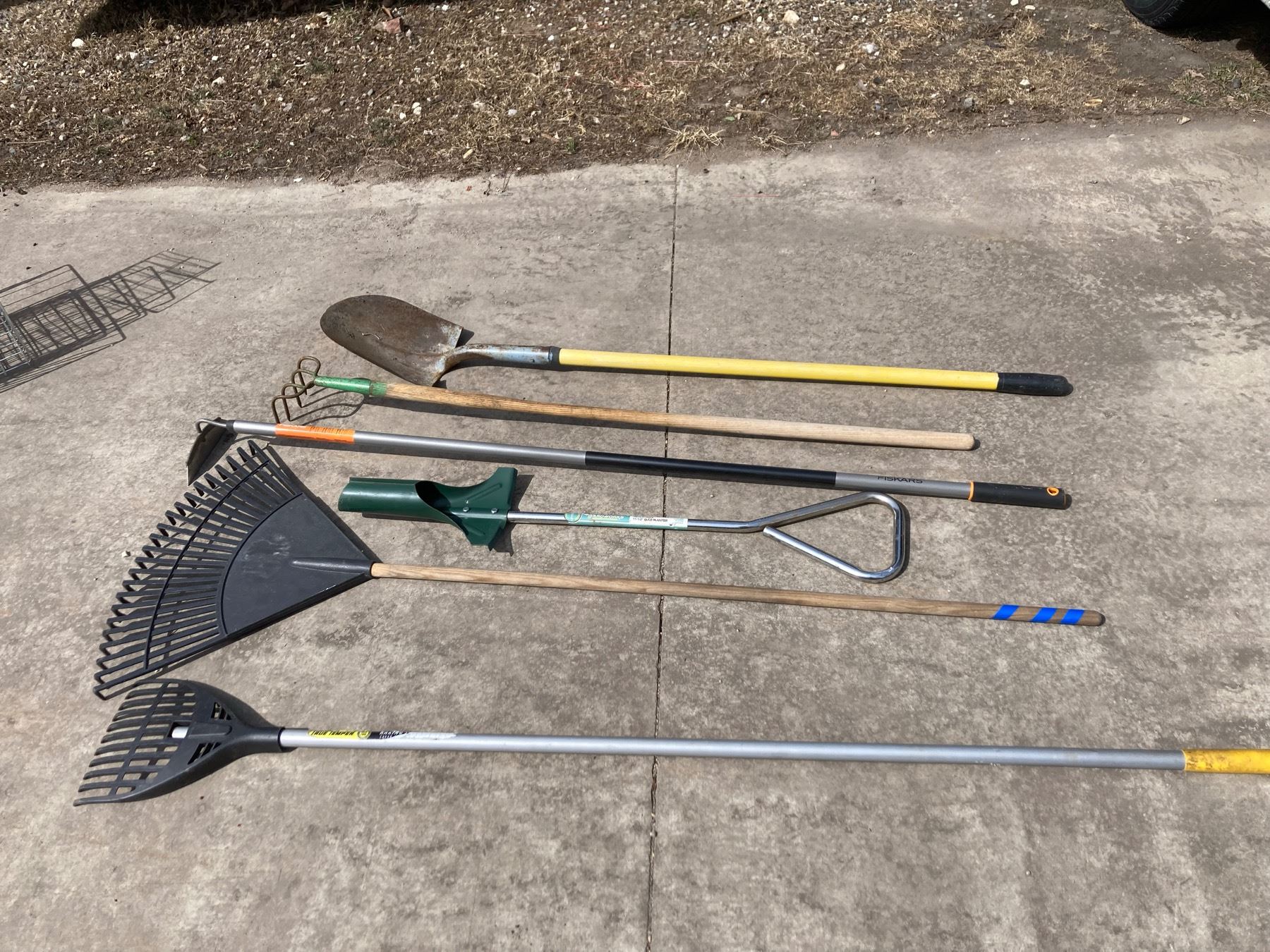 LAWN CARE LOT: RAKES, HOE, SHOVEL, AND BULB PLANTER