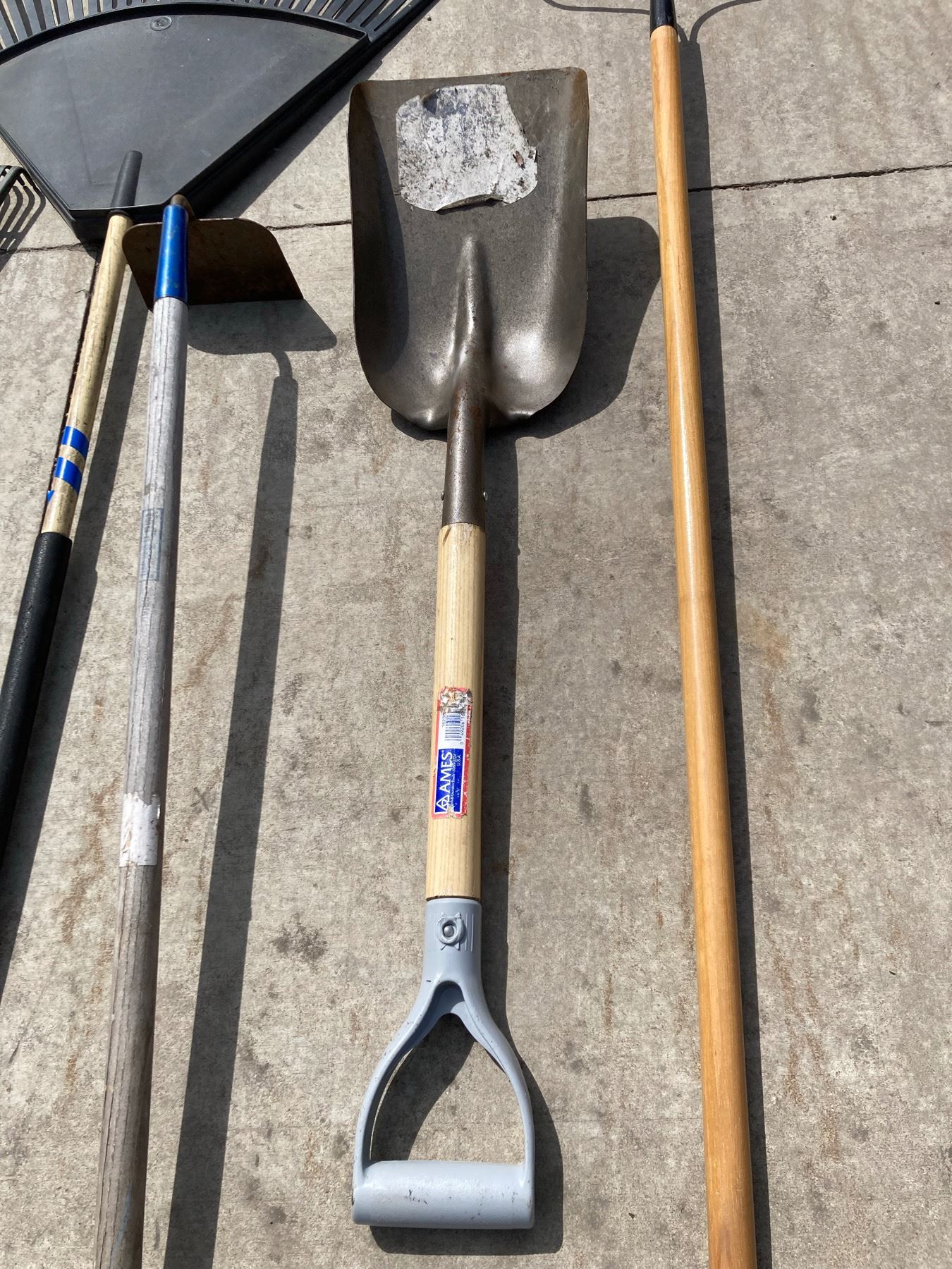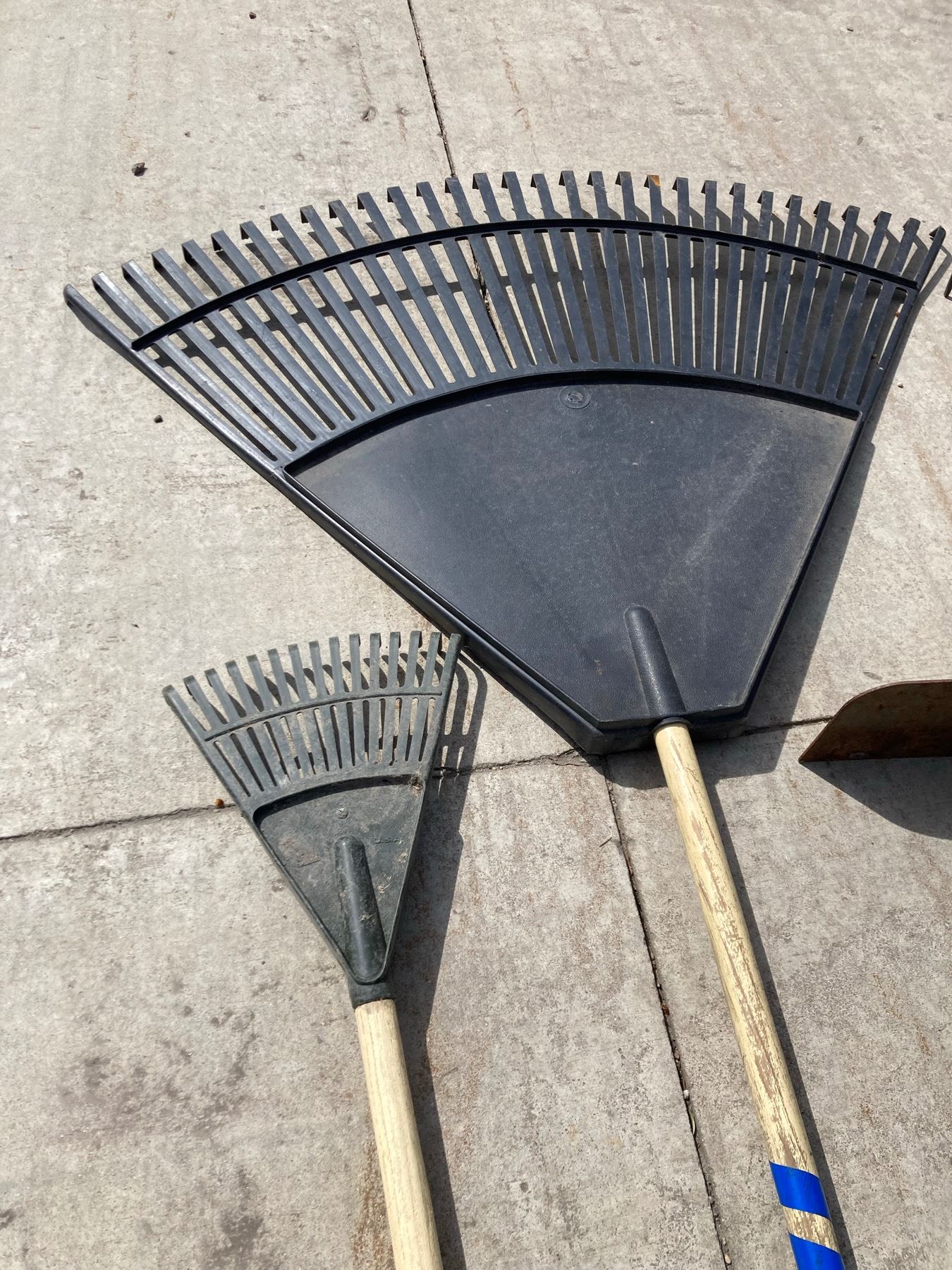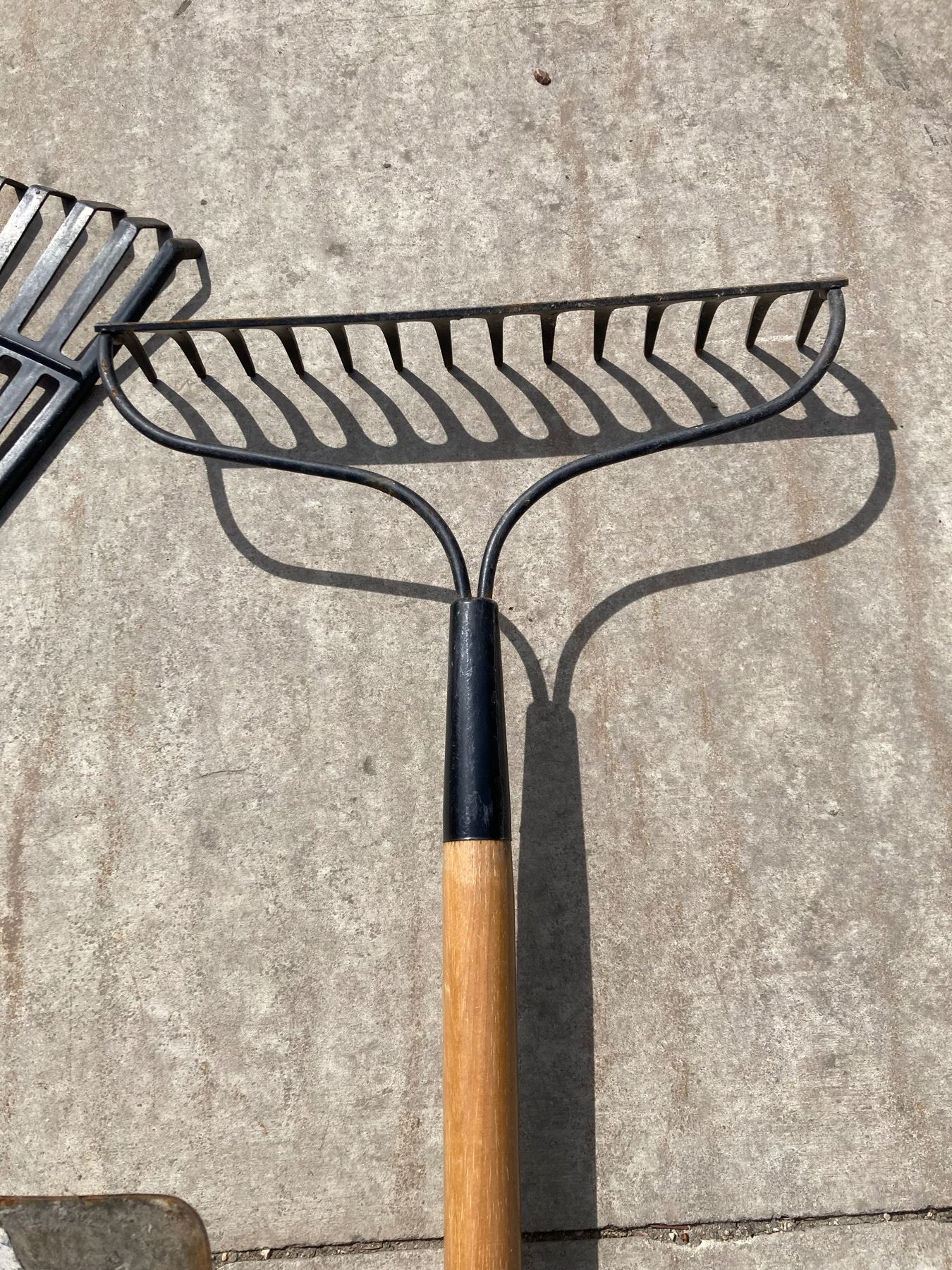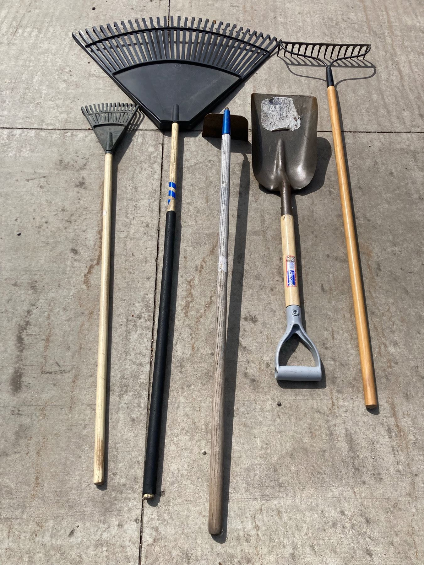 LAWN CARE LOT: RAKES, SHOVELS, AND HOE