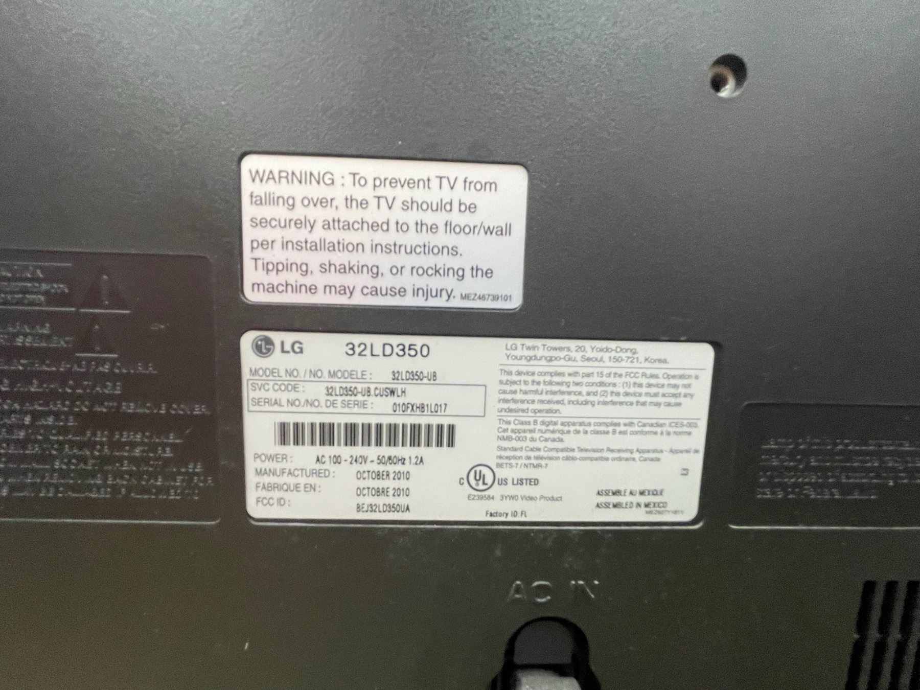 LG 32LD350; MODEL 32LD350-U8; S/N: 010FXHB1L017
