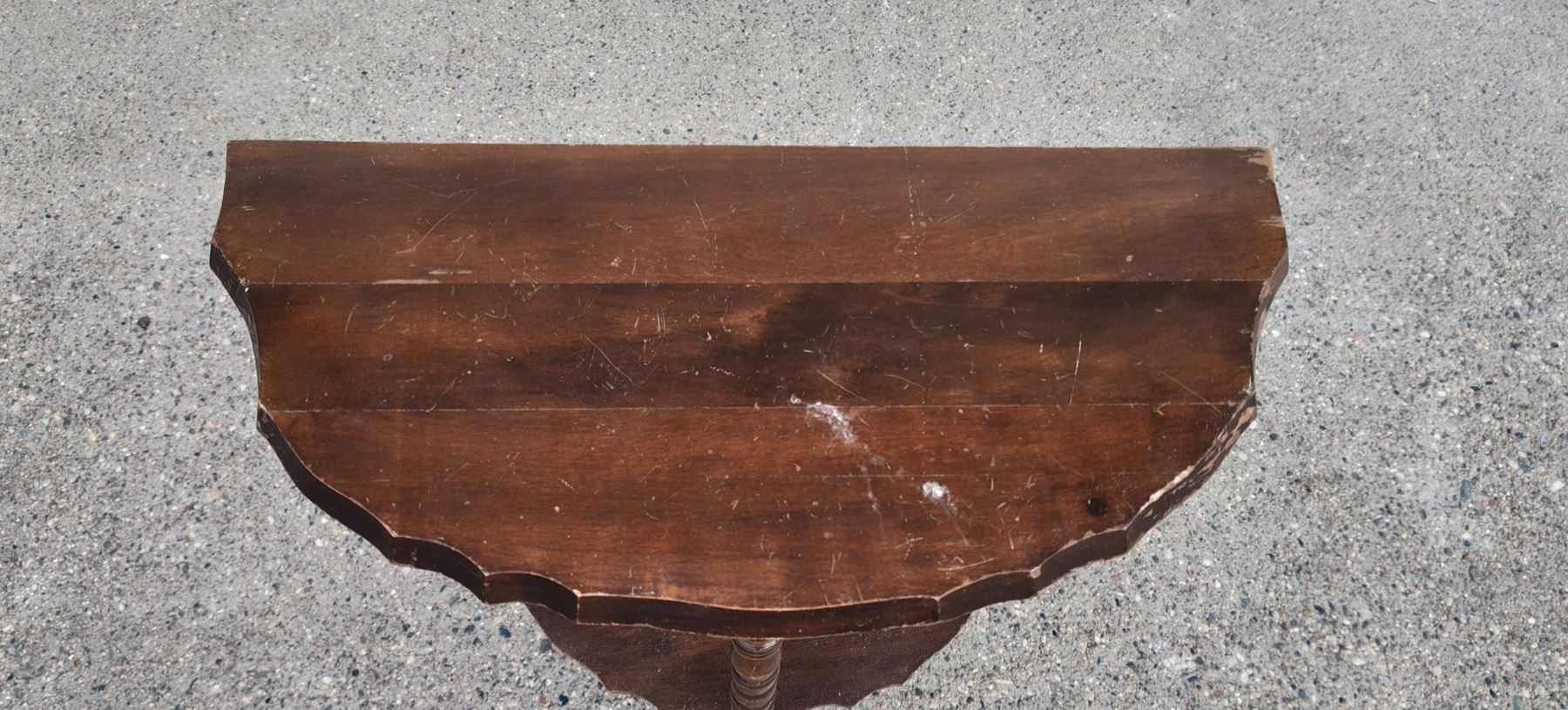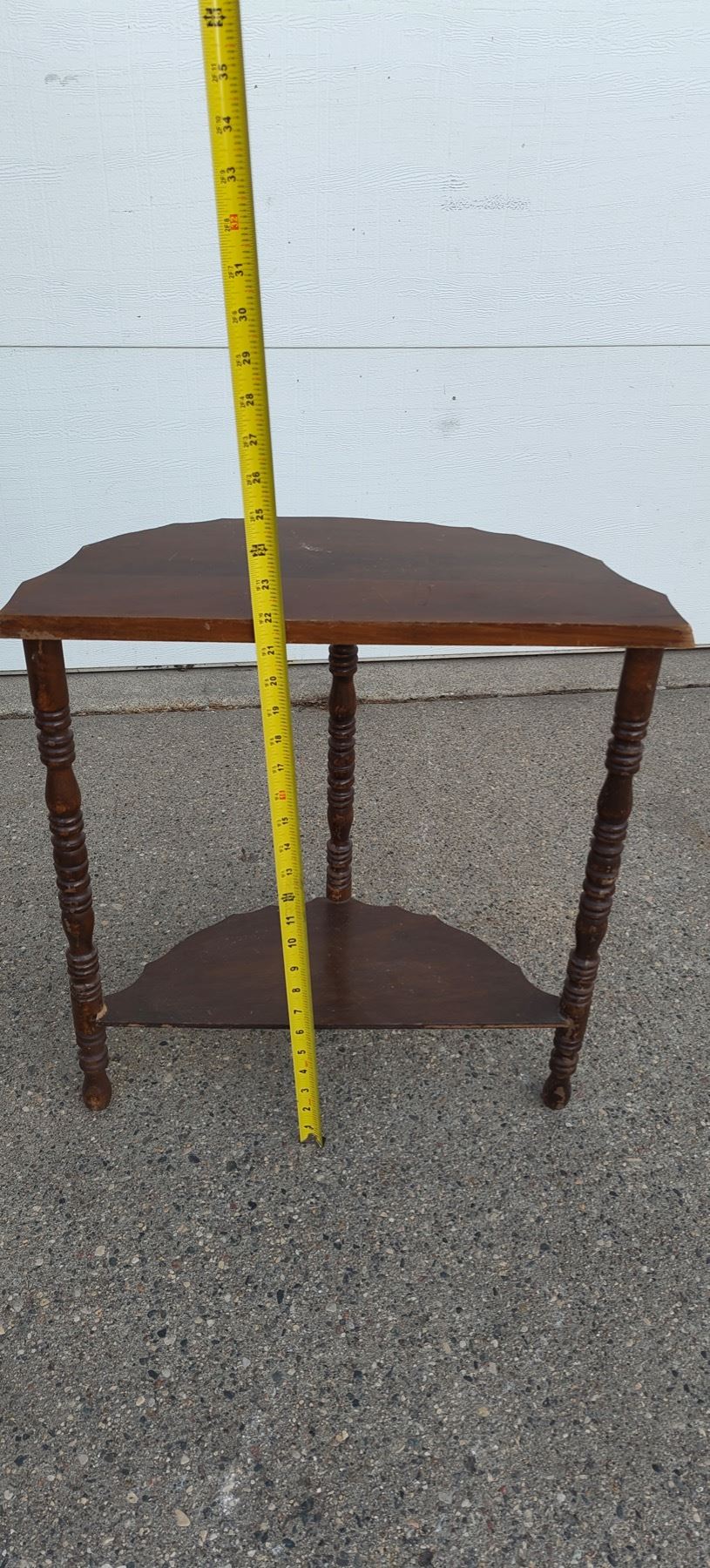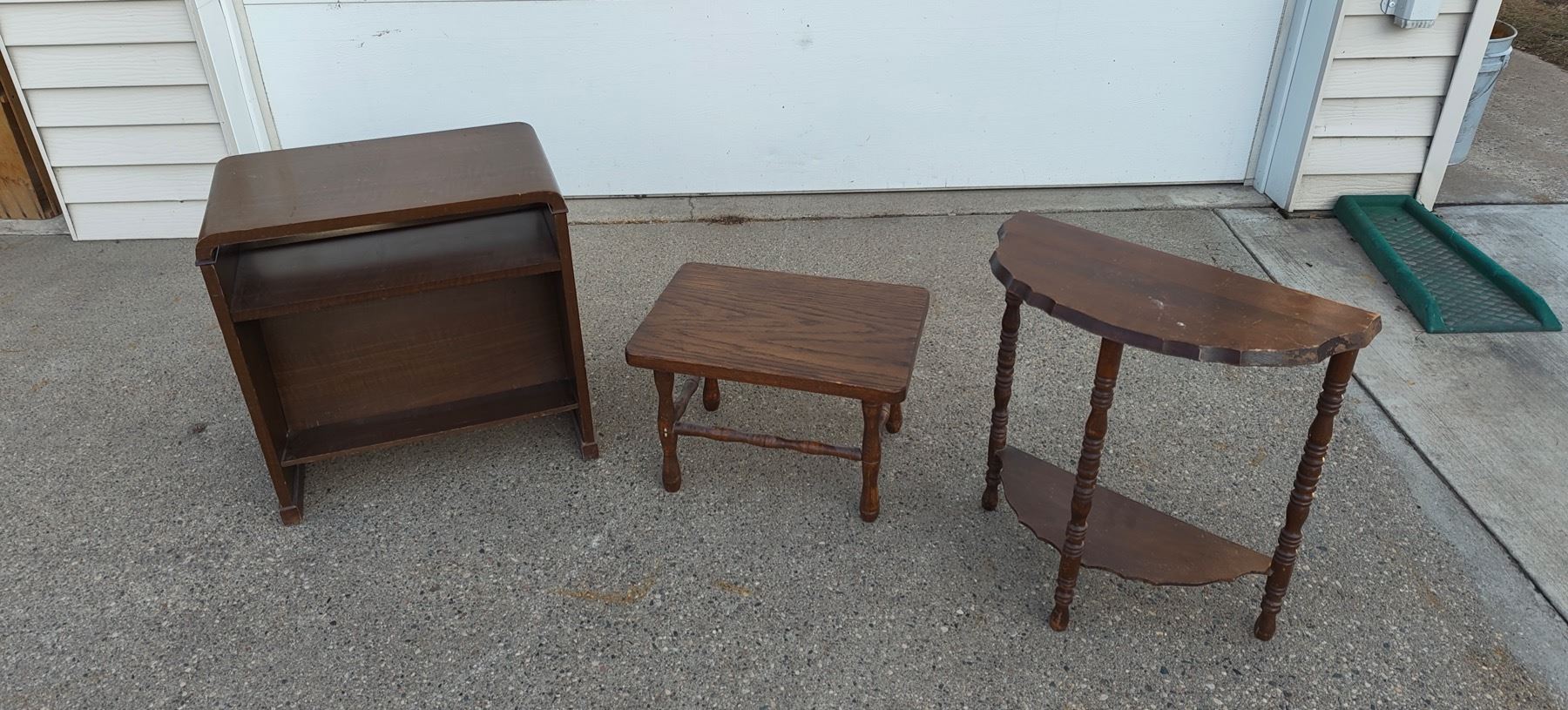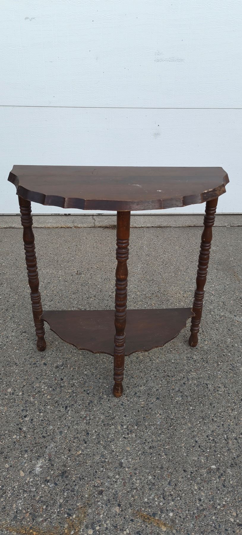 MID-CENTURY MODERN WALNUT NIGHTSTAND OR BEDSIDE TABLE; ANTIQUE AMERICAN OAK PARLOR SIDE TABLE WITH CARVED BOBBIN LEGS; ANTIQUE VICTORIAN-STYLE WOOD HALF-CIRCLE CONSOLE TABLE WITH A LOWER SHELF AND TURNED LEGS