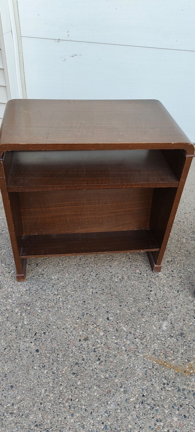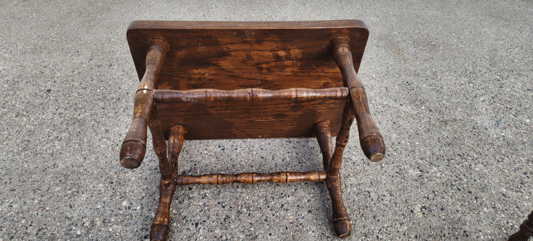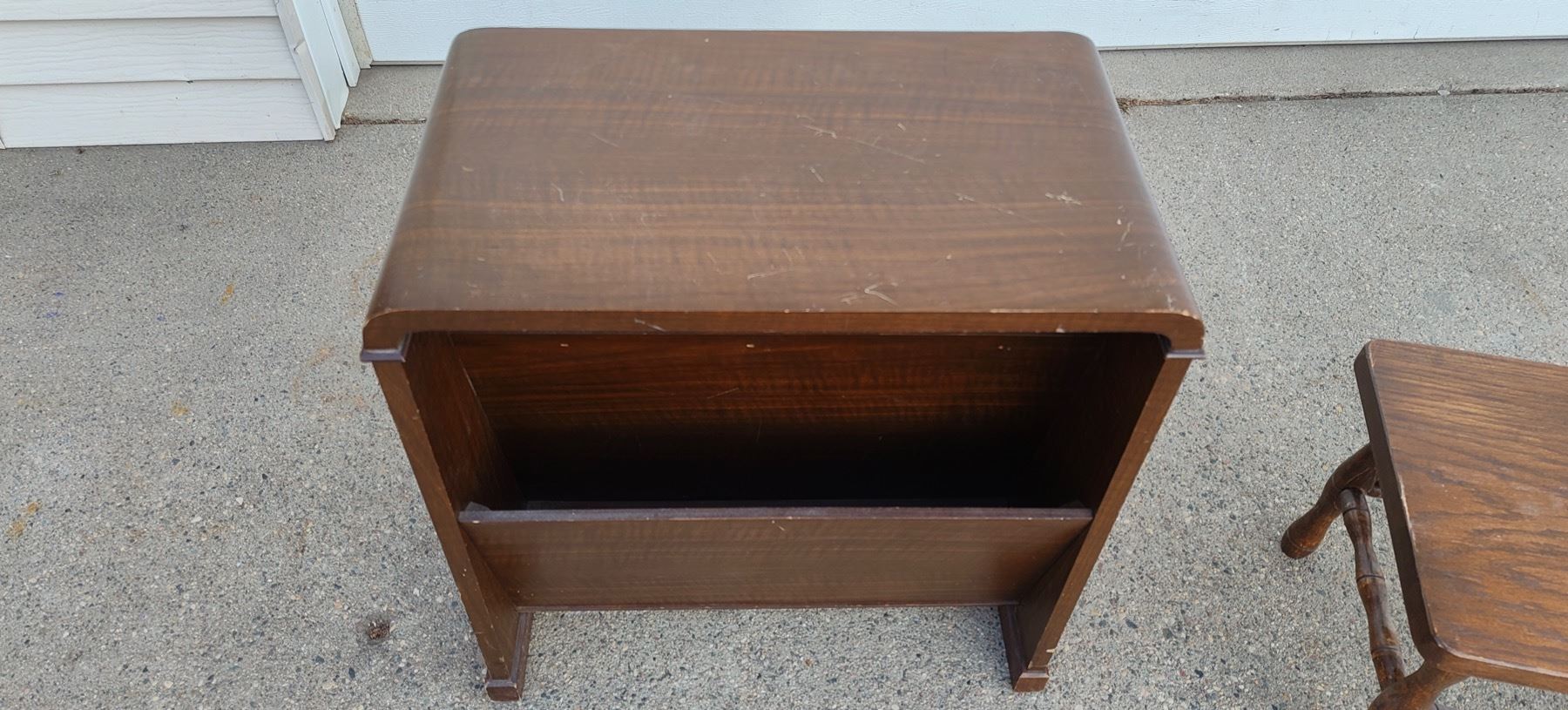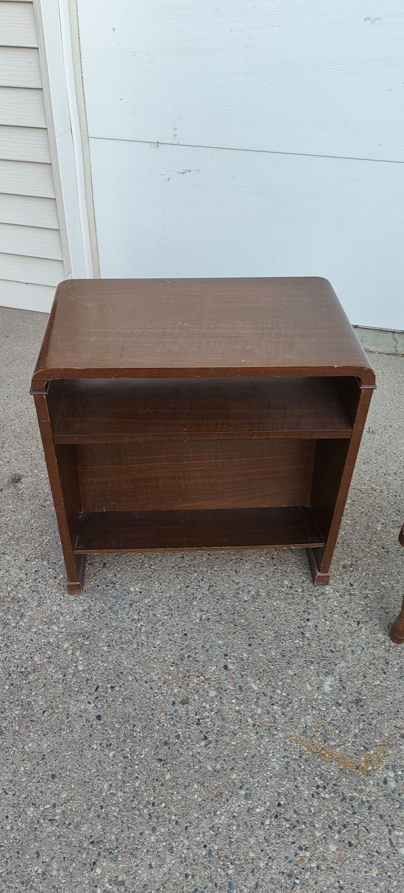 MID-CENTURY MODERN WALNUT NIGHTSTAND OR BEDSIDE TABLE; ANTIQUE AMERICAN OAK PARLOR SIDE TABLE WITH CARVED BOBBIN LEGS; ANTIQUE VICTORIAN-STYLE WOOD HALF-CIRCLE CONSOLE TABLE WITH A LOWER SHELF AND TURNED LEGS