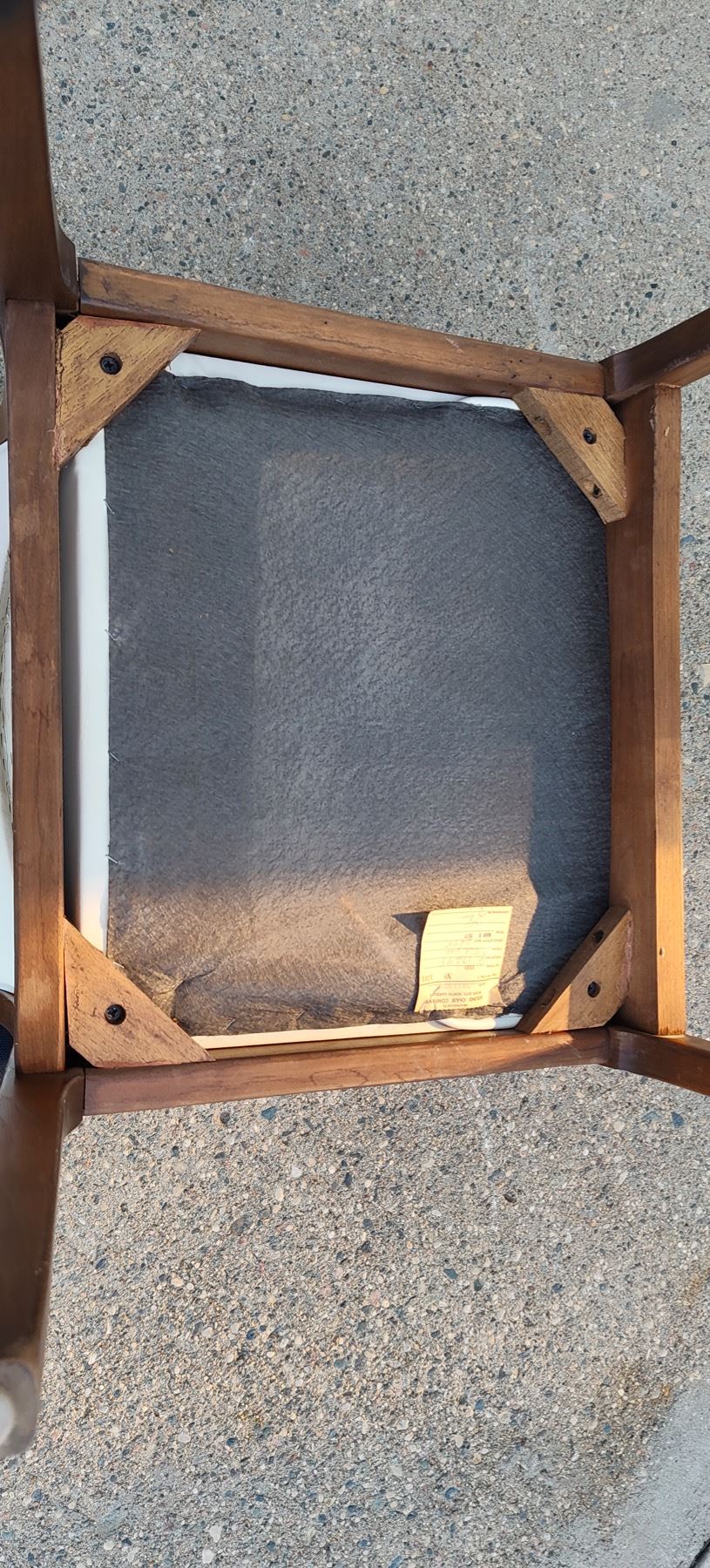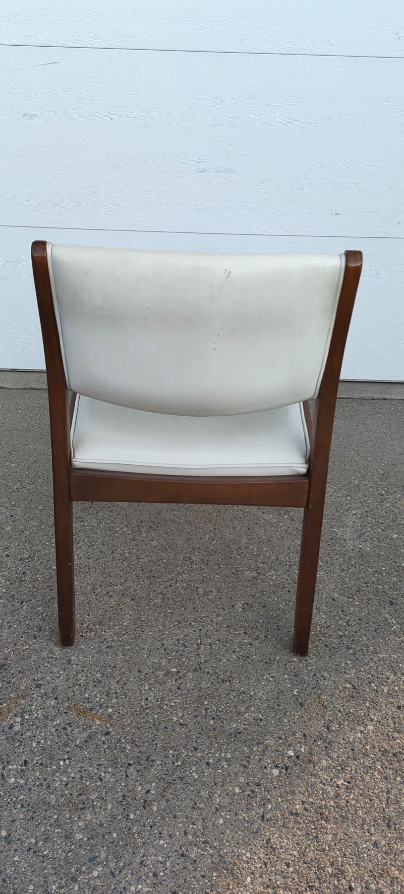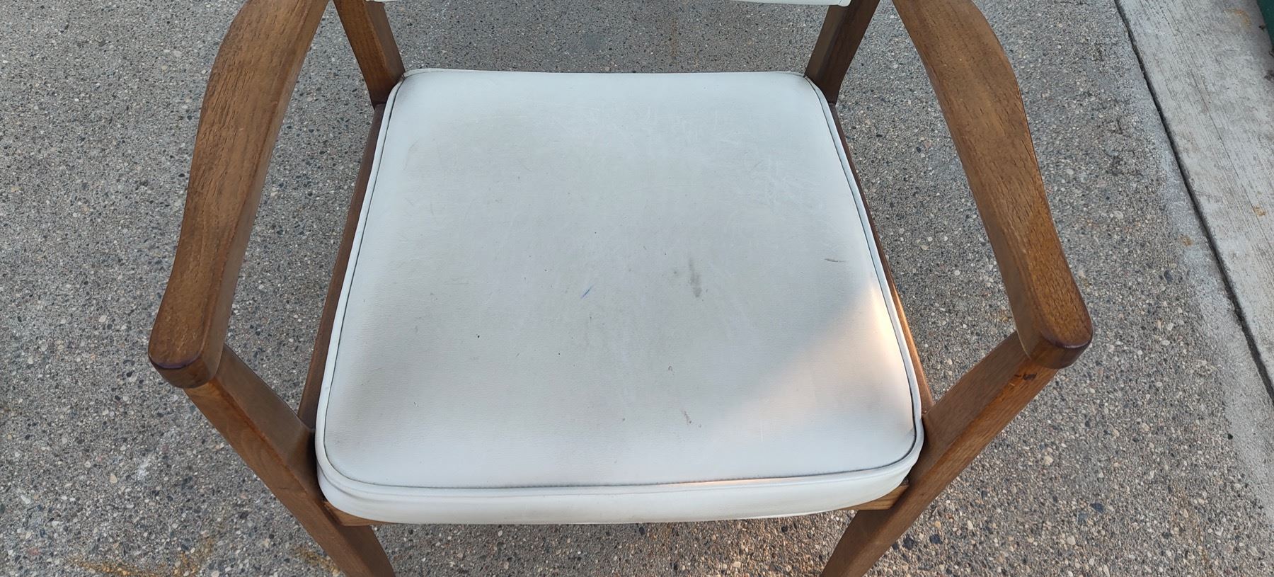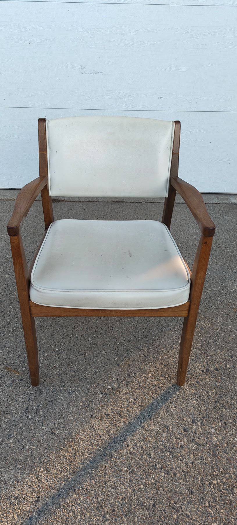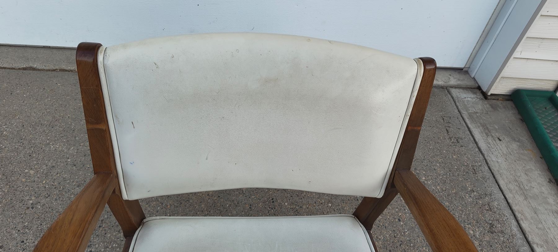 WALNUT FRAME OFFICE ARMCHAIR WITH WHITE NAUGAHYDE UPHOLSTERY