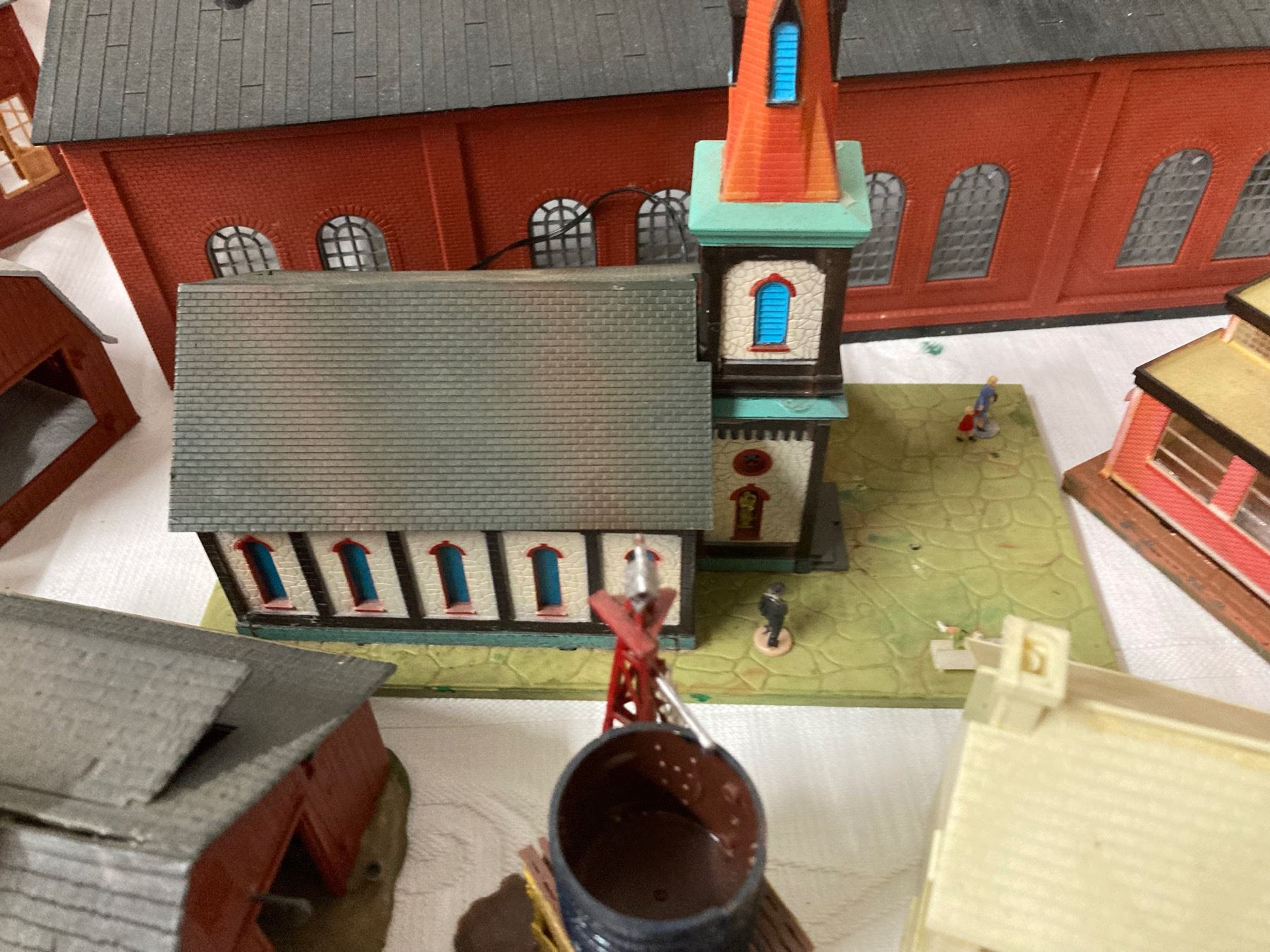 INCLUDES INDUSTRIAL BUILDINGS LIKE ENGINE HOUSES AND A LARGE FACTORY, ALONGSIDE COMMERCIAL STRUCTURES SUCH AS A STATION, A CHURCH, AND A WATER TOWER