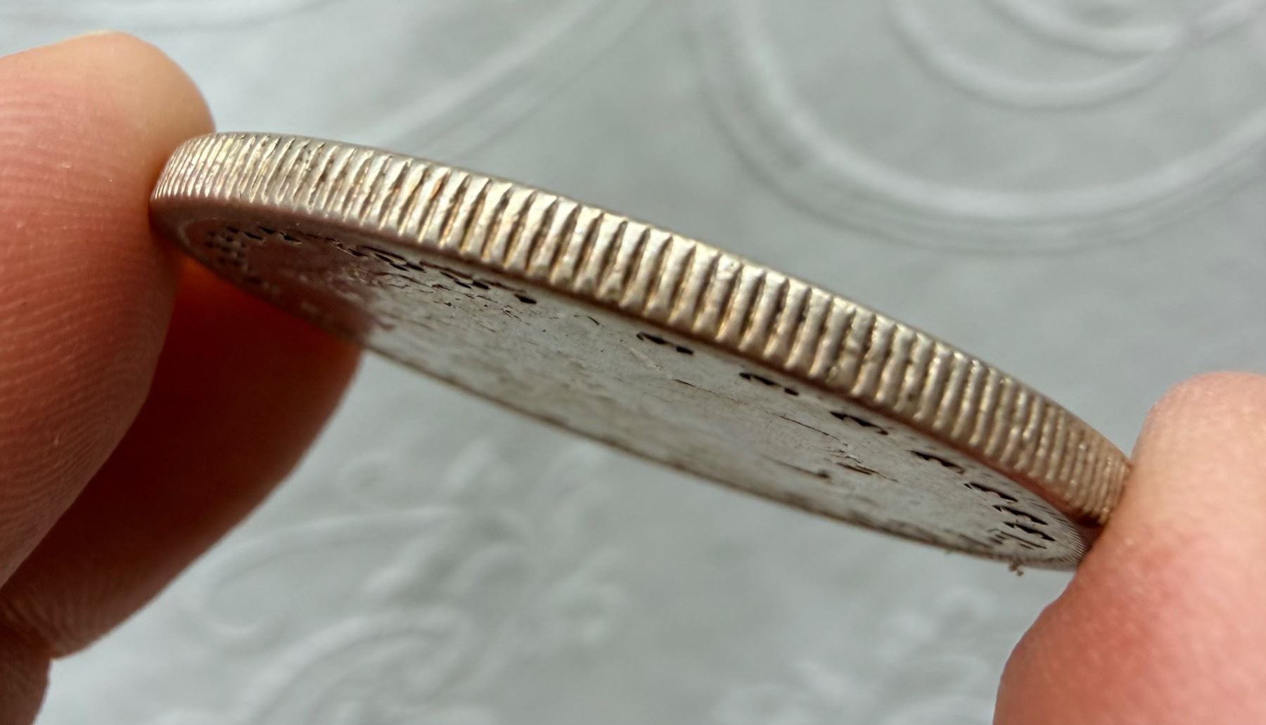 THE MORGAN SILVER DOLLAR IS 90 PERCENT SILVER AND 10 PERCENT COPPER WITH A TOTAL WEIGHT OF 26.73 GRAMS CONTAINS 0.77344 TROY OUNCES OF PURE SILVER AND WAS MINTED FROM 1878-1904 AND 1921