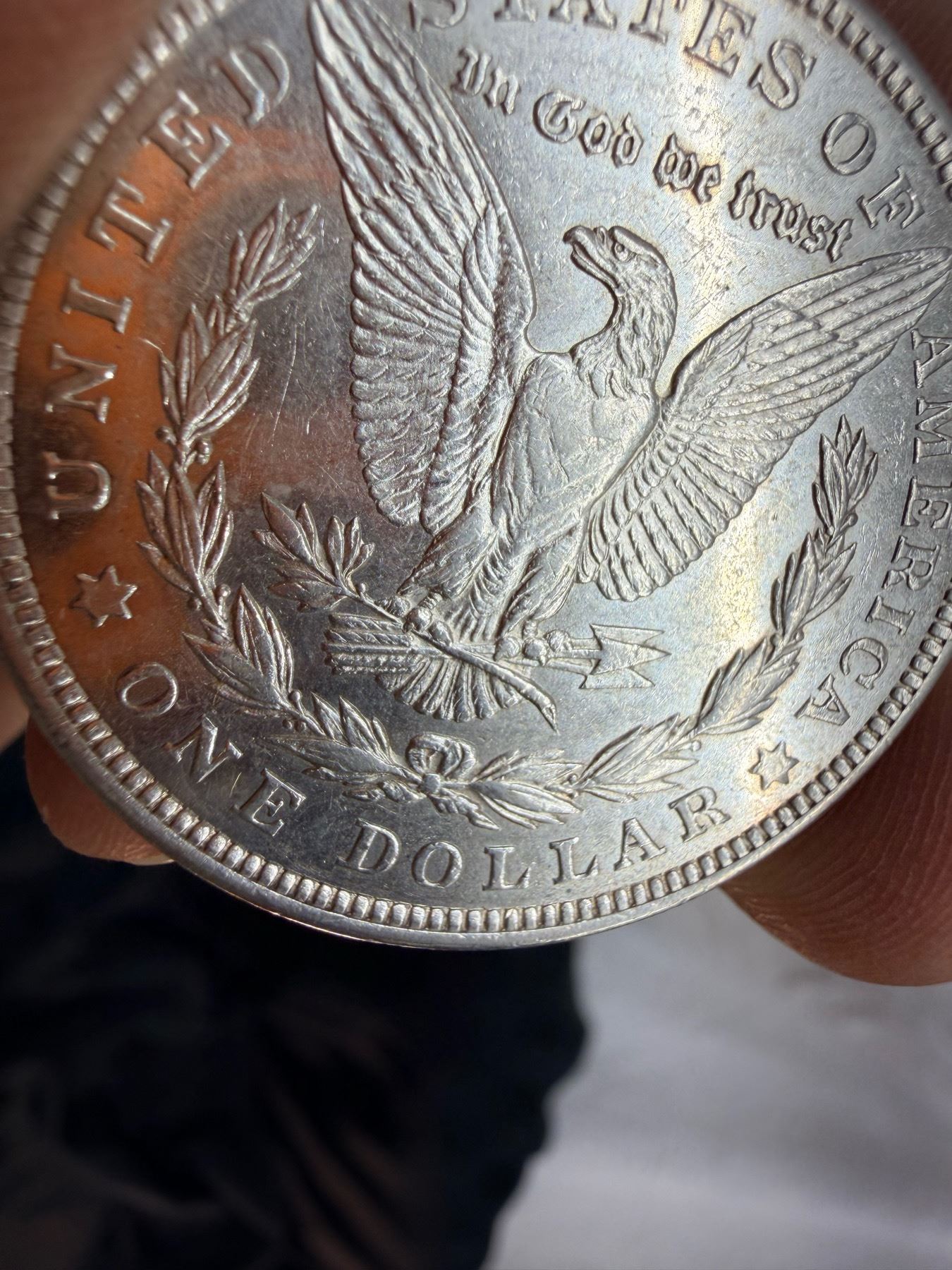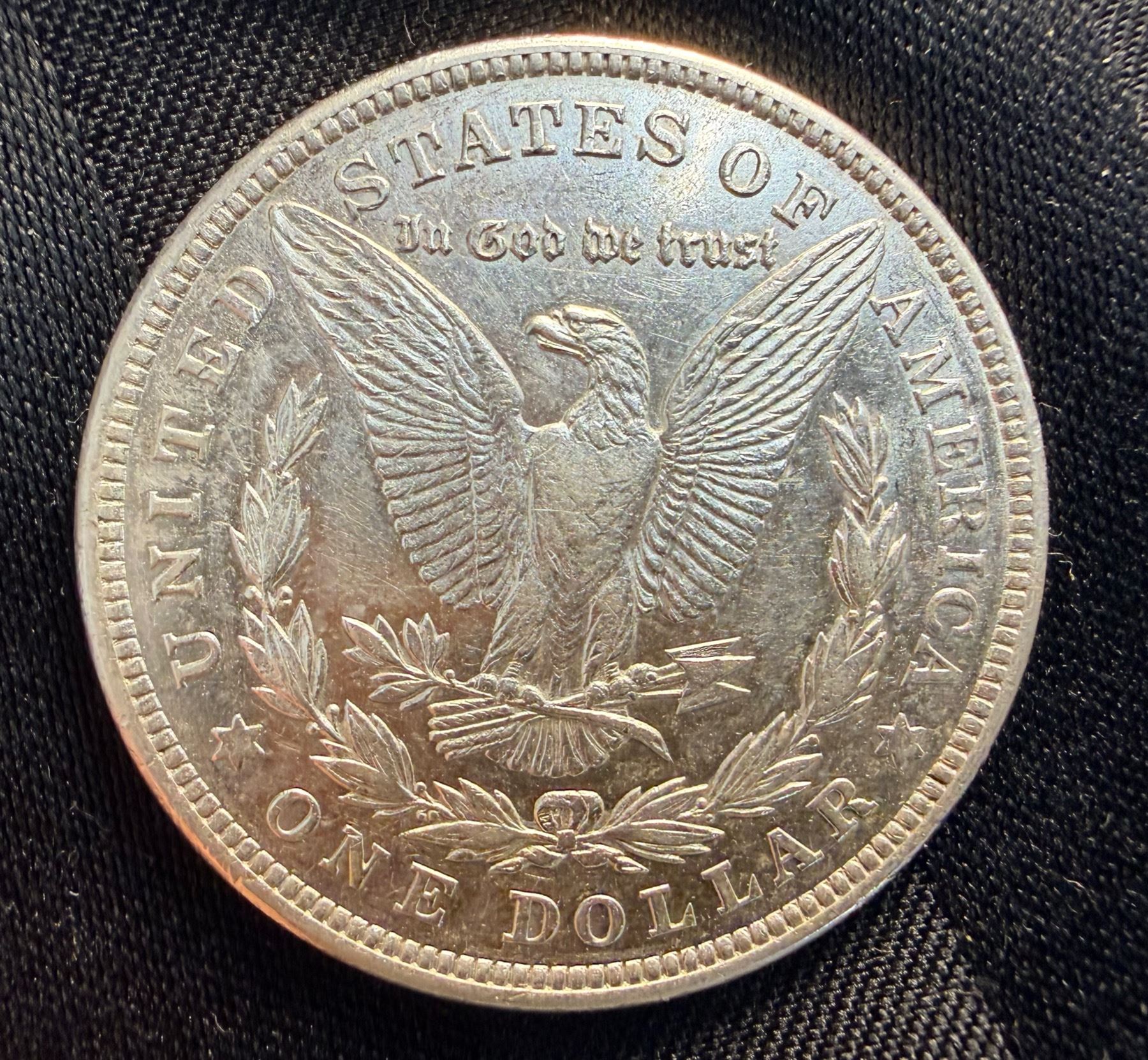 THE MORGAN SILVER DOLLAR IS 90 PERCENT SILVER AND 10 PERCENT COPPER WITH A TOTAL WEIGHT OF 26.73 GRAMS CONTAINS 0.77344 TROY OUNCES OF PURE SILVER AND WAS MINTED FROM 1878-1904 AND 1921